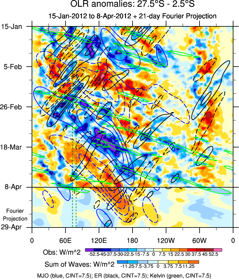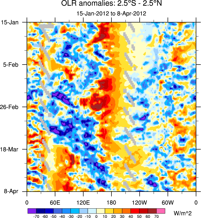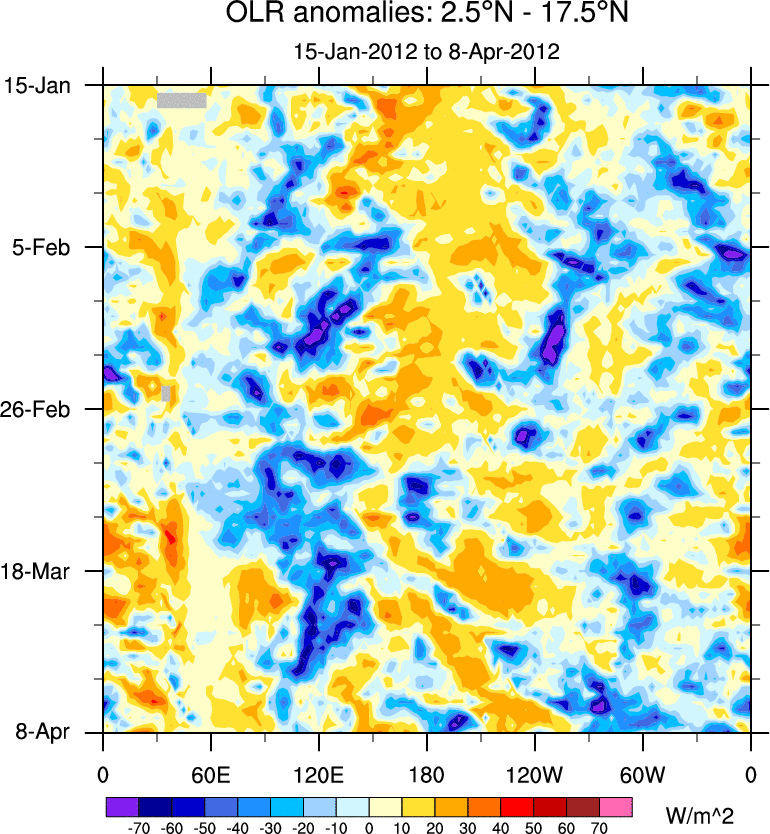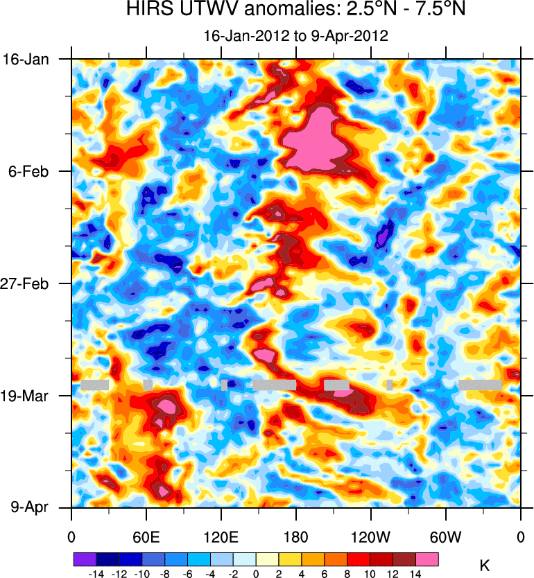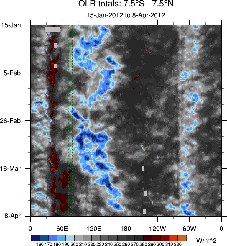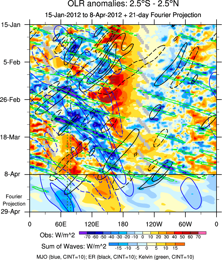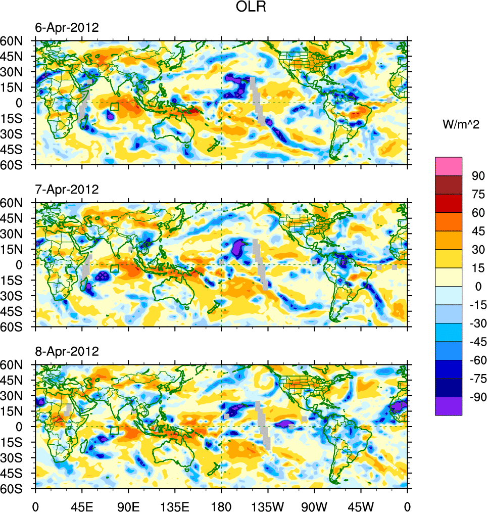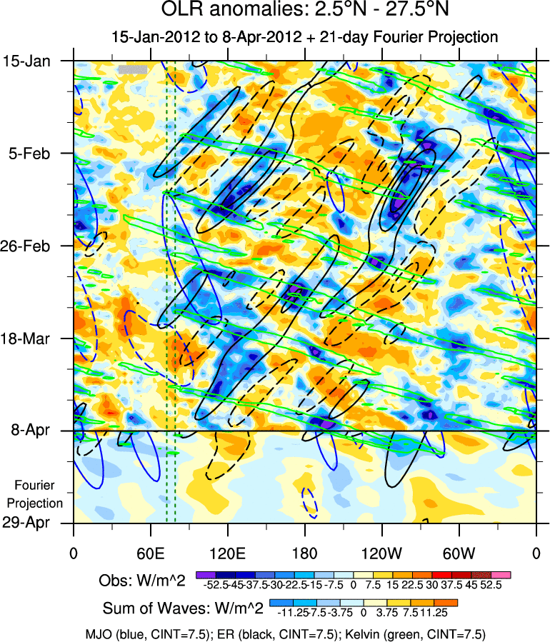 To identify tropical waves in near real-time, the OLR and UTWV data are filtered following Wheeler & Weickmann (2001 MWR). The daily anomalies are calculated using the first 3 harmonics of the seasonal cycle for 1979–2009. Missing values are then filled using linear interpolation in space and time. The most recent 365 days of anomalies are padded with 659 days of zeroes, and the result is filtered for each wave type.