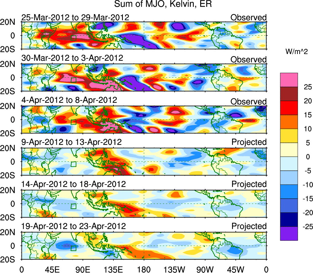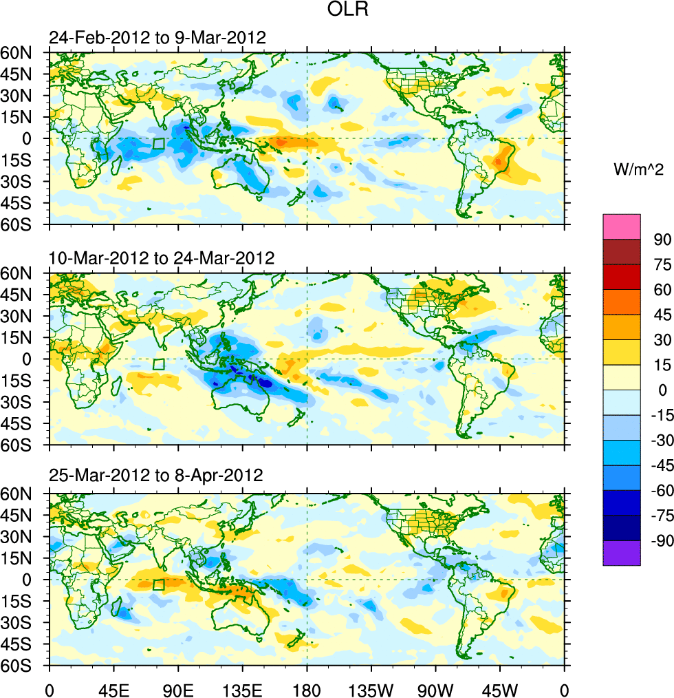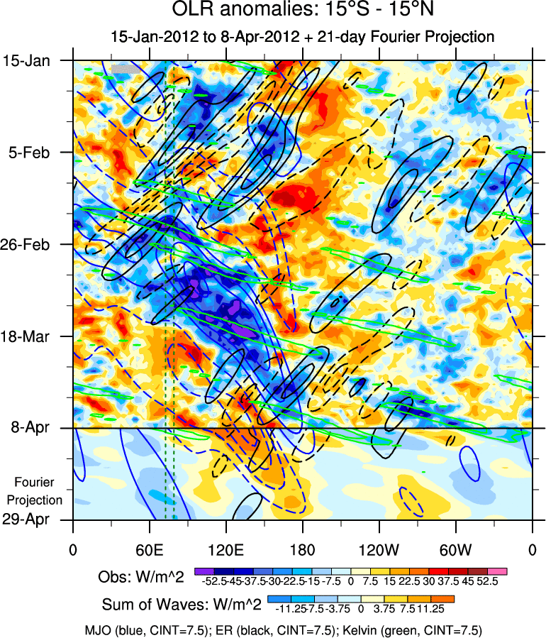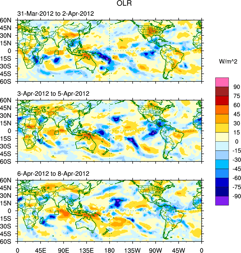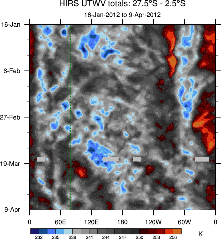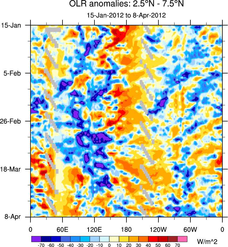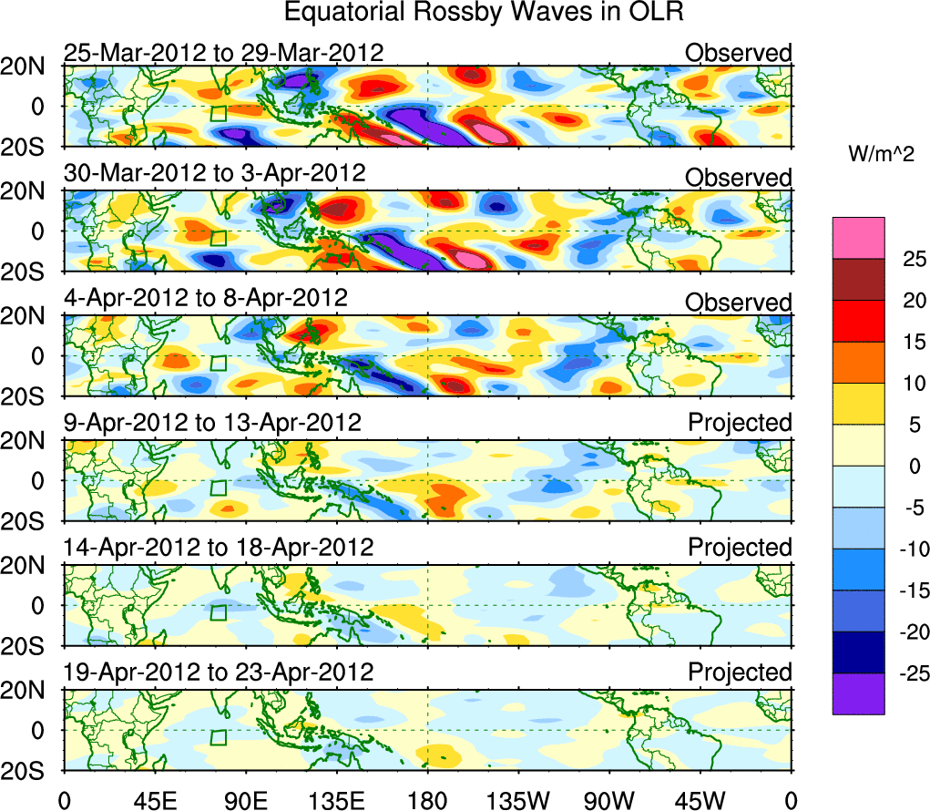 To identify tropical waves in near real-time, the OLR and UTWV data are filtered following Wheeler & Weickmann (2001 MWR). The daily anomalies are calculated using the first 3 harmonics of the seasonal cycle for 1979–2009. Missing values are then filled using linear interpolation in space and time. The most recent 365 days of anomalies are padded with 659 days of zeroes, and the result is filtered for each wave type.