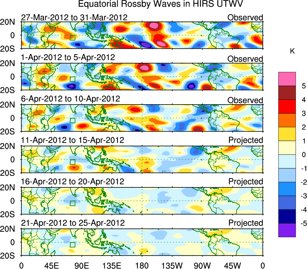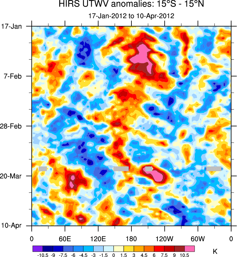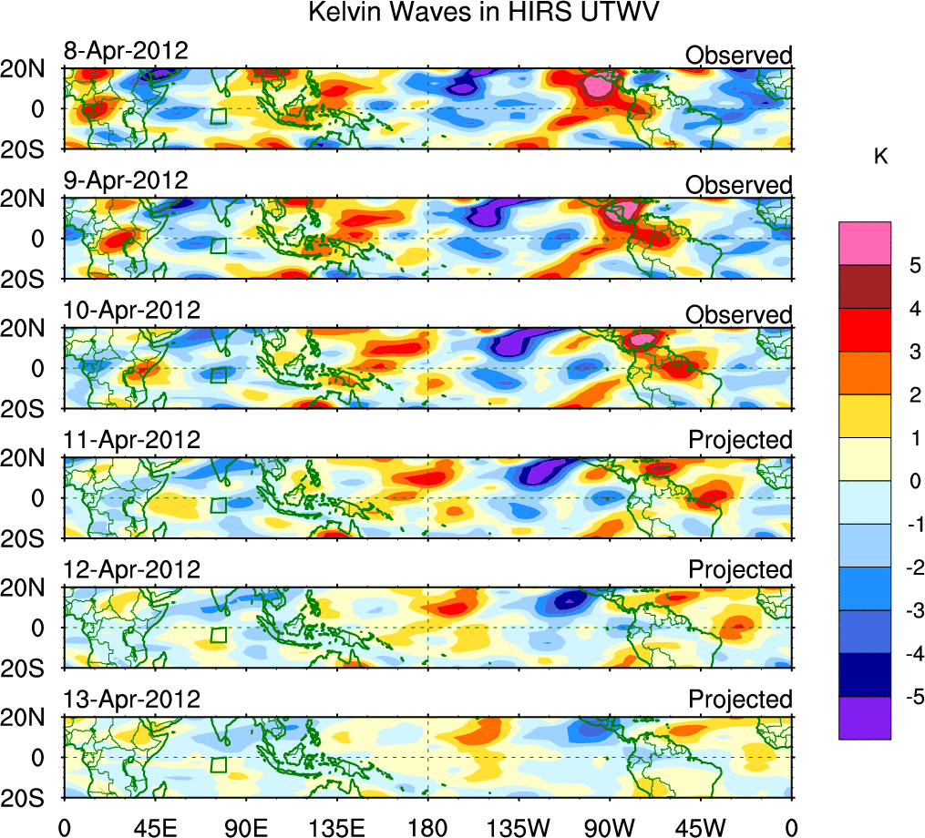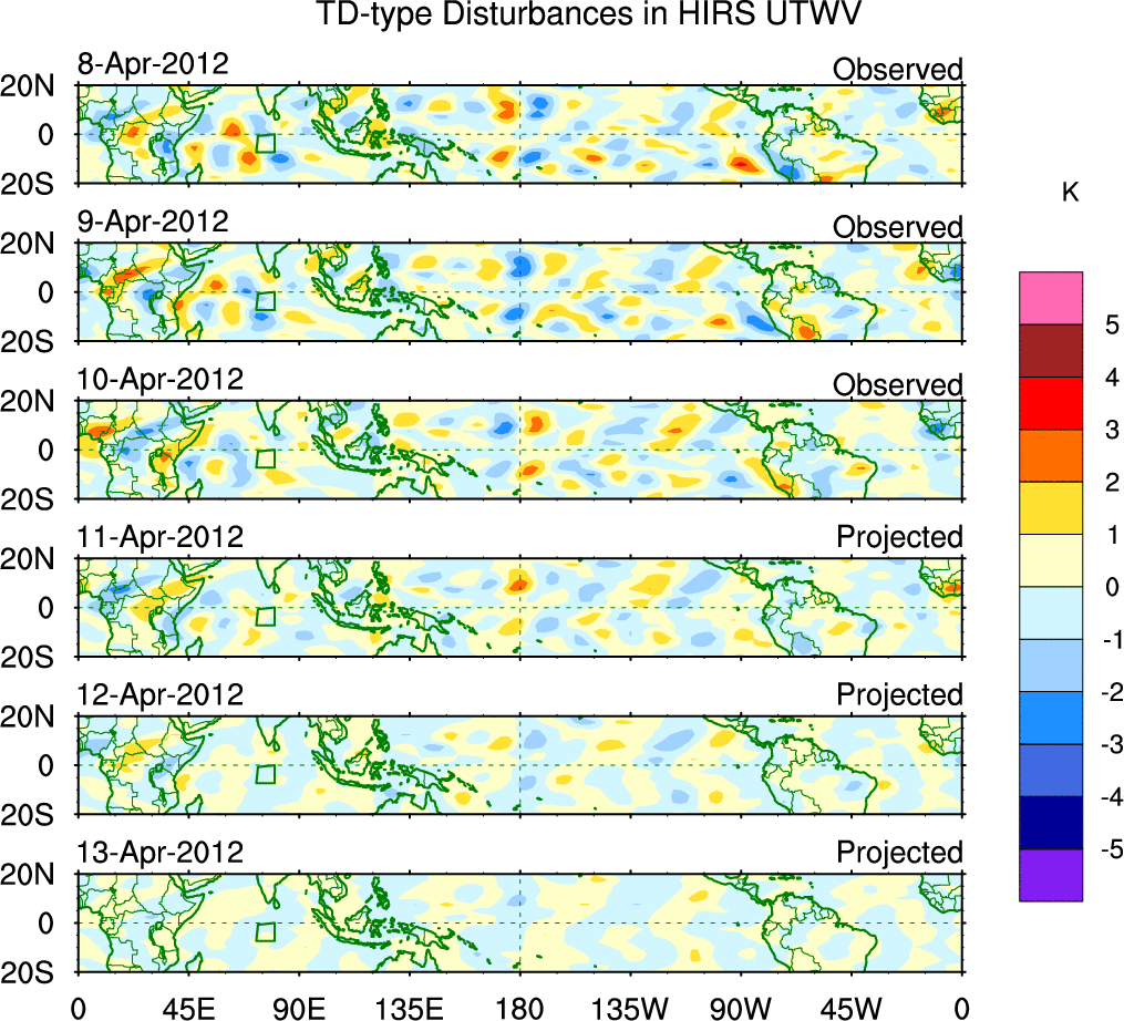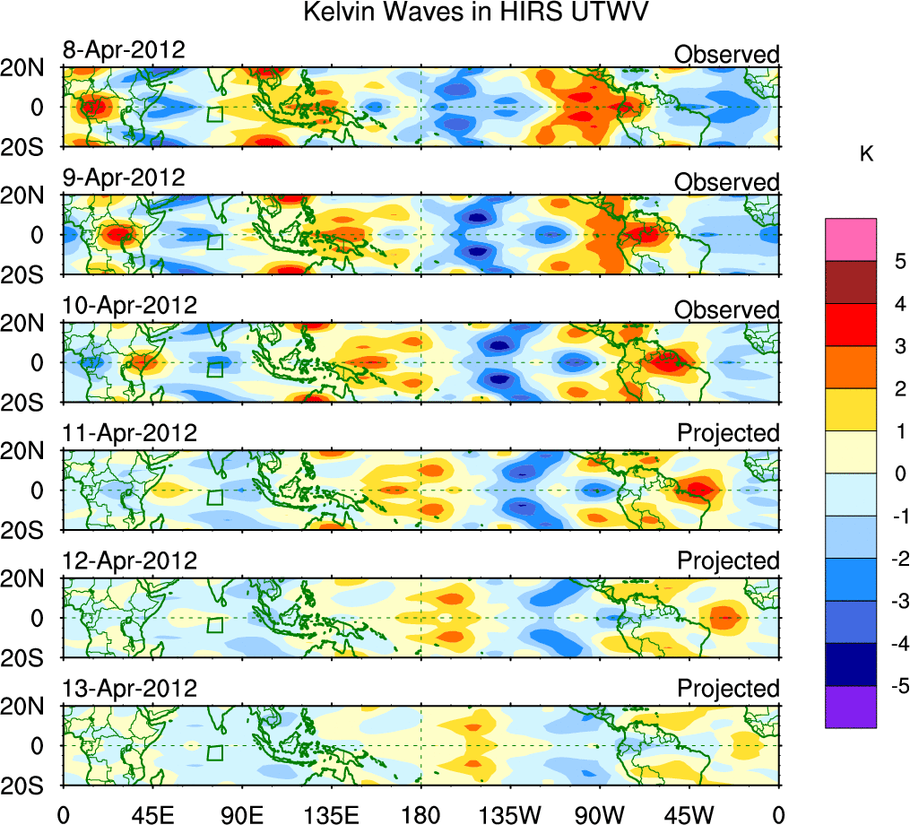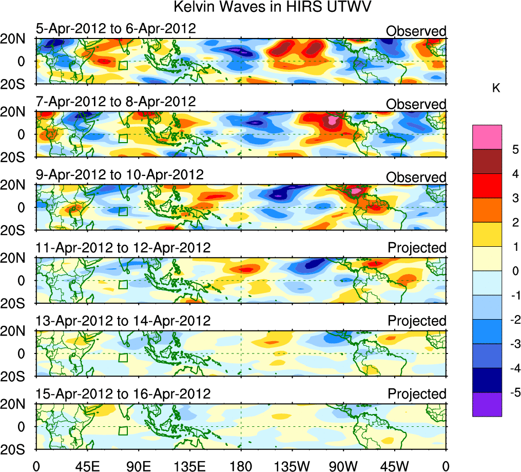 To identify tropical waves in near real-time, the OLR and UTWV data are filtered following Wheeler & Weickmann (2001 MWR). The daily anomalies are calculated using the first 3 harmonics of the seasonal cycle for 1979–2009. Missing values are then filled using linear interpolation in space and time. The most recent 365 days of anomalies are padded with 659 days of zeroes, and the result is filtered for each wave type.