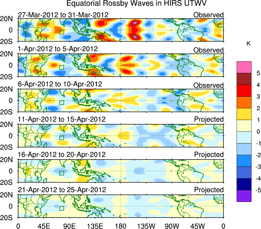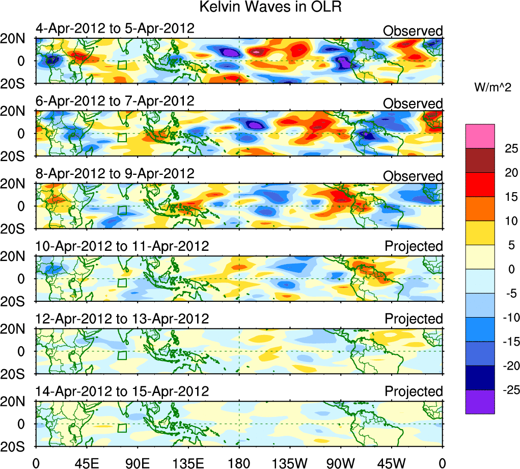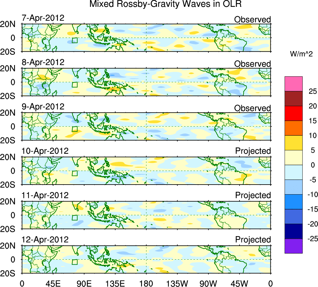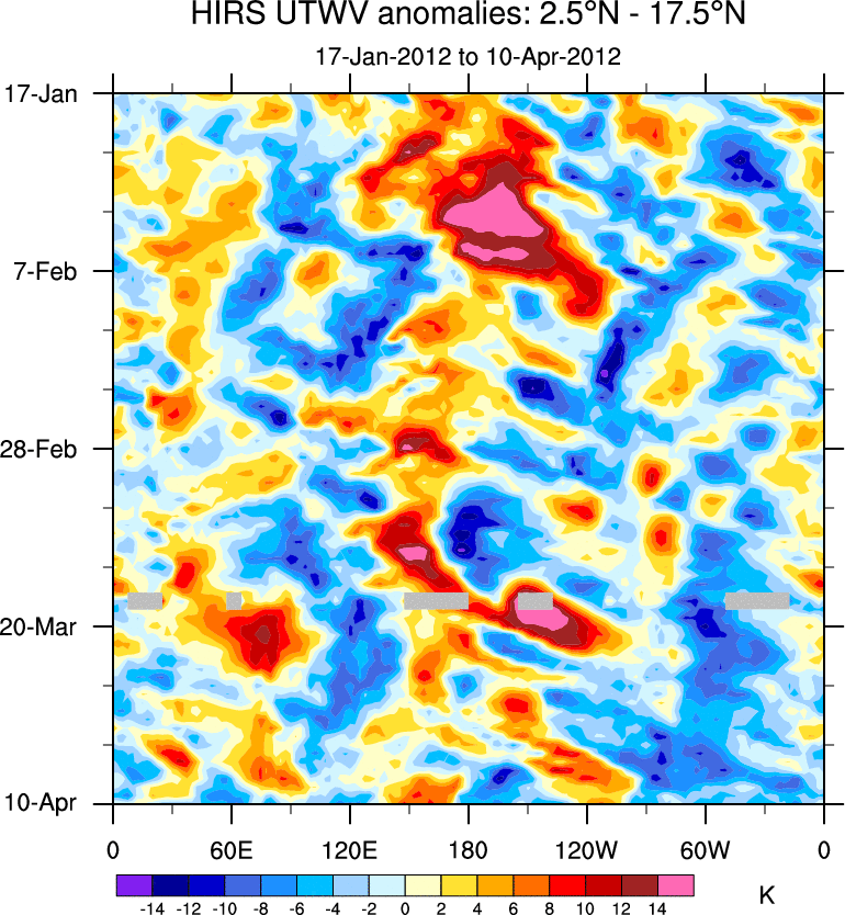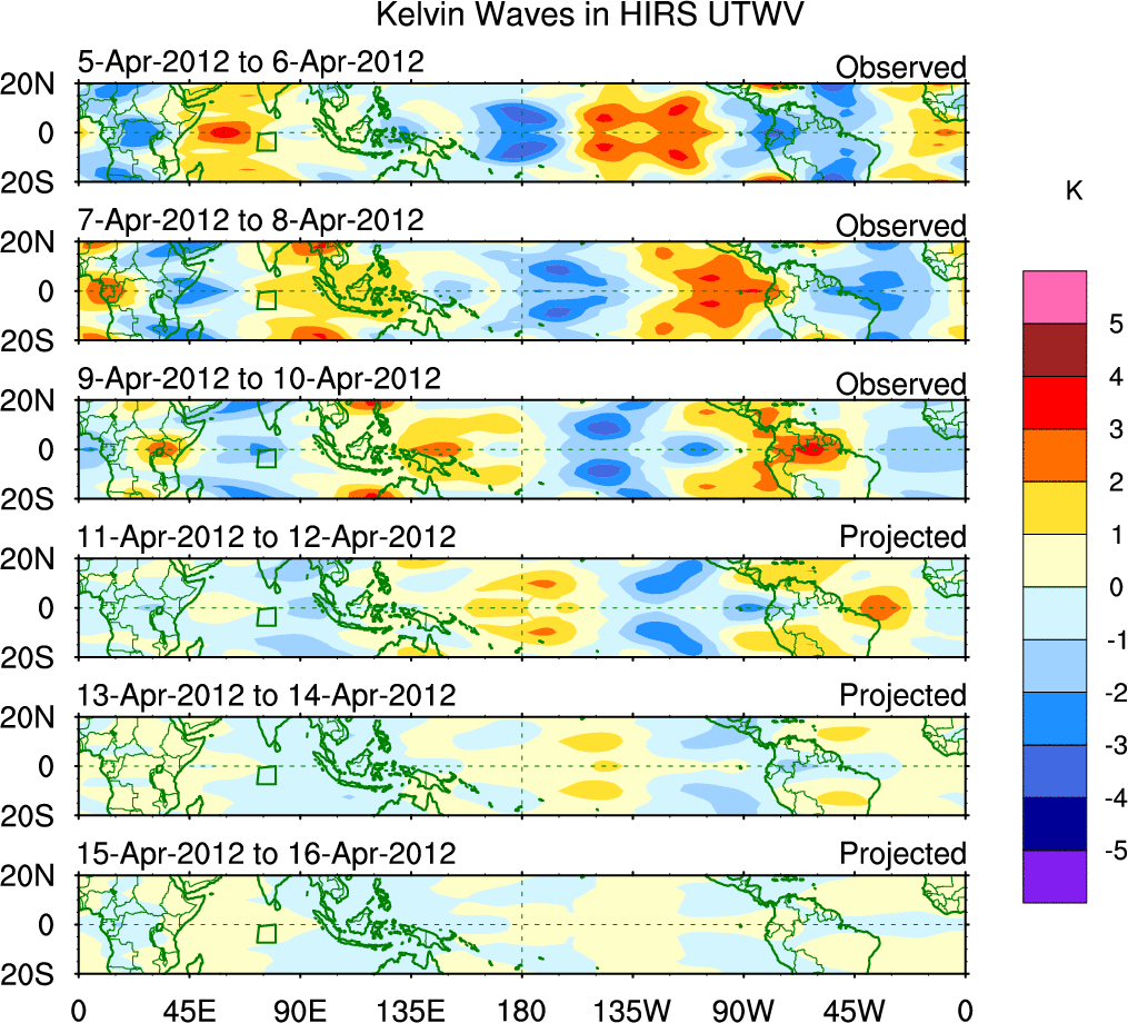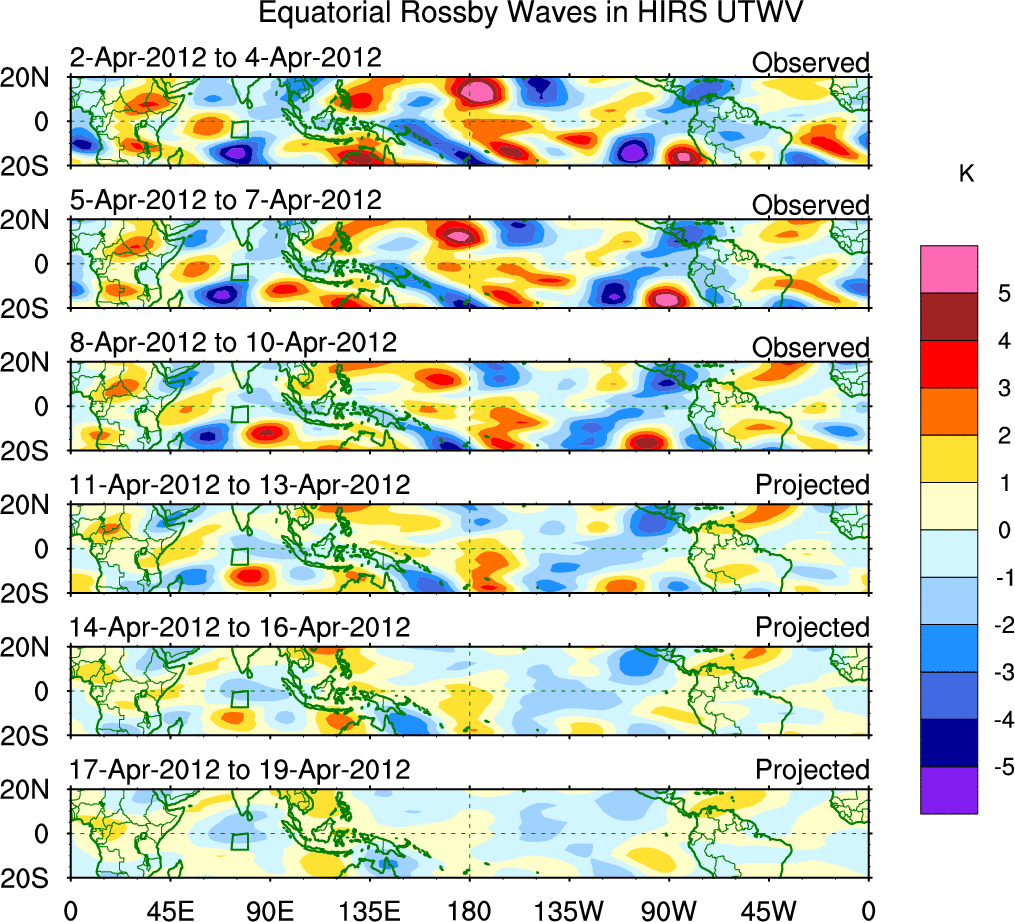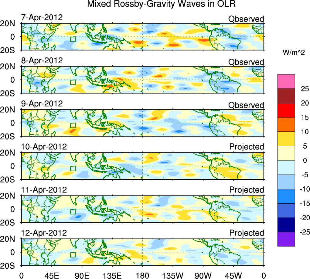 To identify tropical waves in near real-time, the OLR and UTWV data are filtered following Wheeler & Weickmann (2001 MWR). The daily anomalies are calculated using the first 3 harmonics of the seasonal cycle for 1979–2009. Missing values are then filled using linear interpolation in space and time. The most recent 365 days of anomalies are padded with 659 days of zeroes, and the result is filtered for each wave type.