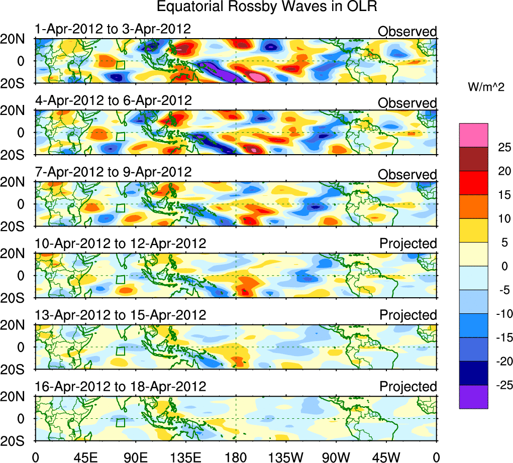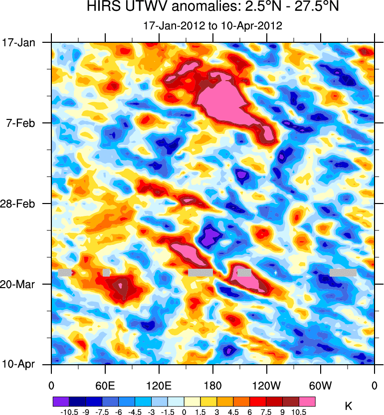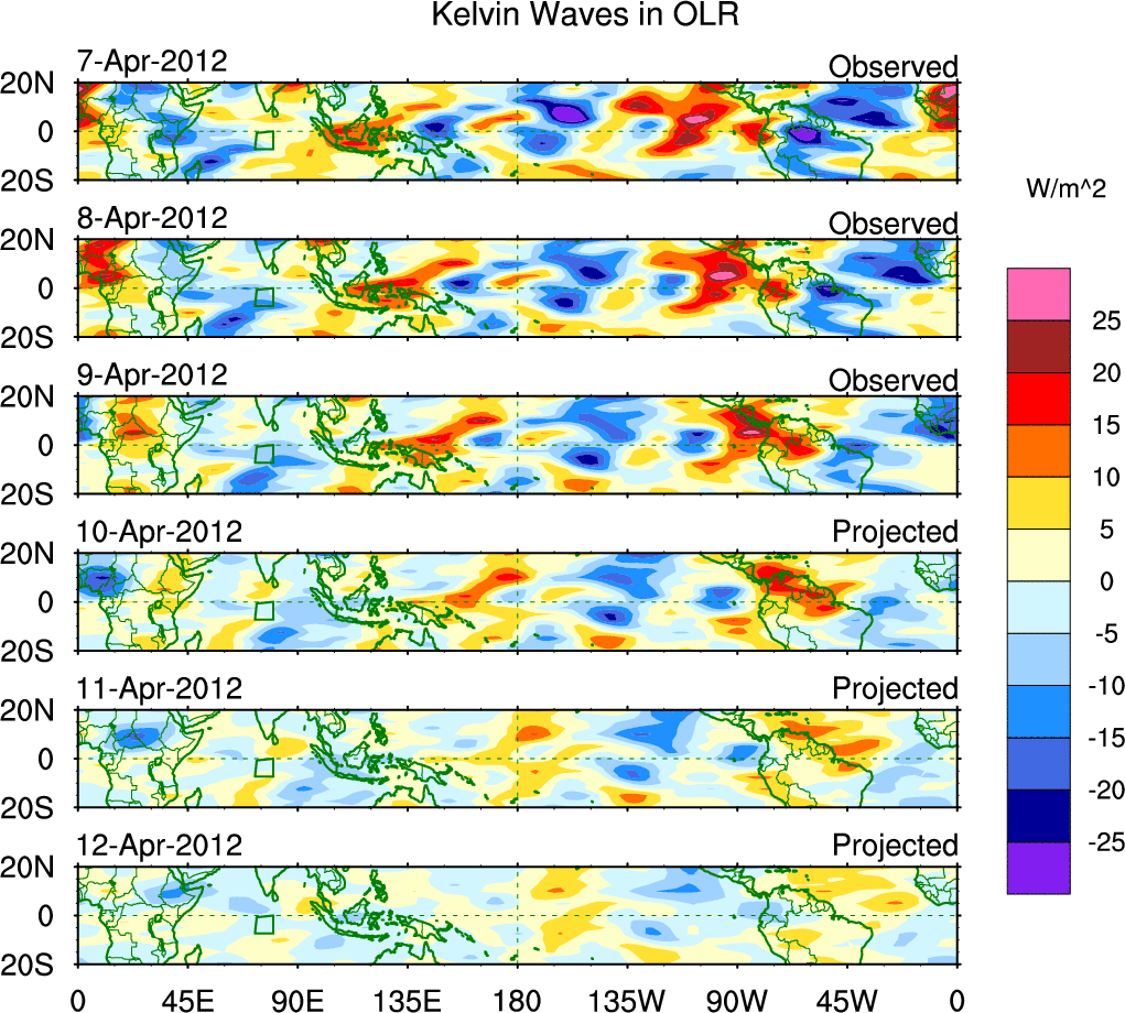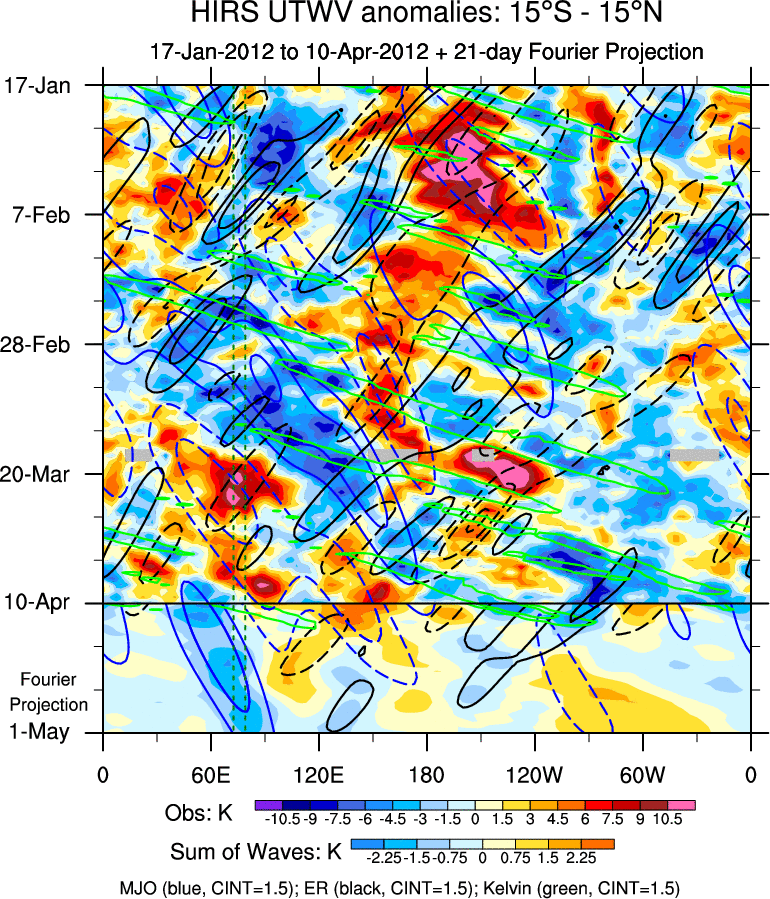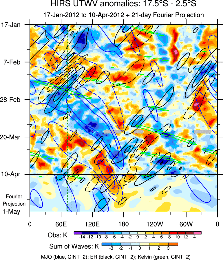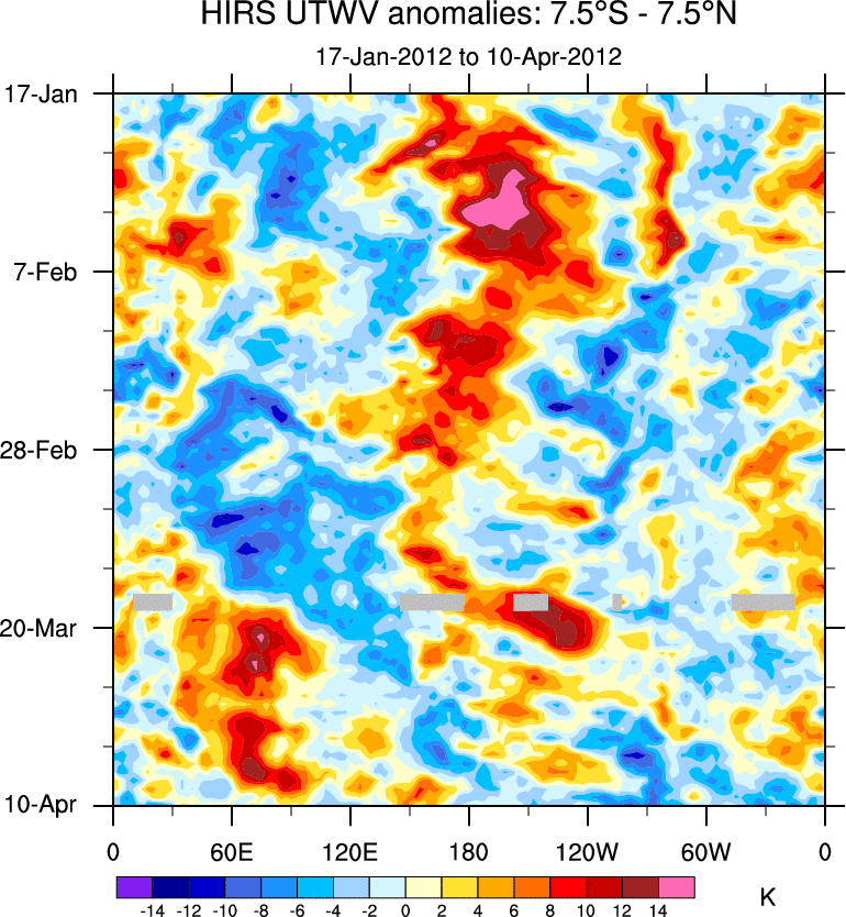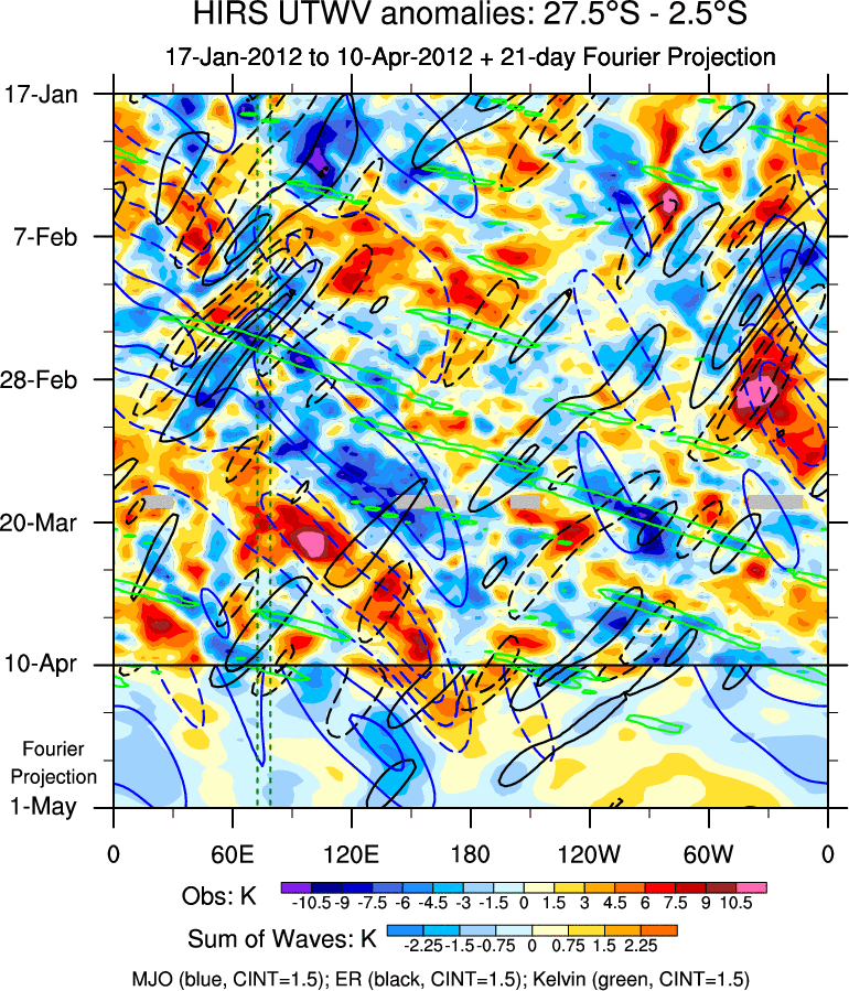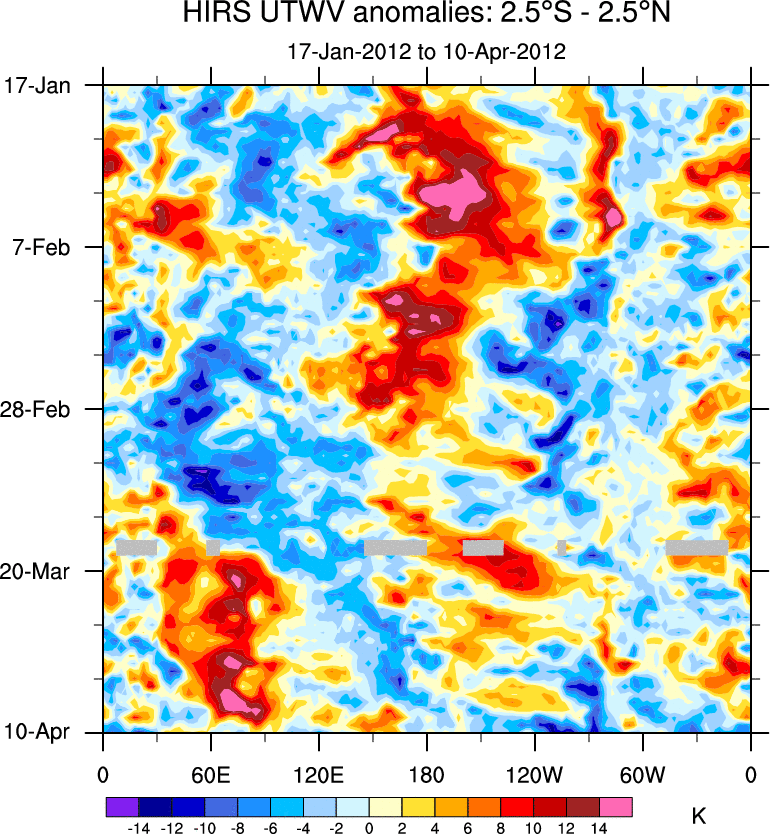 To identify tropical waves in near real-time, the OLR and UTWV data are filtered following Wheeler & Weickmann (2001 MWR). The daily anomalies are calculated using the first 3 harmonics of the seasonal cycle for 1979–2009. Missing values are then filled using linear interpolation in space and time. The most recent 365 days of anomalies are padded with 659 days of zeroes, and the result is filtered for each wave type.