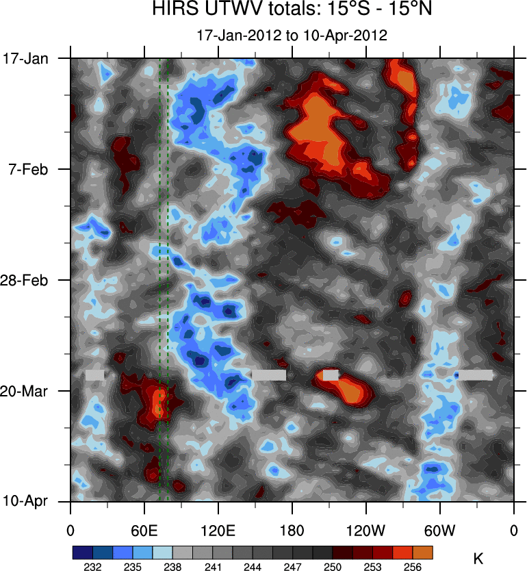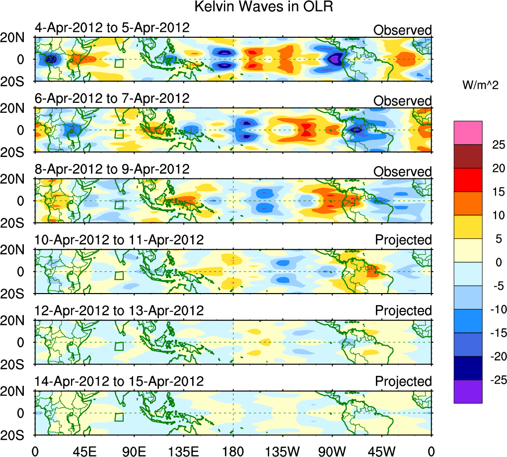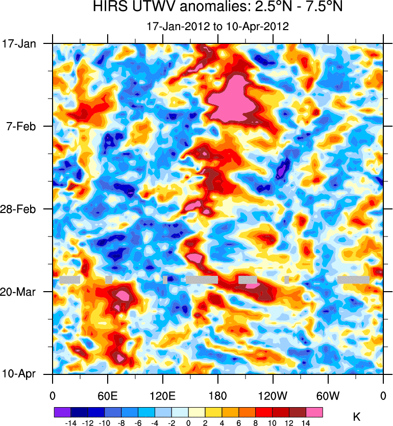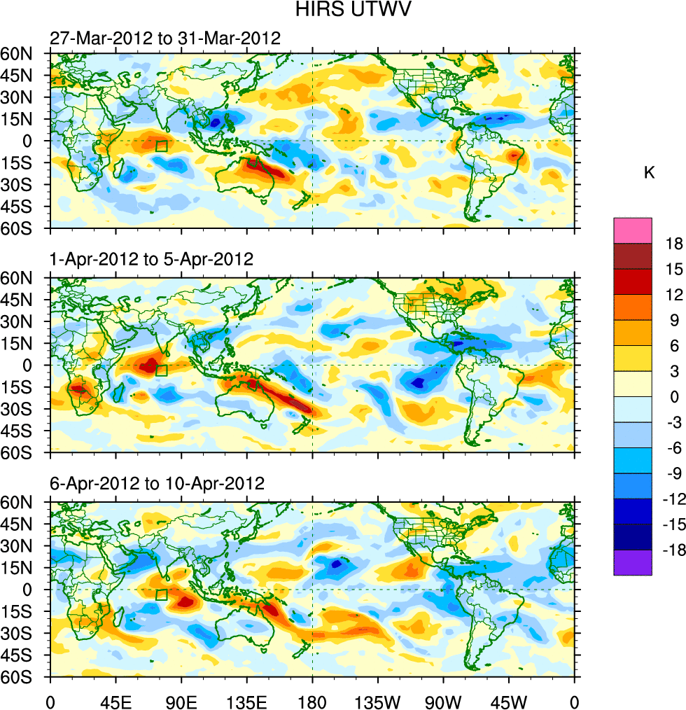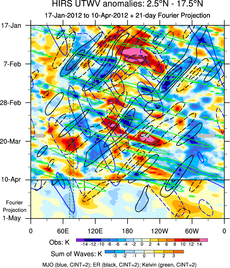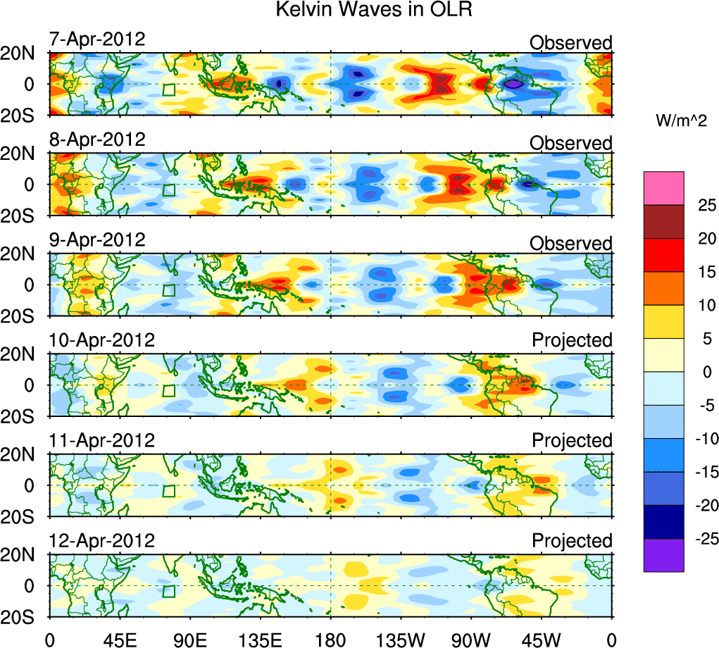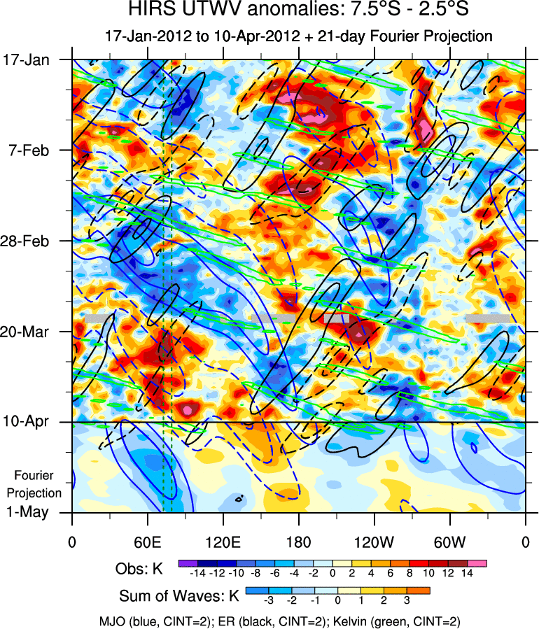 To identify tropical waves in near real-time, the OLR and UTWV data are filtered following Wheeler & Weickmann (2001 MWR). The daily anomalies are calculated using the first 3 harmonics of the seasonal cycle for 1979–2009. Missing values are then filled using linear interpolation in space and time. The most recent 365 days of anomalies are padded with 659 days of zeroes, and the result is filtered for each wave type.