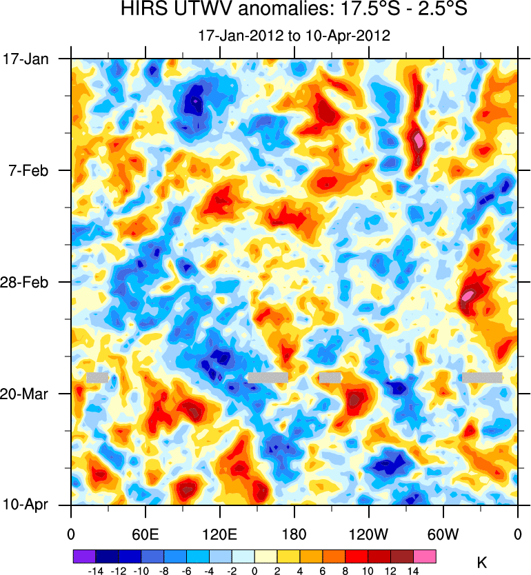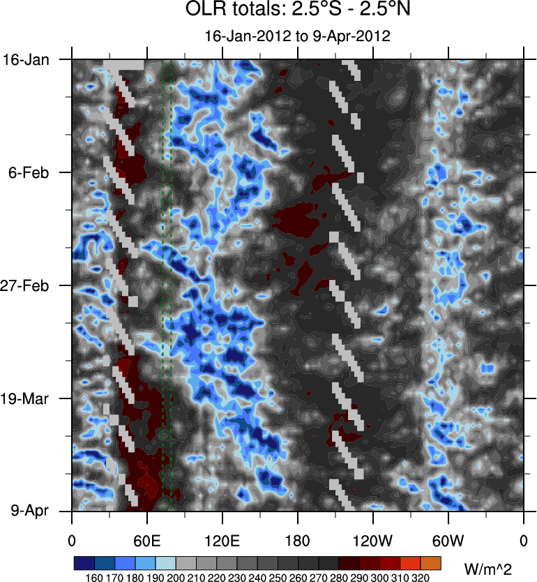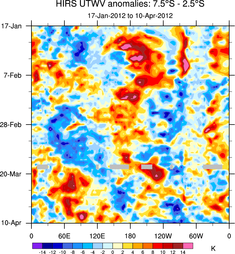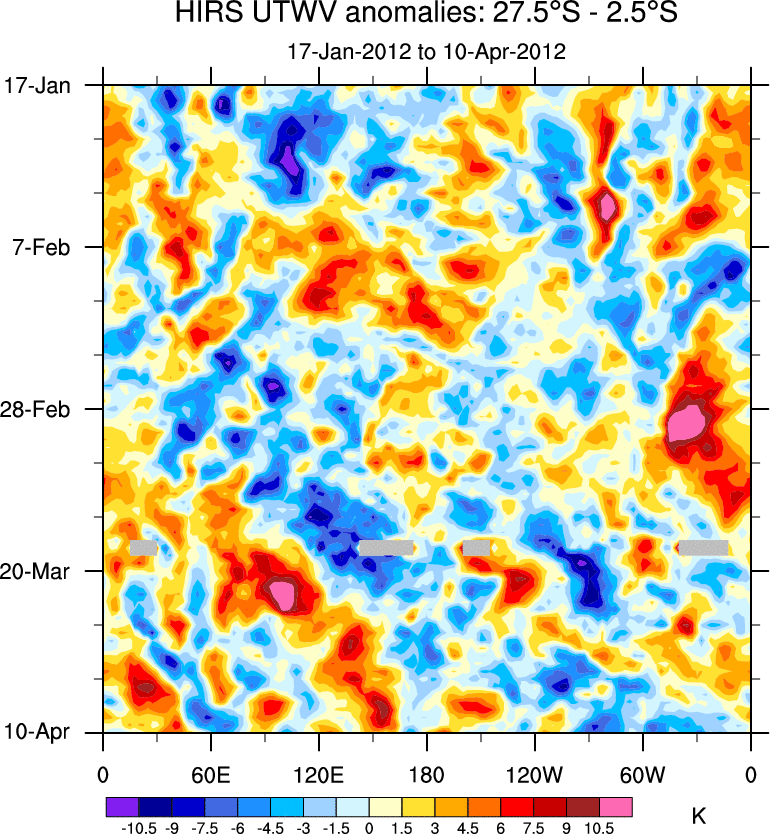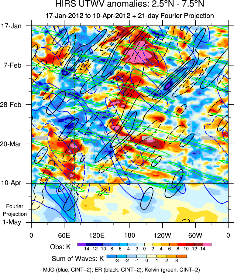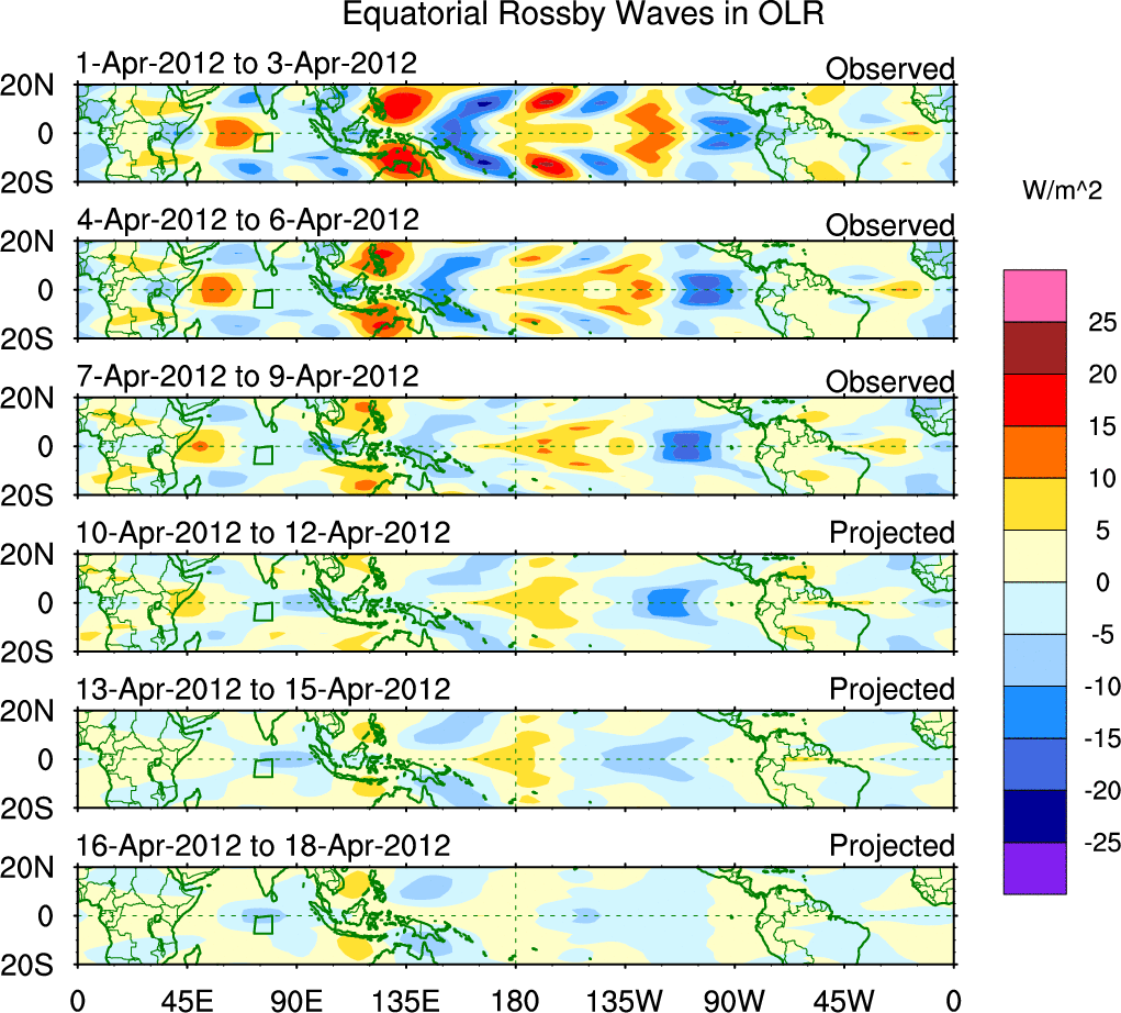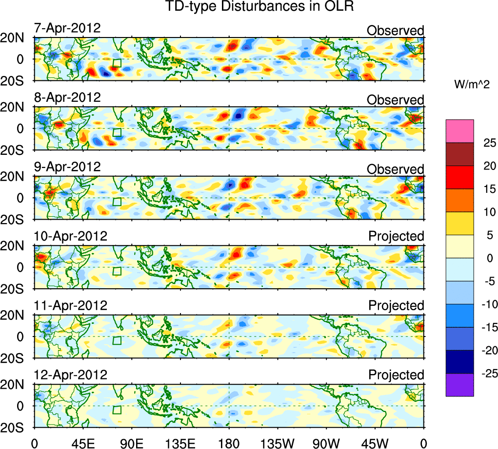 To identify tropical waves in near real-time, the OLR and UTWV data are filtered following Wheeler & Weickmann (2001 MWR). The daily anomalies are calculated using the first 3 harmonics of the seasonal cycle for 1979–2009. Missing values are then filled using linear interpolation in space and time. The most recent 365 days of anomalies are padded with 659 days of zeroes, and the result is filtered for each wave type.