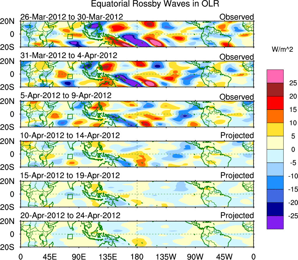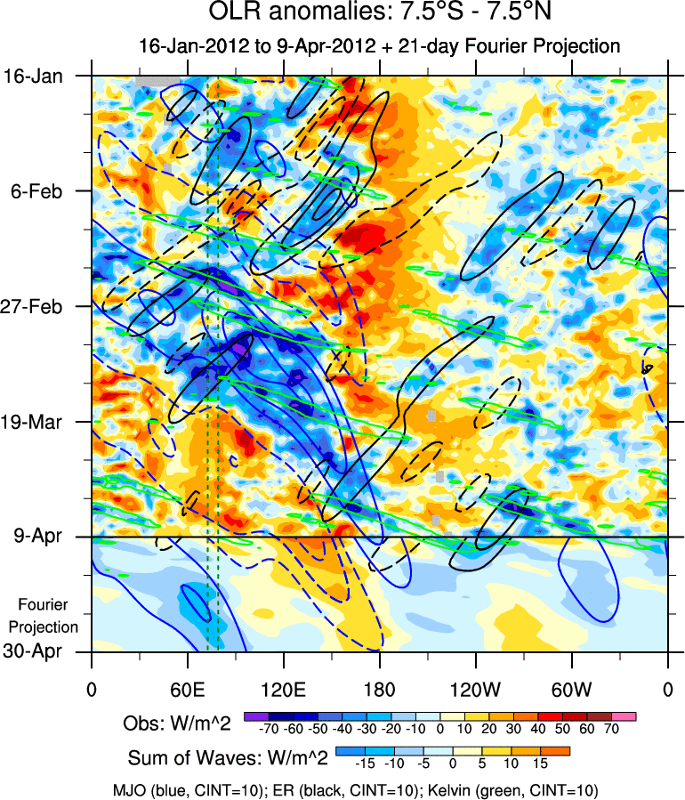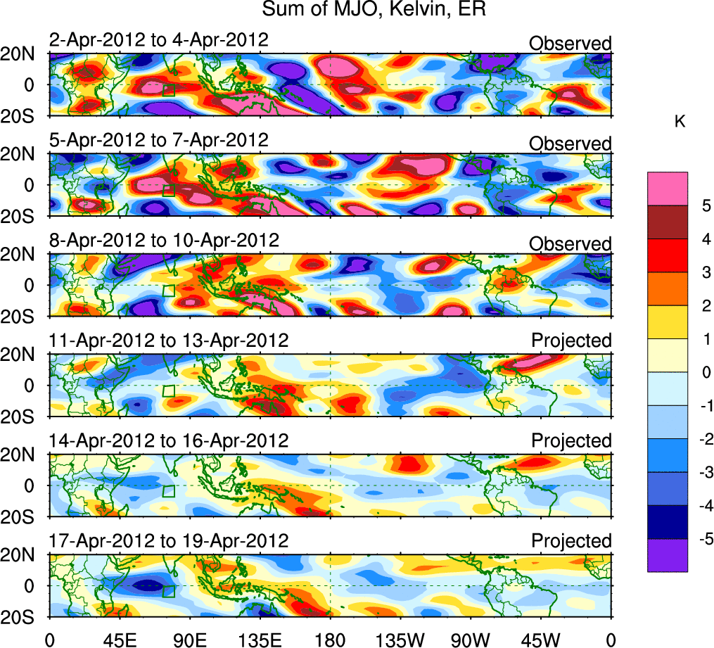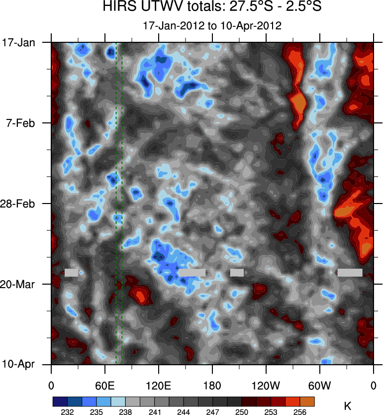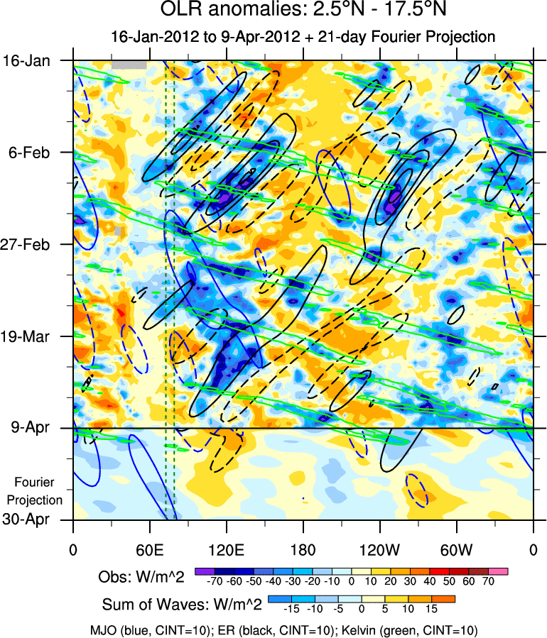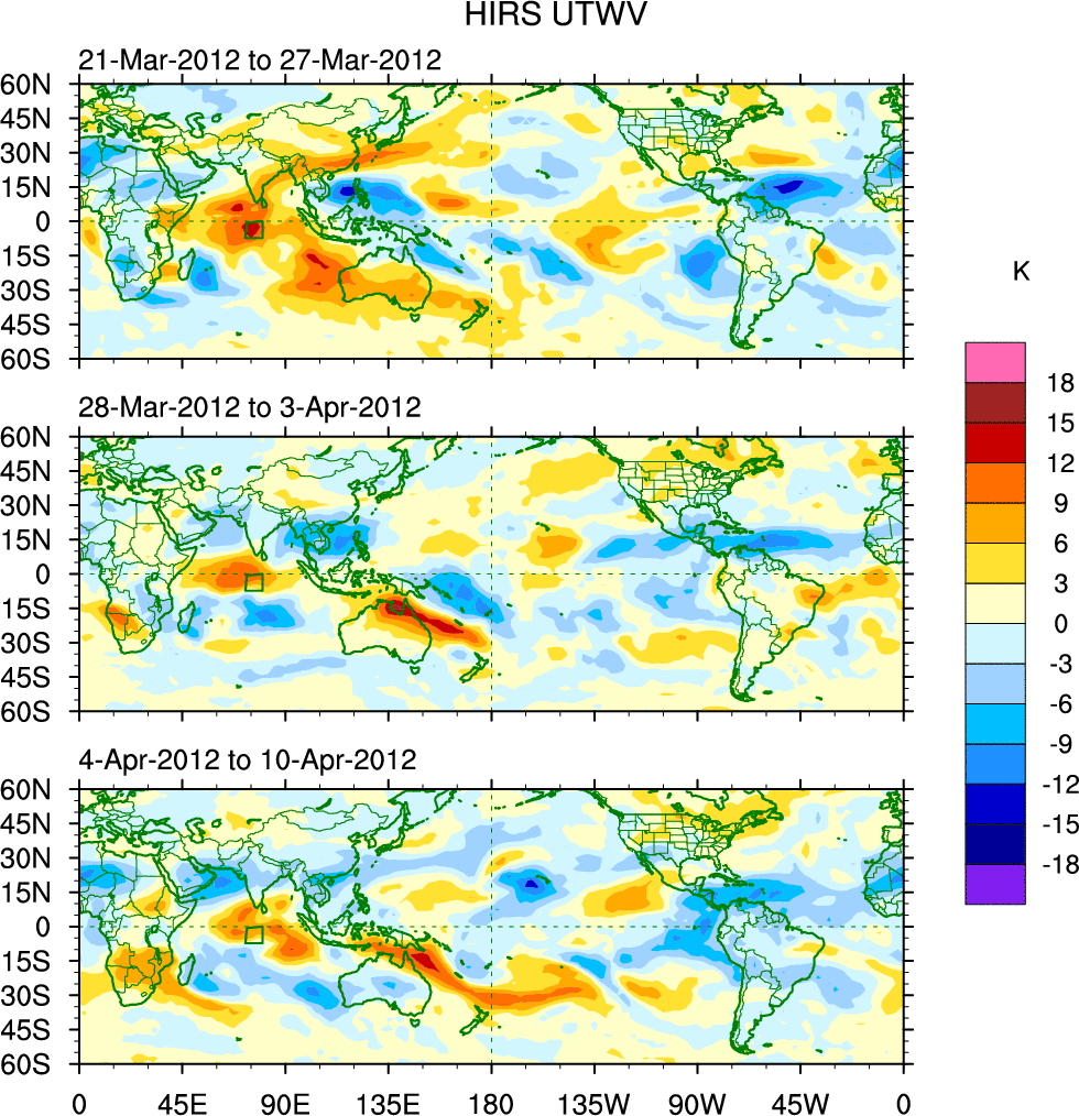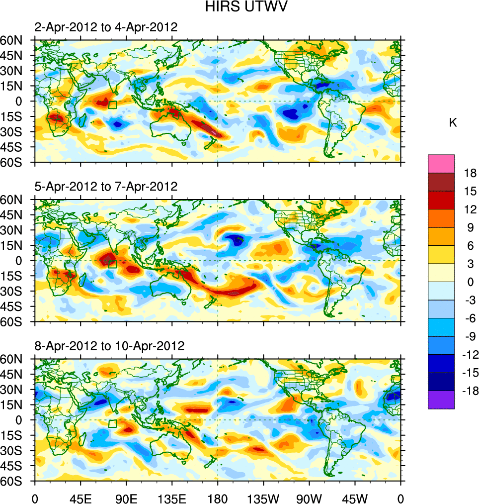 To identify tropical waves in near real-time, the OLR and UTWV data are filtered following Wheeler & Weickmann (2001 MWR). The daily anomalies are calculated using the first 3 harmonics of the seasonal cycle for 1979–2009. Missing values are then filled using linear interpolation in space and time. The most recent 365 days of anomalies are padded with 659 days of zeroes, and the result is filtered for each wave type.