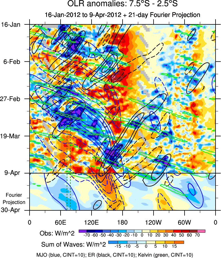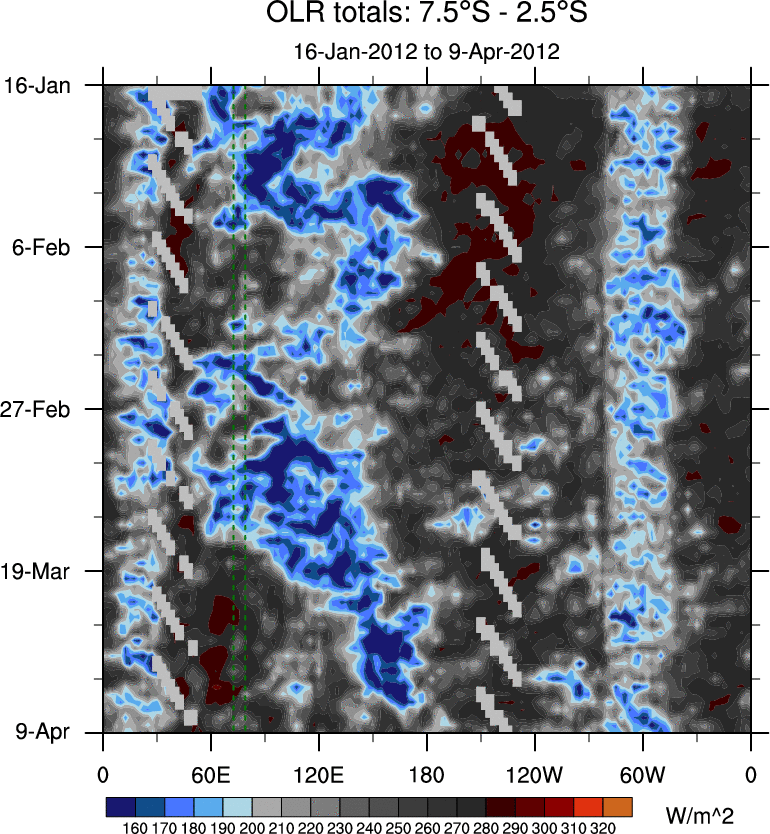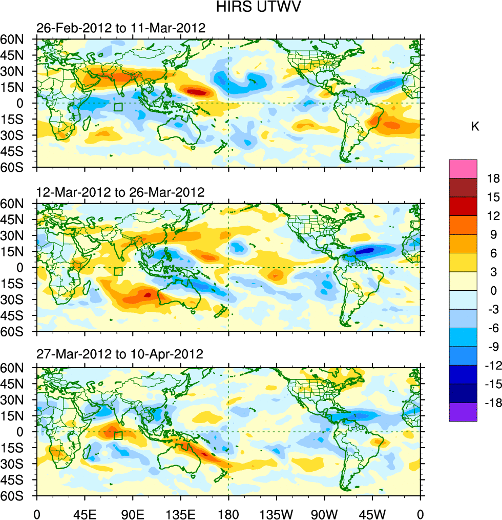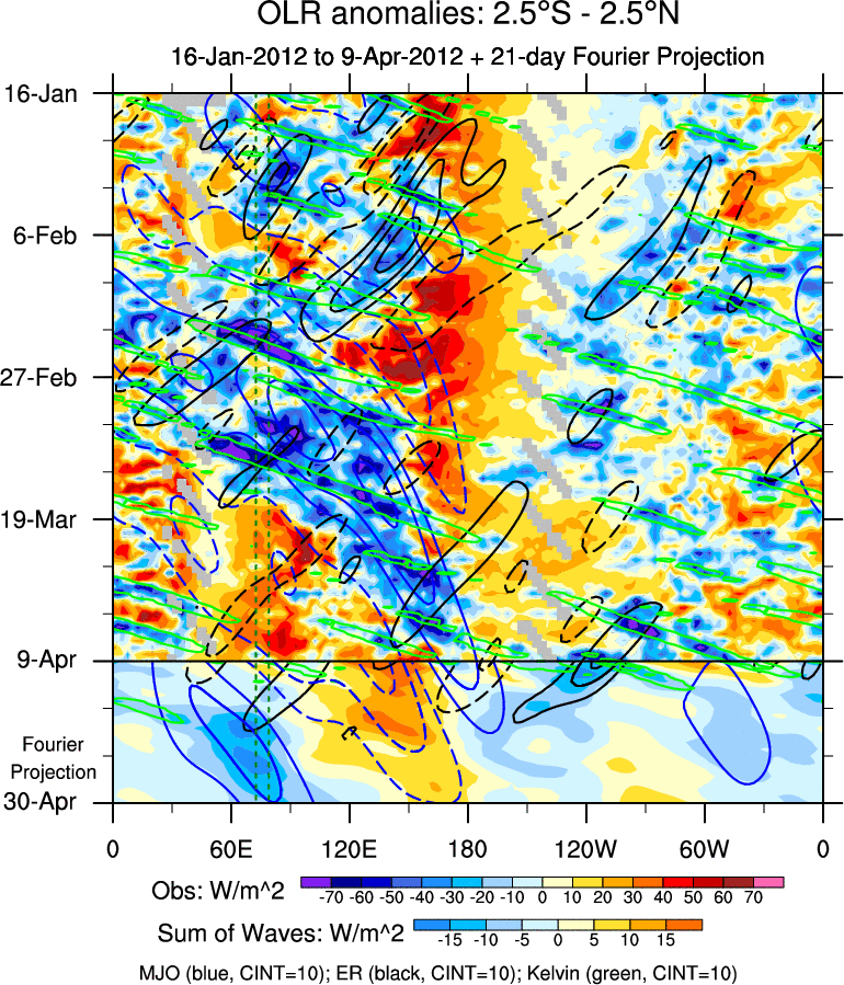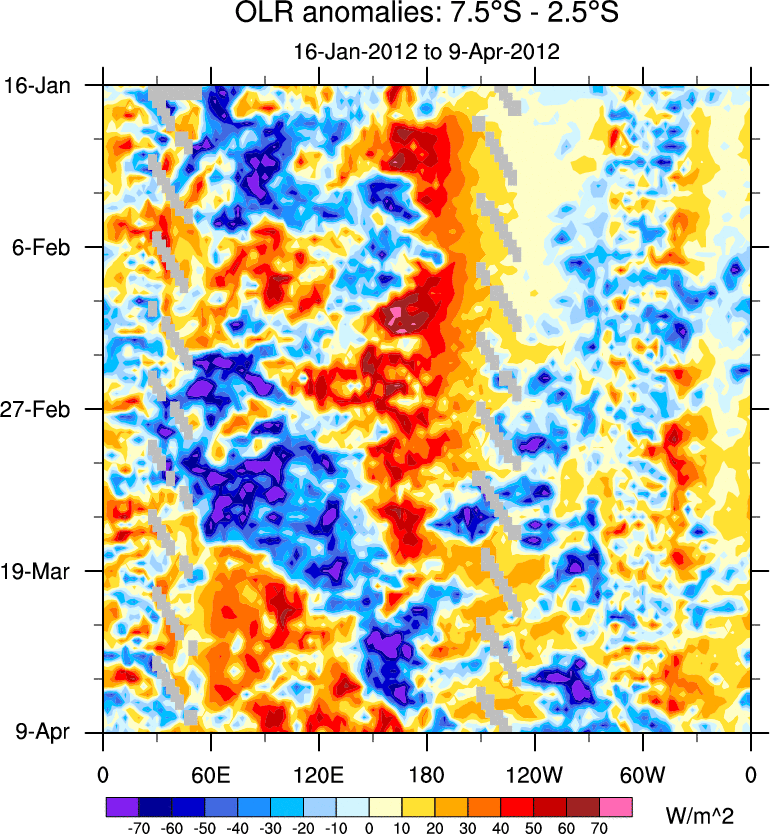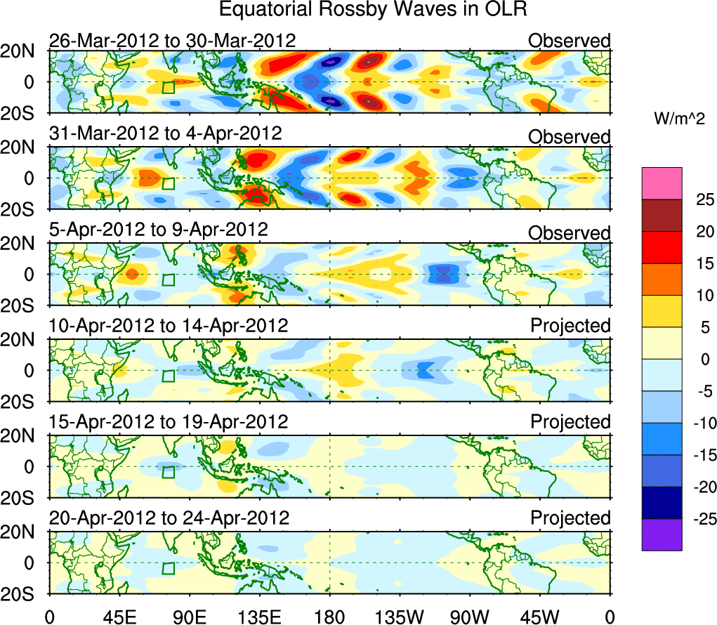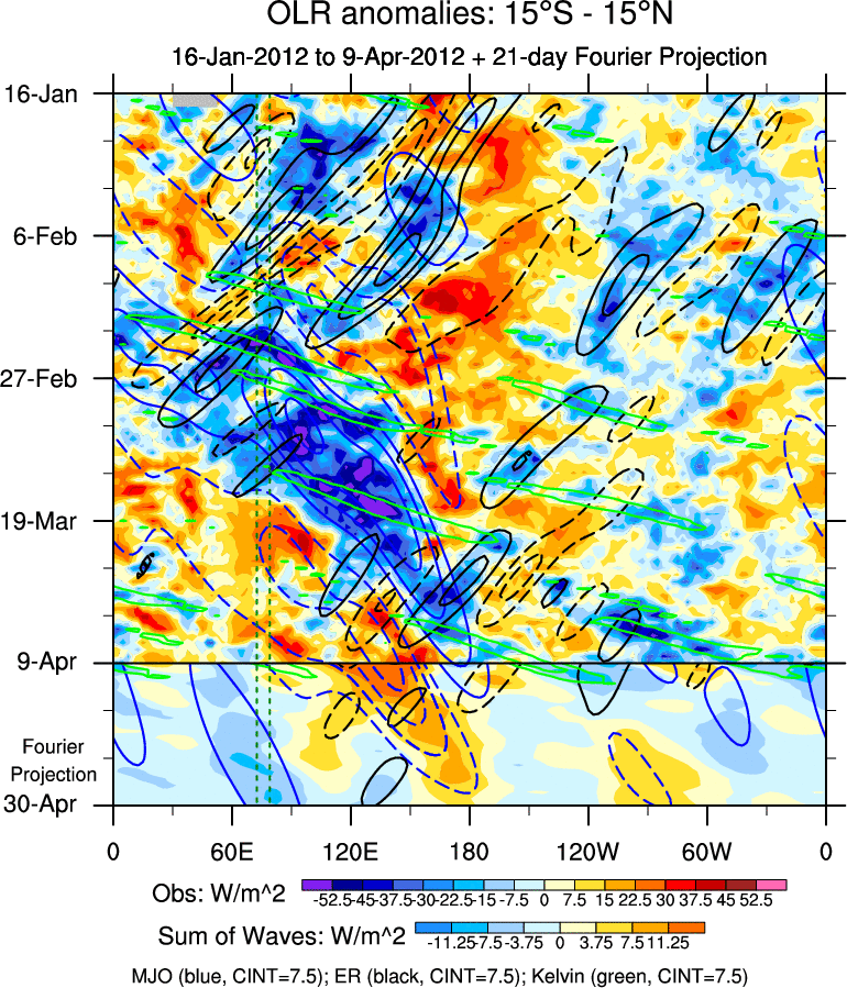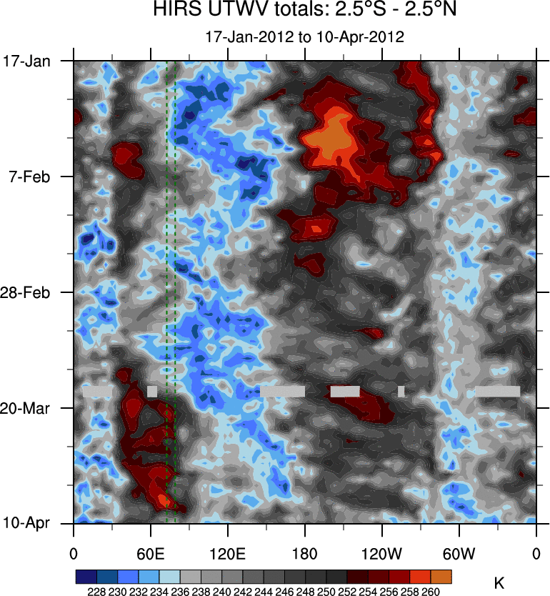To identify tropical waves in near real-time, the OLR and UTWV data are filtered following Wheeler & Weickmann (2001 MWR). The daily anomalies are calculated using the first 3 harmonics of the seasonal cycle for 1979–2009. Missing values are then filled using linear interpolation in space and time. The most recent 365 days of anomalies are padded with 659 days of zeroes, and the result is filtered for each wave type.