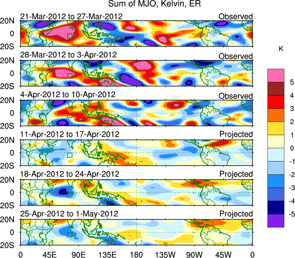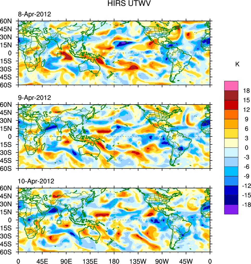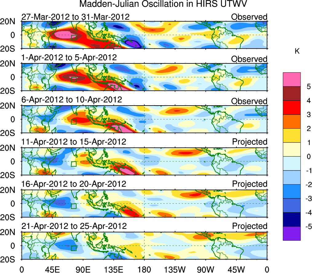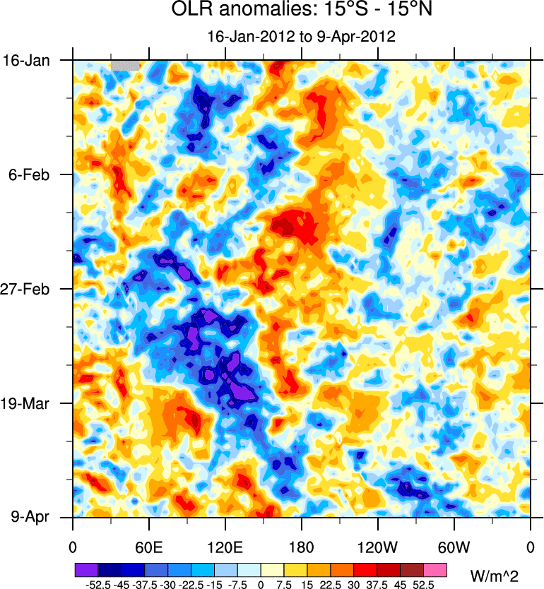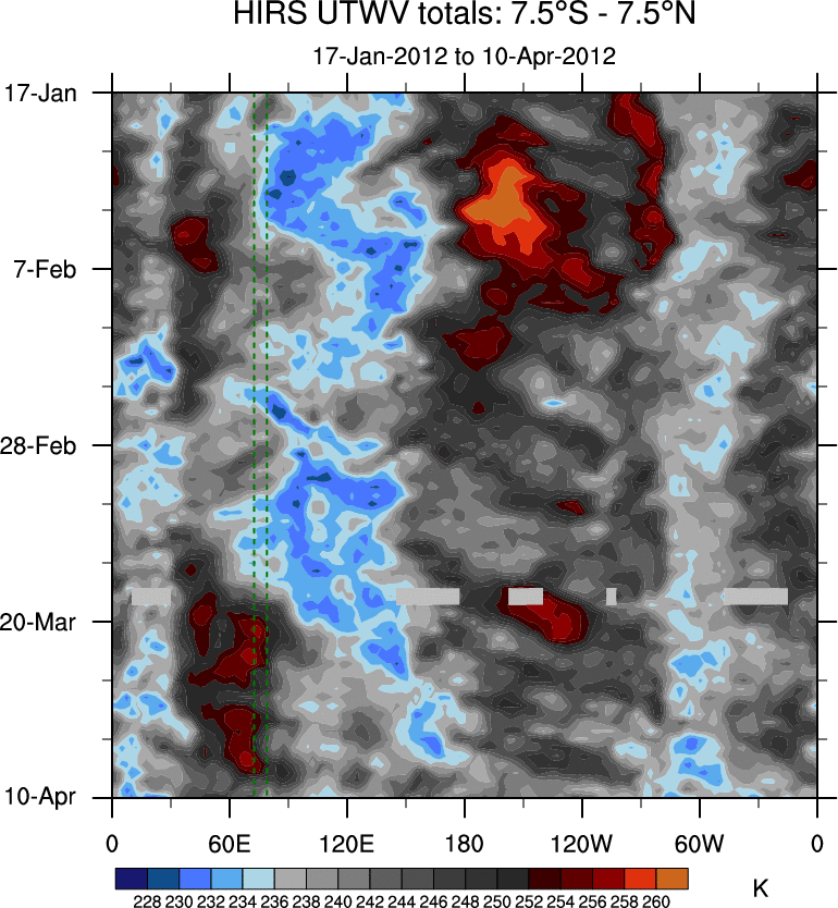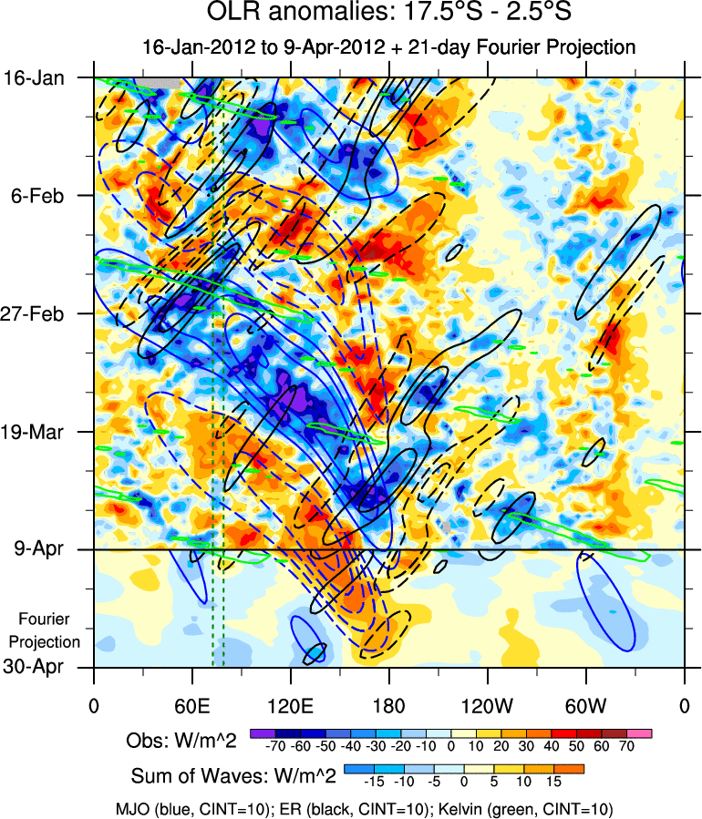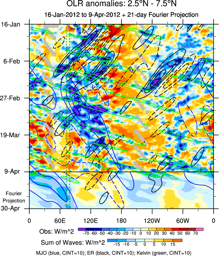 To identify tropical waves in near real-time, the OLR and UTWV data are filtered following Wheeler & Weickmann (2001 MWR). The daily anomalies are calculated using the first 3 harmonics of the seasonal cycle for 1979–2009. Missing values are then filled using linear interpolation in space and time. The most recent 365 days of anomalies are padded with 659 days of zeroes, and the result is filtered for each wave type.