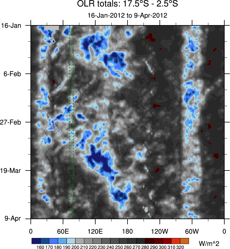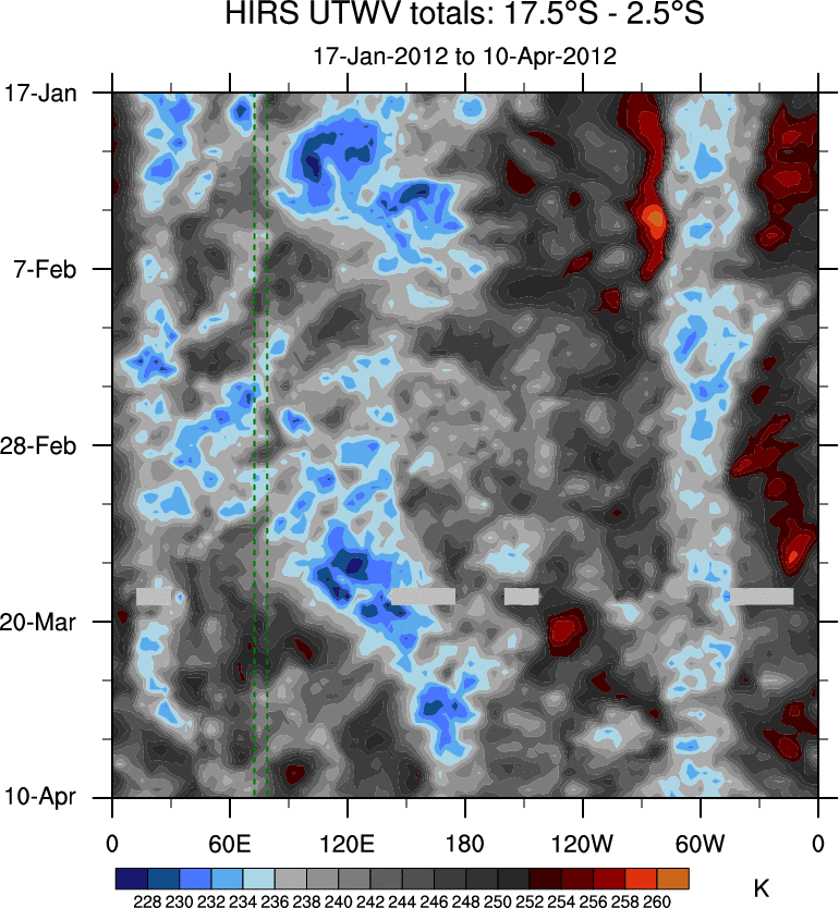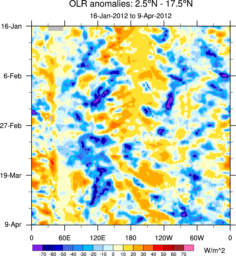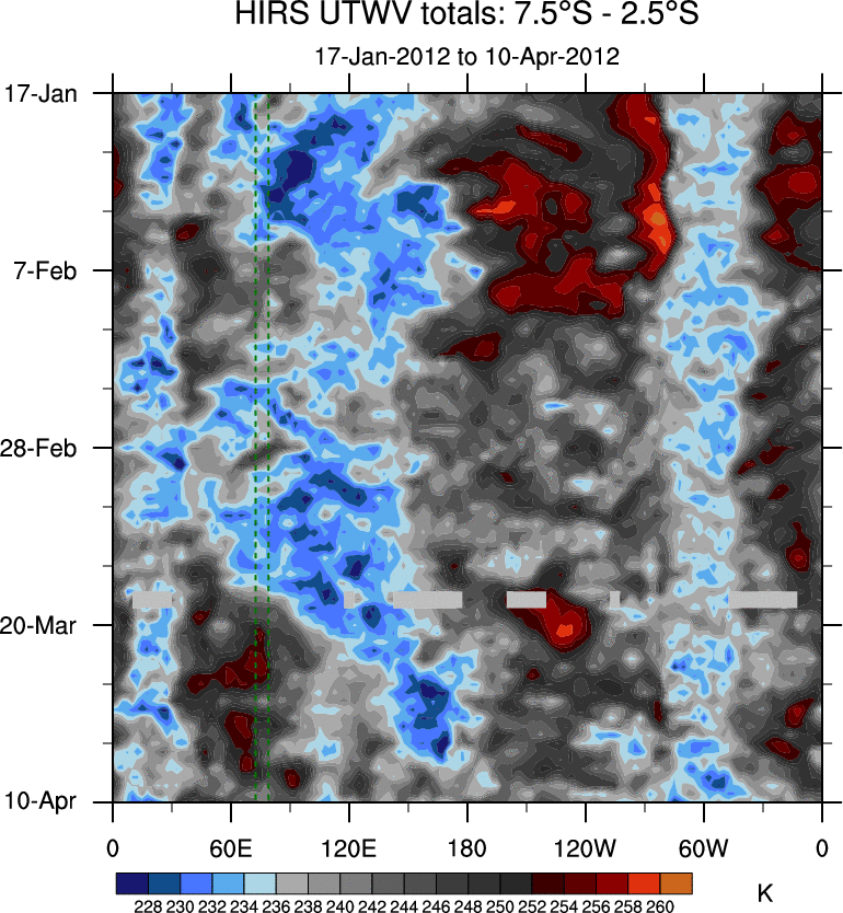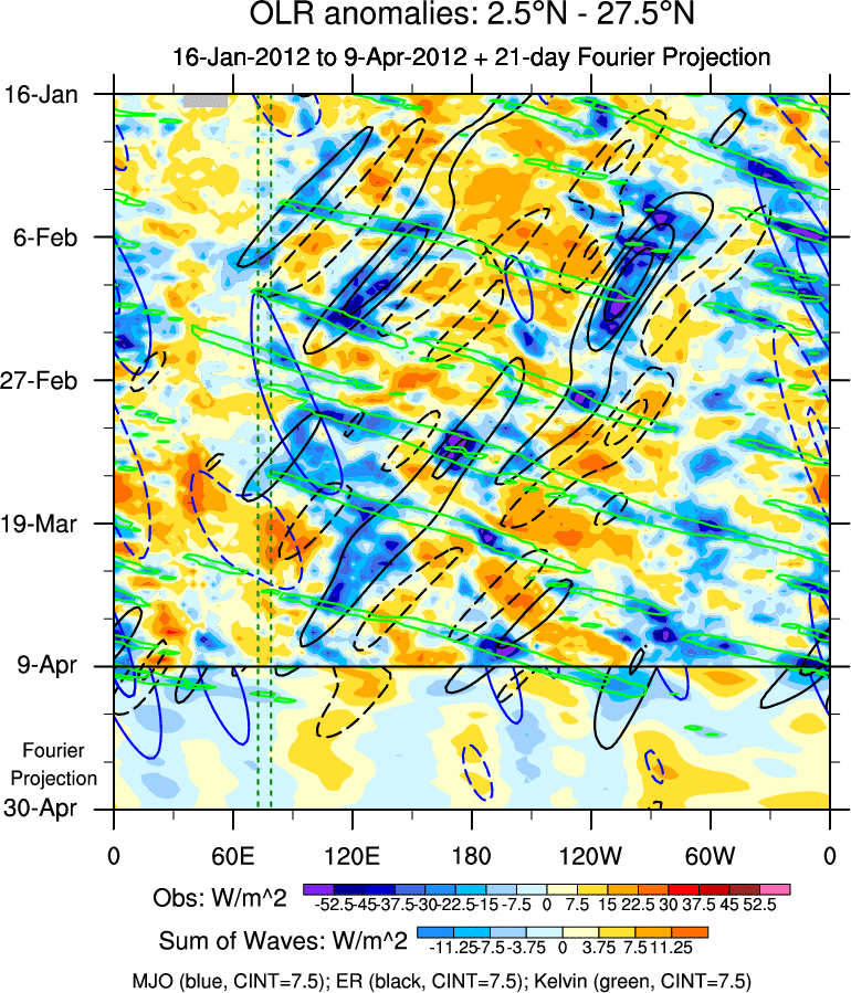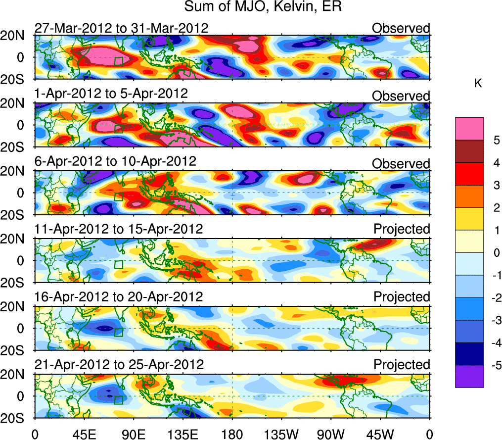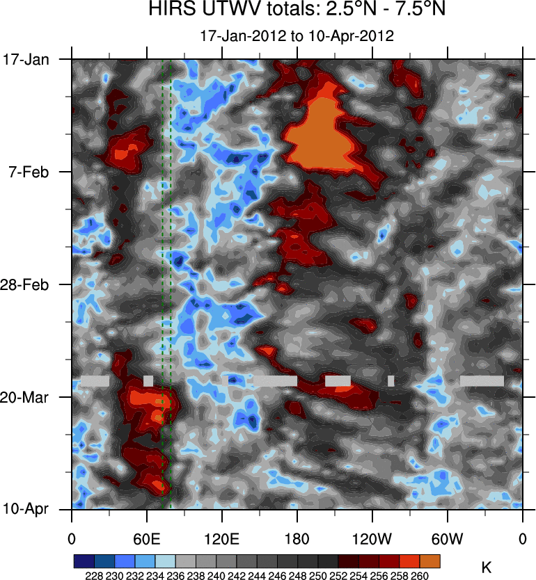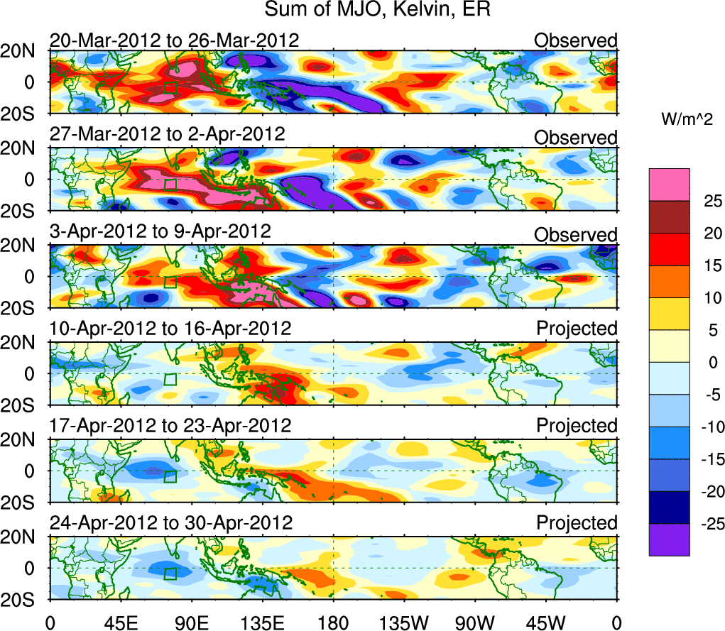 To identify tropical waves in near real-time, the OLR and UTWV data are filtered following Wheeler & Weickmann (2001 MWR). The daily anomalies are calculated using the first 3 harmonics of the seasonal cycle for 1979–2009. Missing values are then filled using linear interpolation in space and time. The most recent 365 days of anomalies are padded with 659 days of zeroes, and the result is filtered for each wave type.