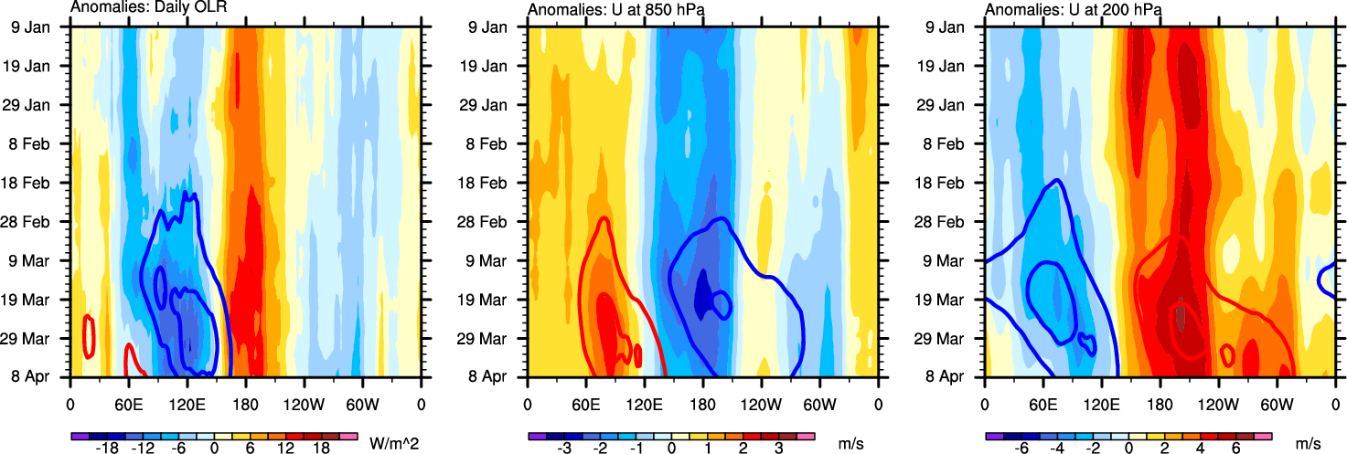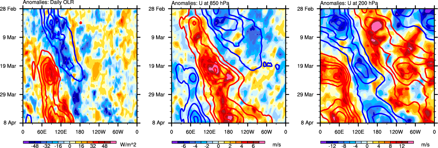 The Hovmollers show longitude-time plots for OLR, U-850, and U-200. The shading indicates the observed anomalies, while the contours are the projection of those anomalies onto the RMM EOFs.