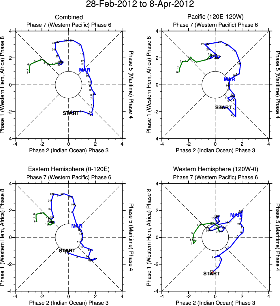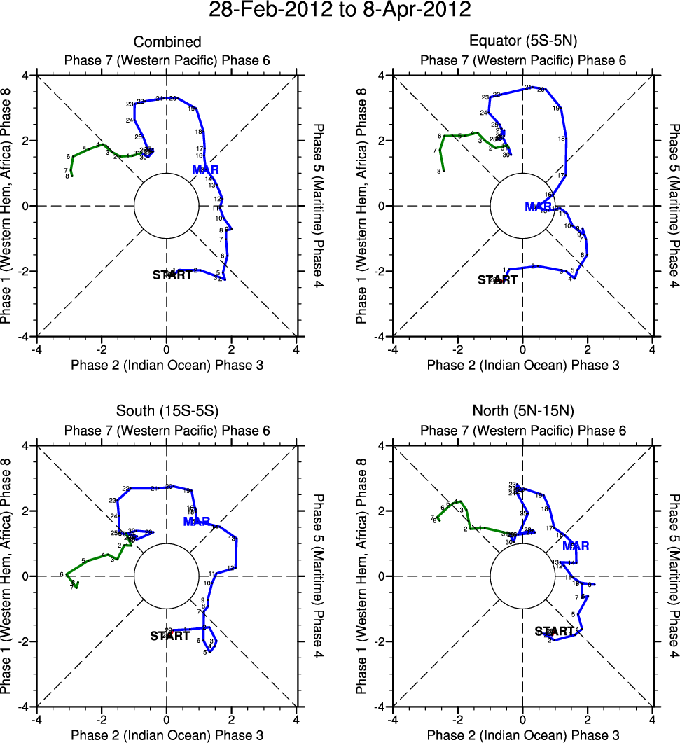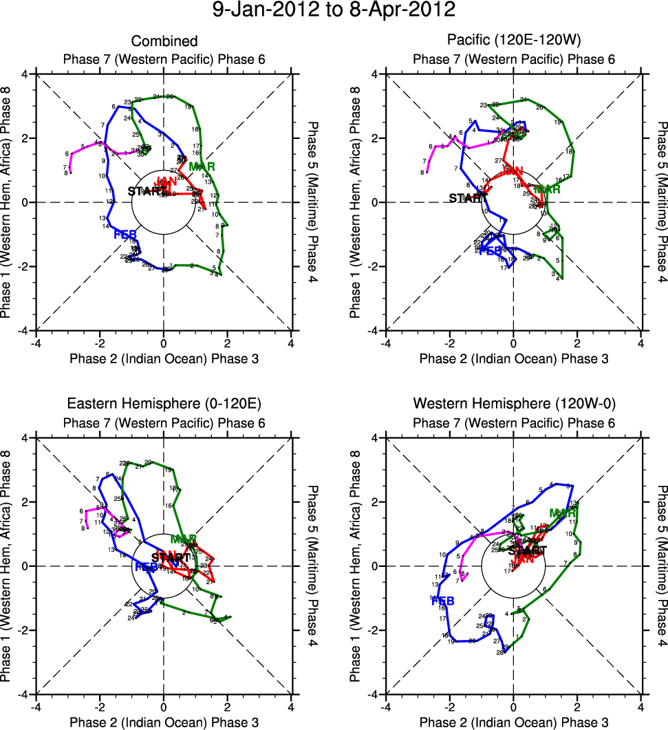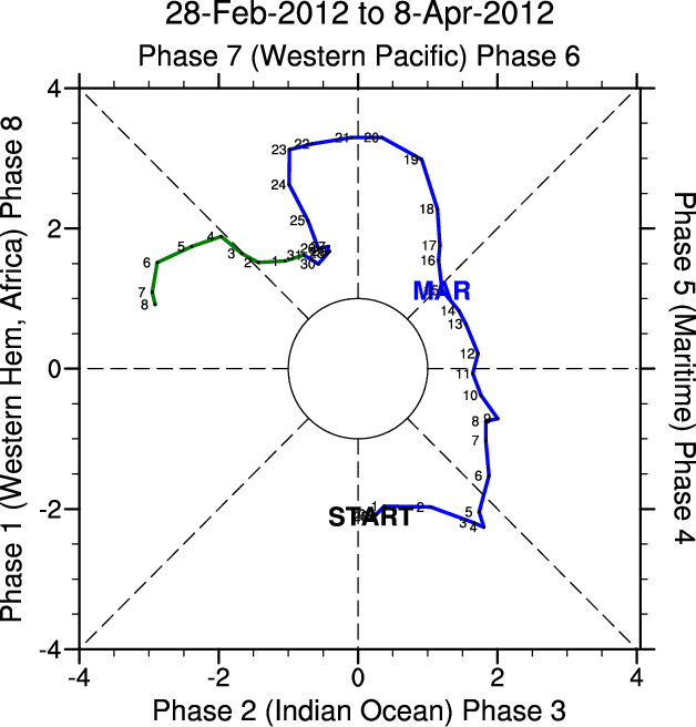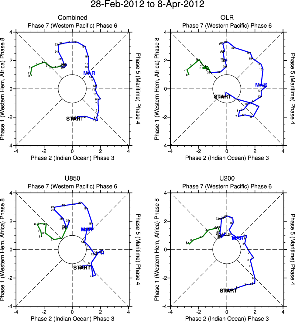 Wheeler and Hendon (2004) constructed the RMM index for monitoring the MJO. This index consists of the first two principal components (PCs) of OLR, 850-hPa zonal wind, and 200-hPa zonal wind averaged 15S-15N.