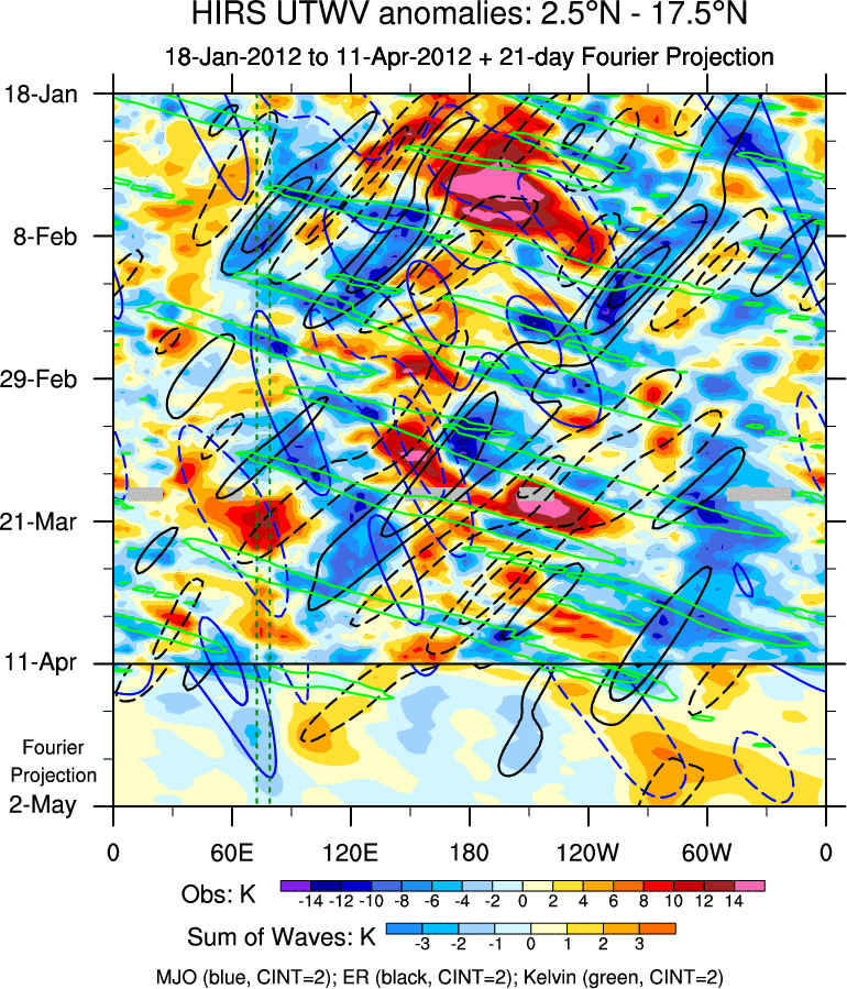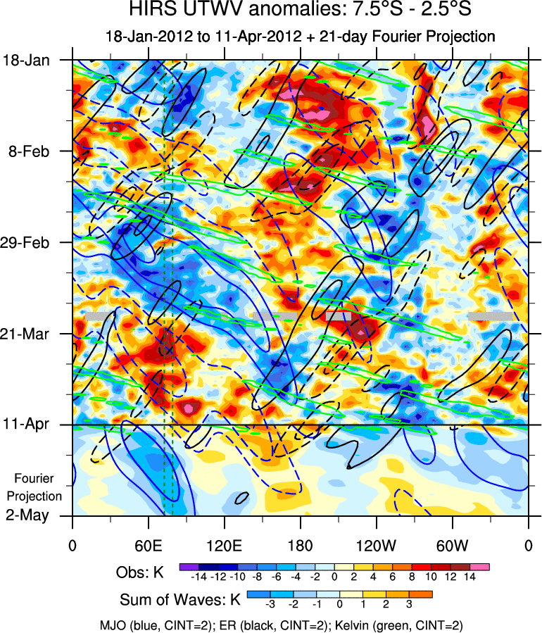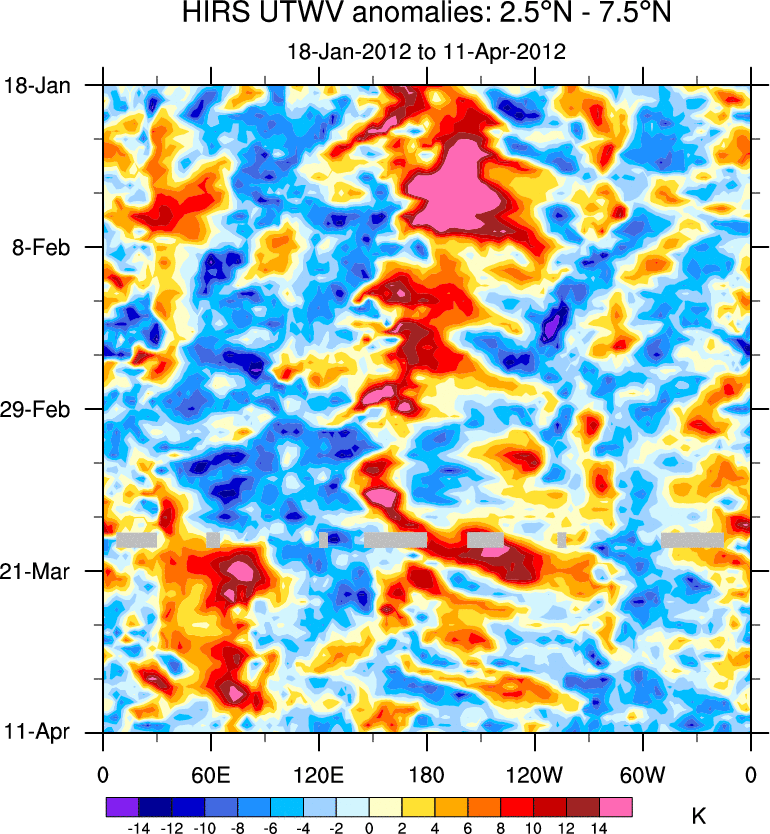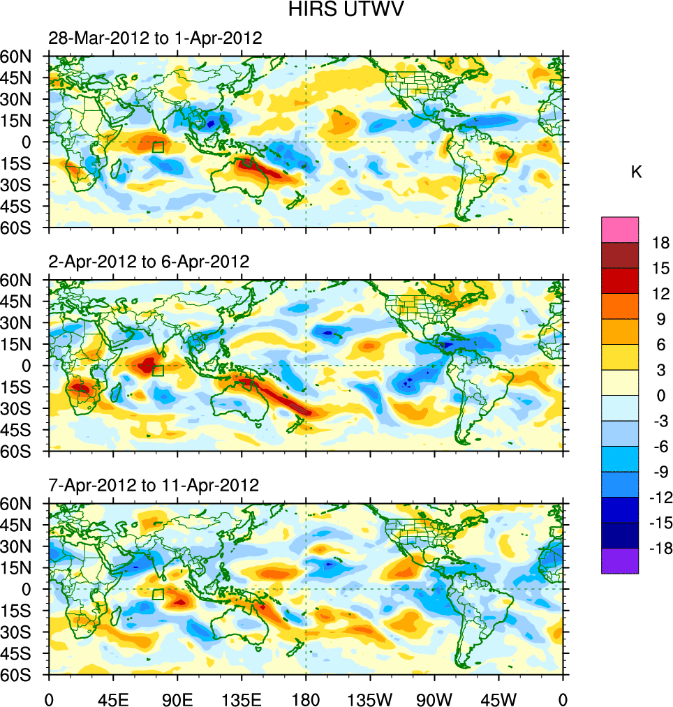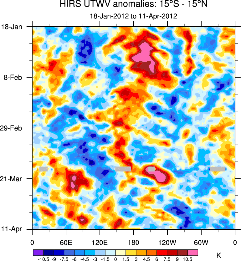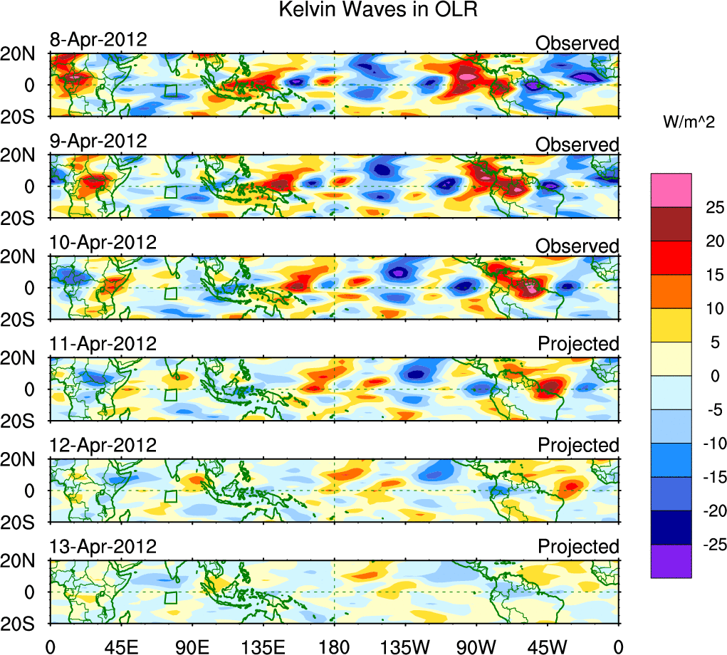 To identify tropical waves in near real-time, the OLR and UTWV data are filtered following Wheeler & Weickmann (2001 MWR). The daily anomalies are calculated using the first 3 harmonics of the seasonal cycle for 1979–2009. Missing values are then filled using linear interpolation in space and time. The most recent 365 days of anomalies are padded with 659 days of zeroes, and the result is filtered for each wave type.