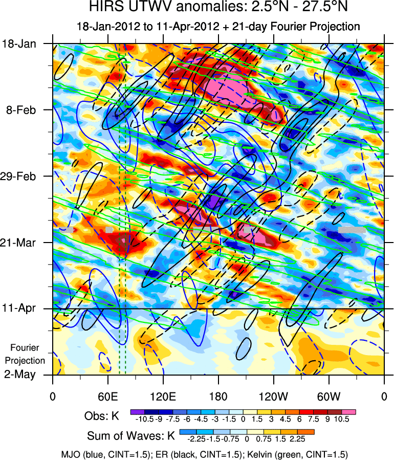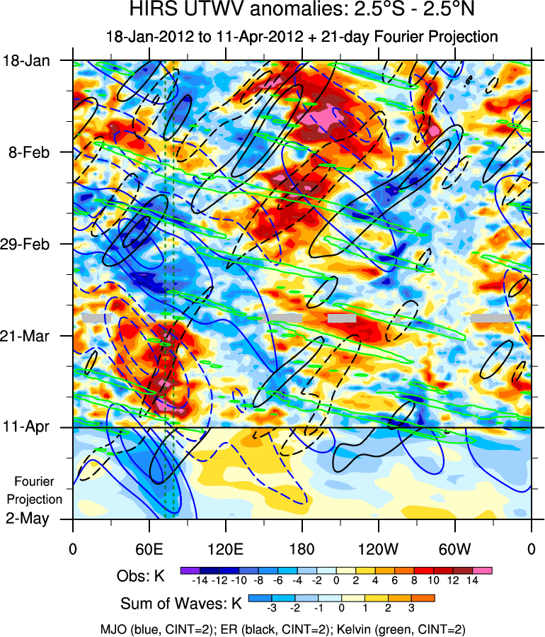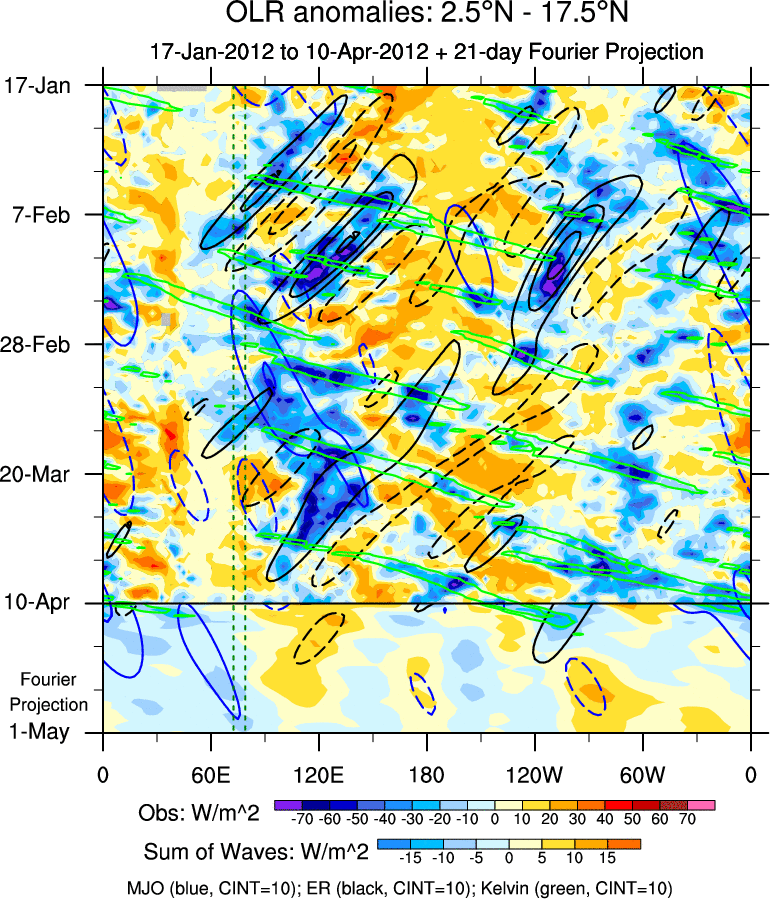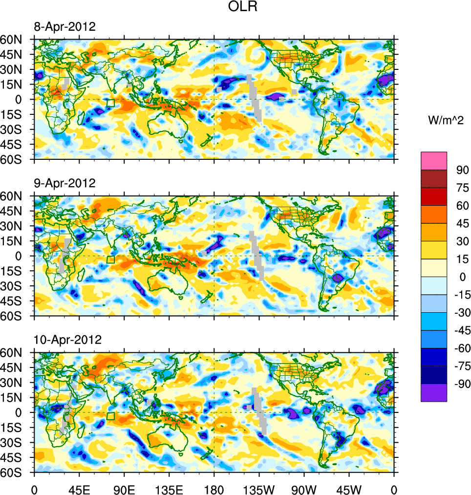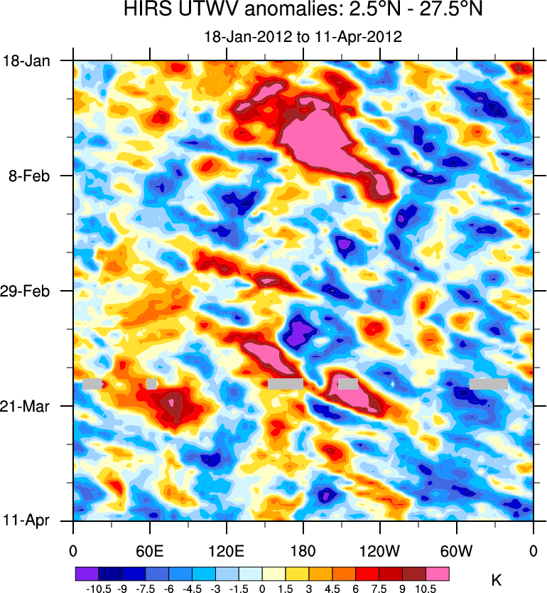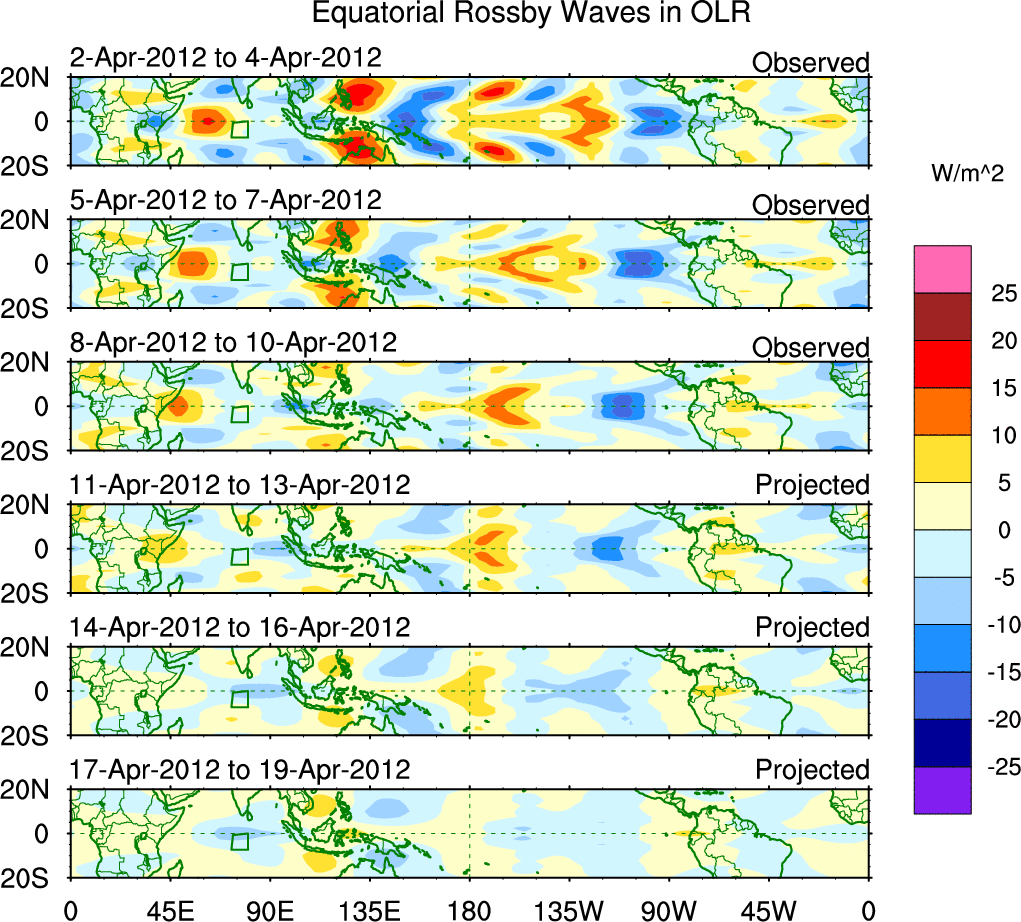 To identify tropical waves in near real-time, the OLR and UTWV data are filtered following Wheeler & Weickmann (2001 MWR). The daily anomalies are calculated using the first 3 harmonics of the seasonal cycle for 1979–2009. Missing values are then filled using linear interpolation in space and time. The most recent 365 days of anomalies are padded with 659 days of zeroes, and the result is filtered for each wave type.