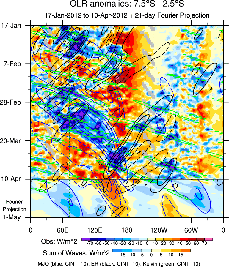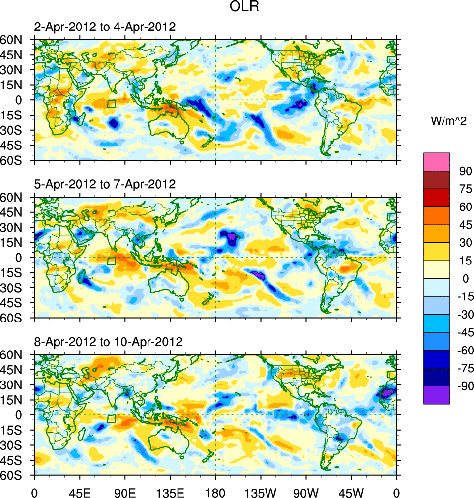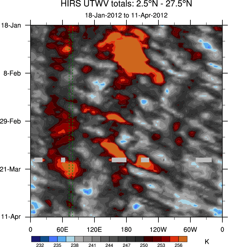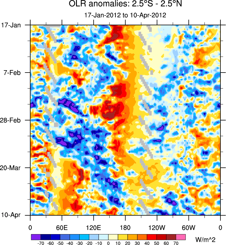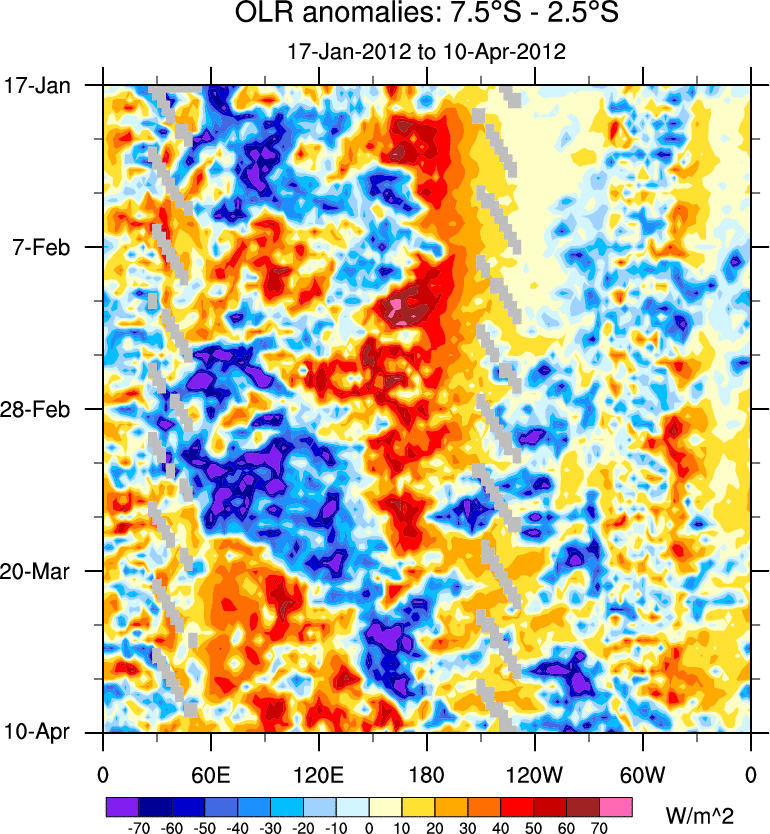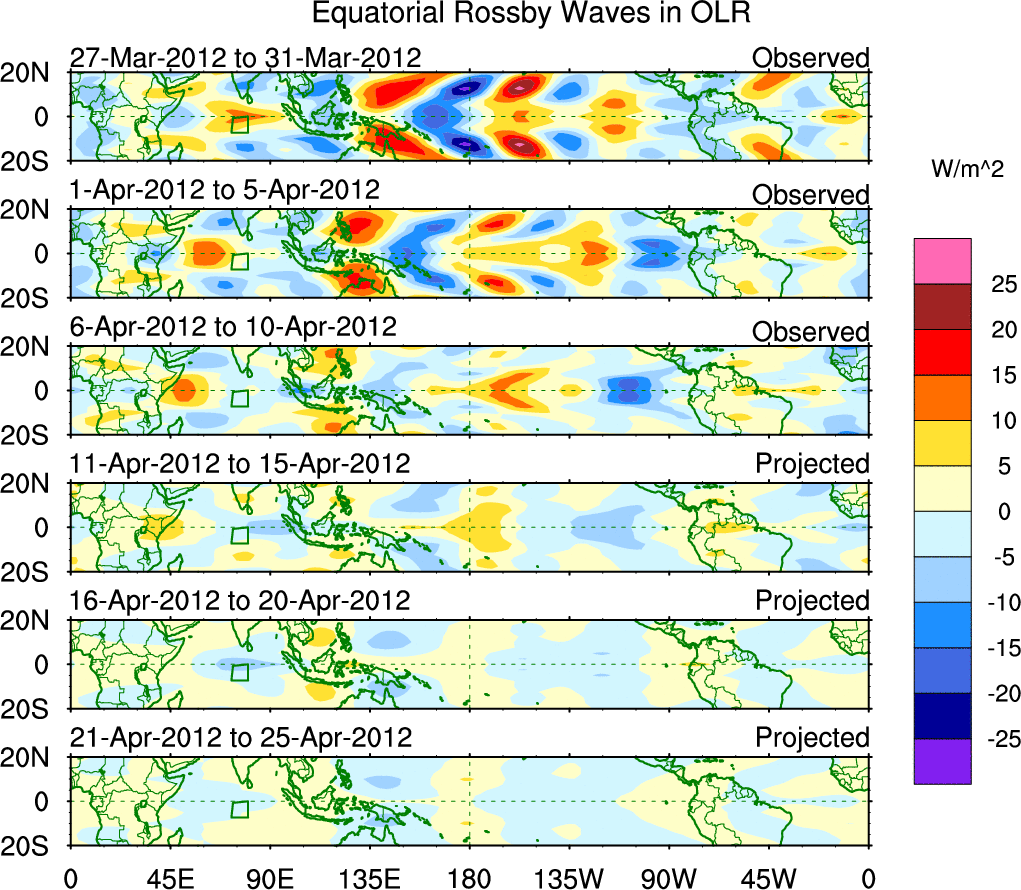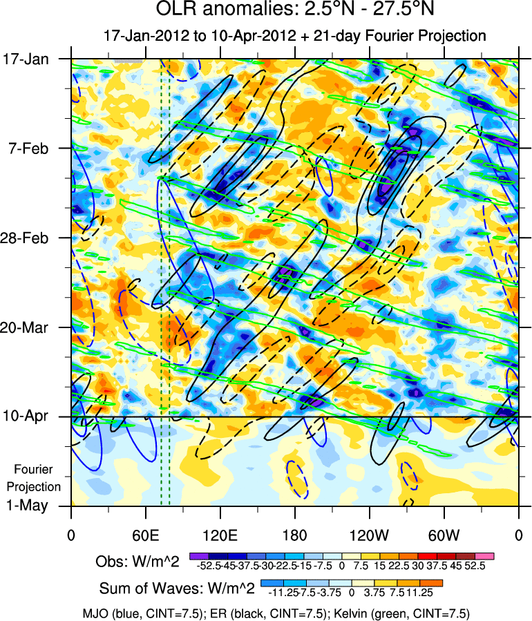 To identify tropical waves in near real-time, the OLR and UTWV data are filtered following Wheeler & Weickmann (2001 MWR). The daily anomalies are calculated using the first 3 harmonics of the seasonal cycle for 1979–2009. Missing values are then filled using linear interpolation in space and time. The most recent 365 days of anomalies are padded with 659 days of zeroes, and the result is filtered for each wave type.