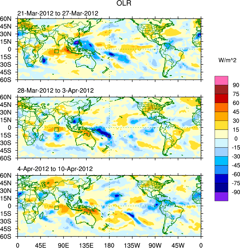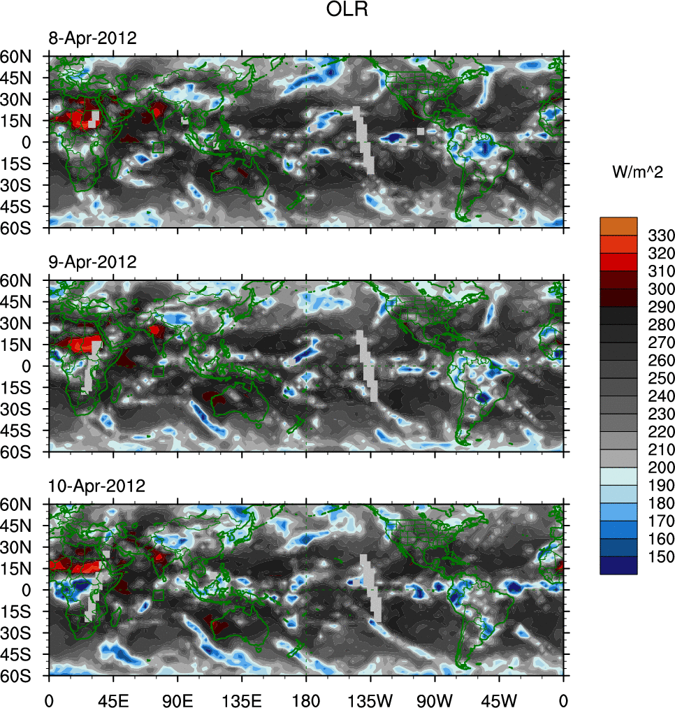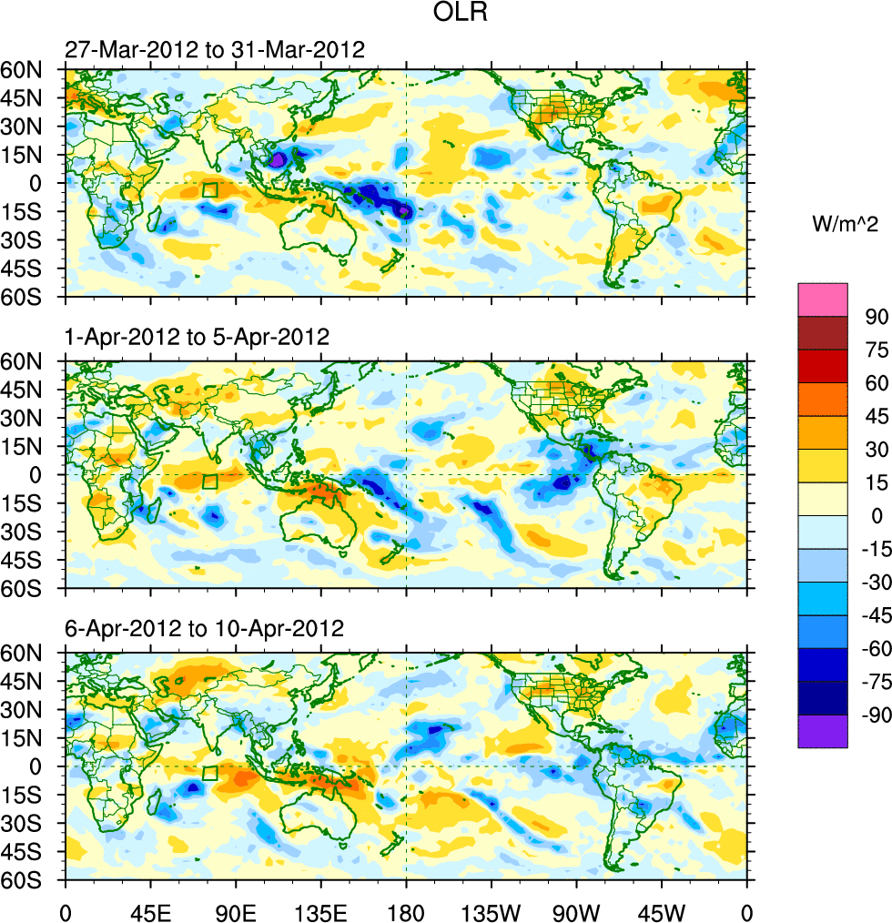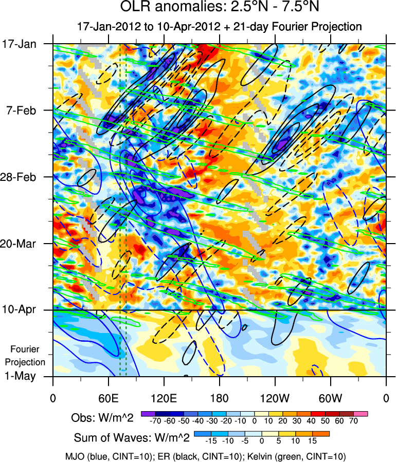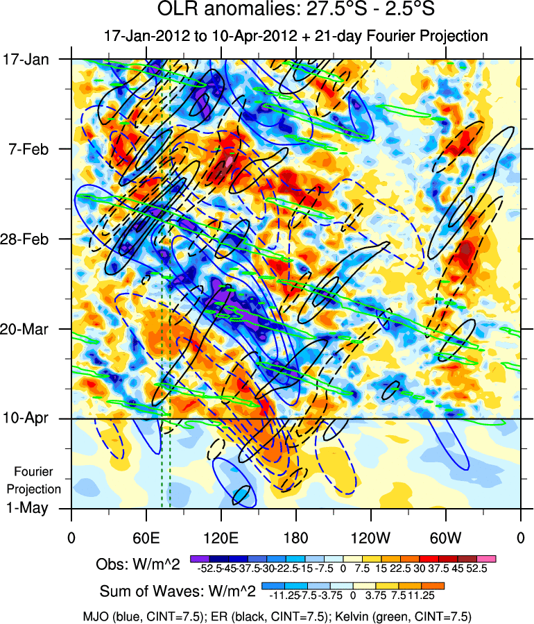To identify tropical waves in near real-time, the OLR and UTWV data are filtered following Wheeler & Weickmann (2001 MWR). The daily anomalies are calculated using the first 3 harmonics of the seasonal cycle for 1979–2009. Missing values are then filled using linear interpolation in space and time. The most recent 365 days of anomalies are padded with 659 days of zeroes, and the result is filtered for each wave type.