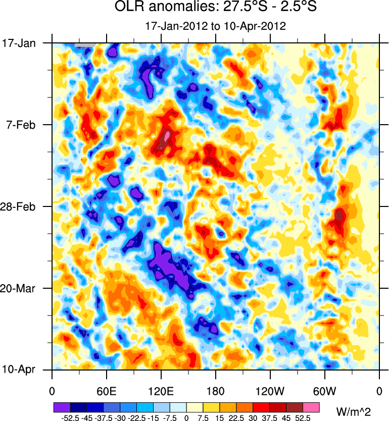 The figure above shows the wavenumber–frequency spectrum for OLR, divided by an estimate of the red background following Wheeler & Kiladis (1999, JAS). The panel on the left shows signals that are anti-symmetric about the equator, while the panel on the right shows those that are symmetric. Spectral peaks tend to lie along the dispersion curves for shallow water equatorial waves (black lines).
