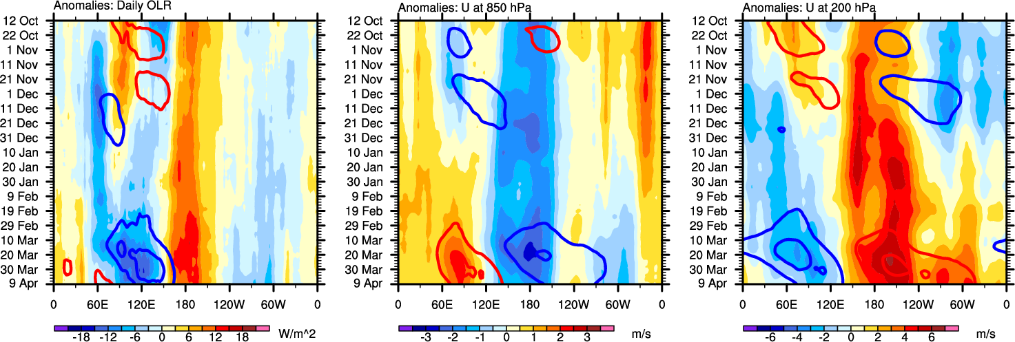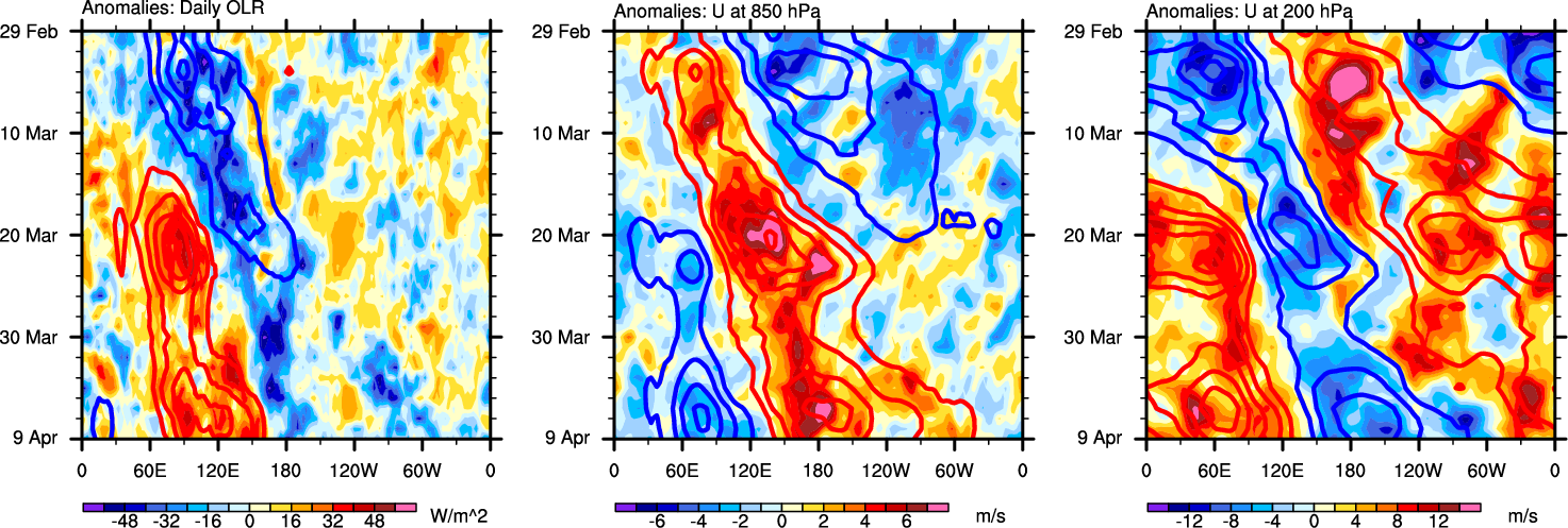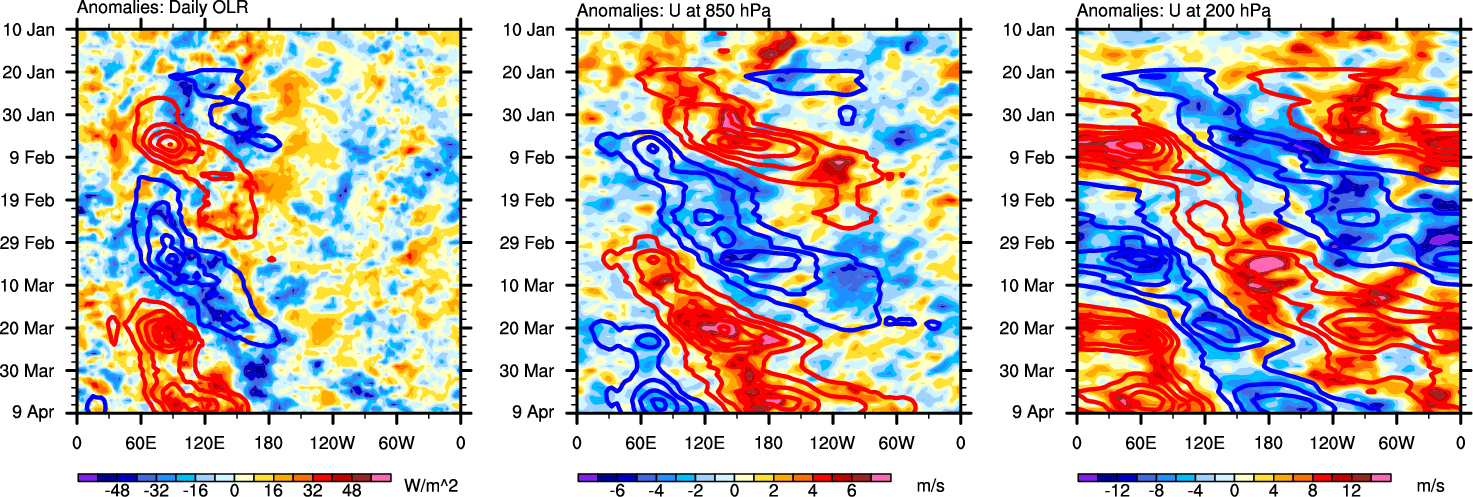 The Hovmollers show longitude-time plots for OLR, U-850, and U-200. The shading indicates the observed anomalies, while the contours are the projection of those anomalies onto the RMM EOFs.