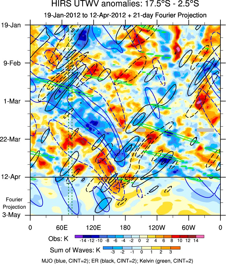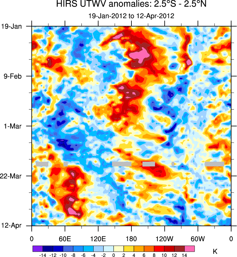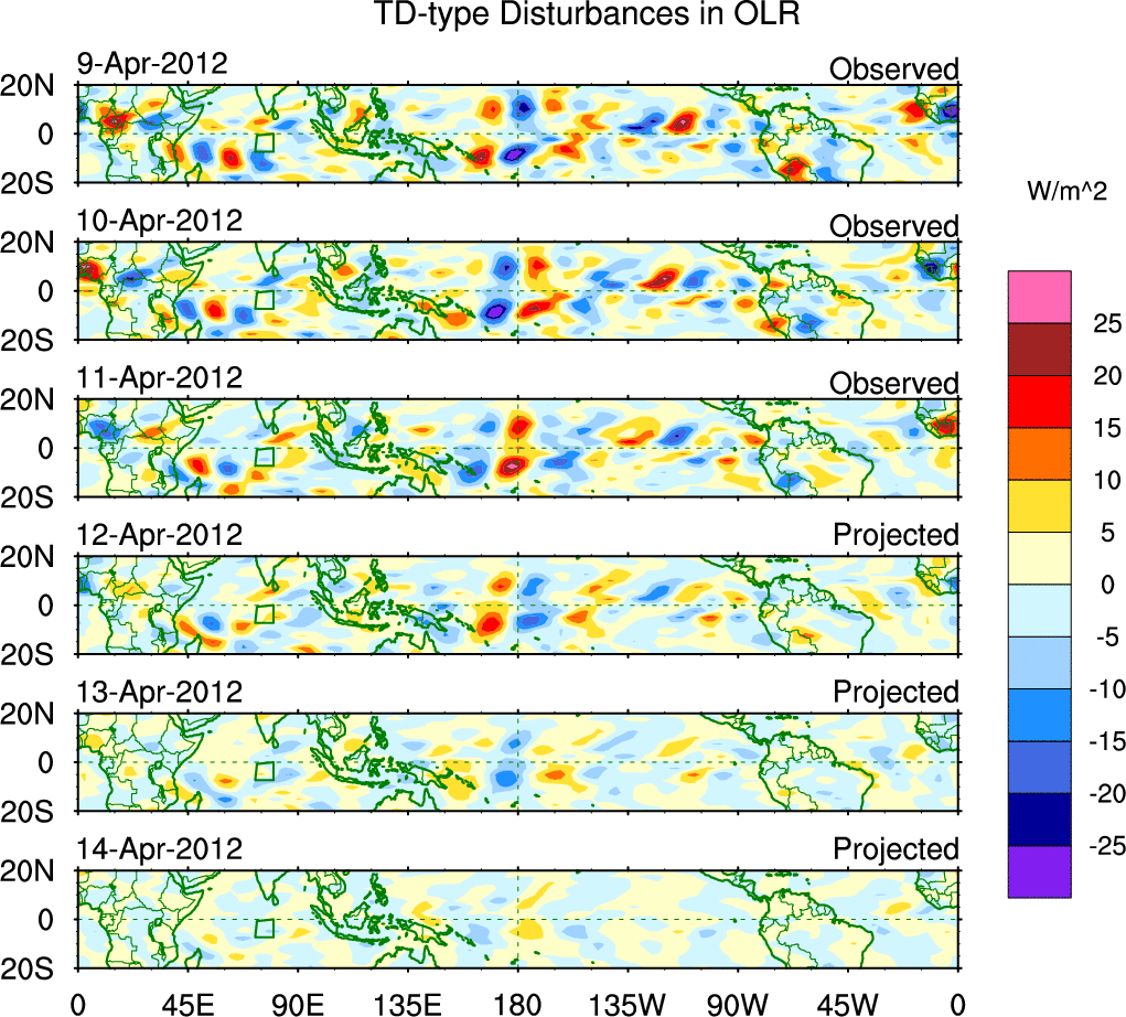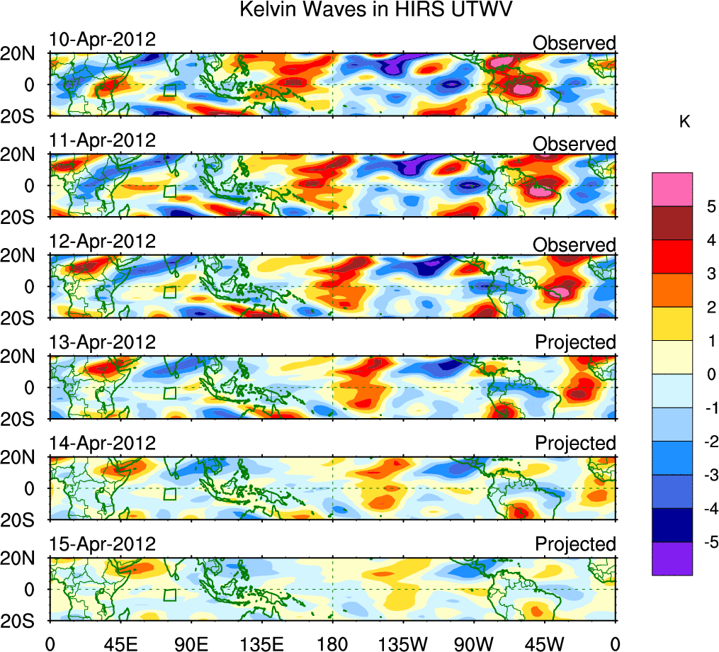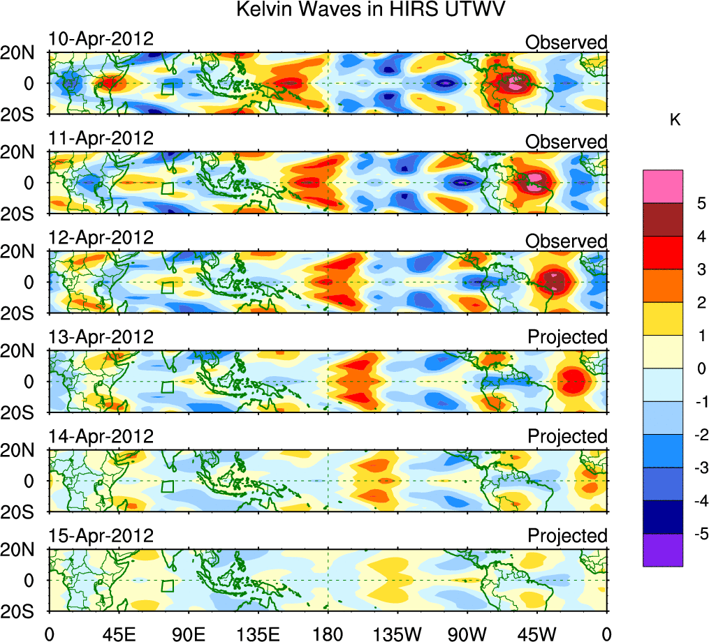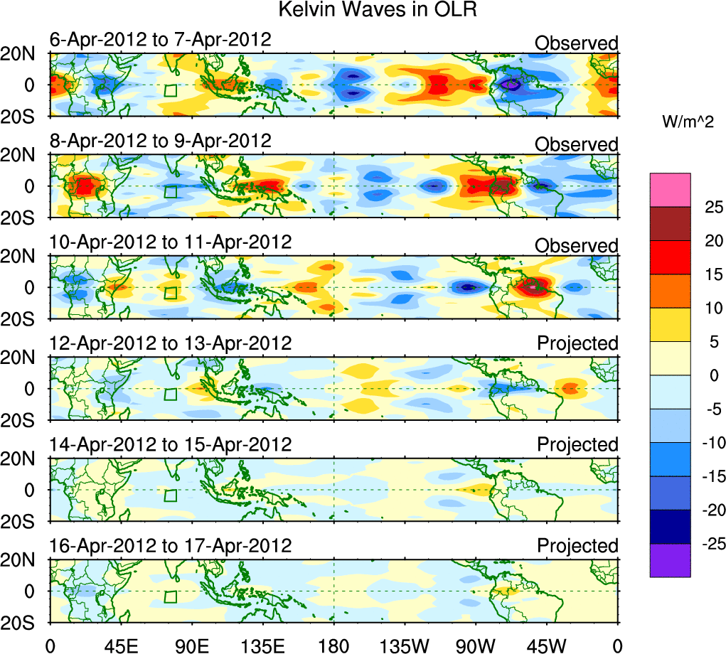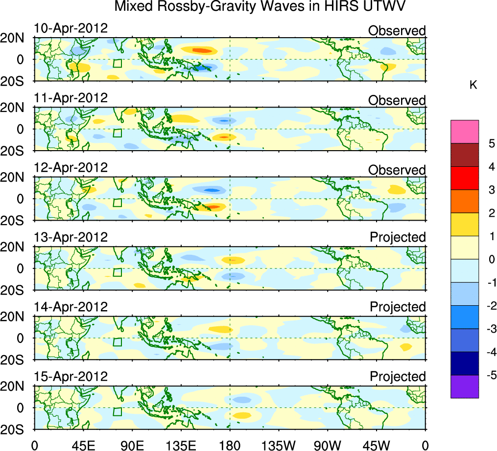 To identify tropical waves in near real-time, the OLR and UTWV data are filtered following Wheeler & Weickmann (2001 MWR). The daily anomalies are calculated using the first 3 harmonics of the seasonal cycle for 1979–2009. Missing values are then filled using linear interpolation in space and time. The most recent 365 days of anomalies are padded with 659 days of zeroes, and the result is filtered for each wave type.