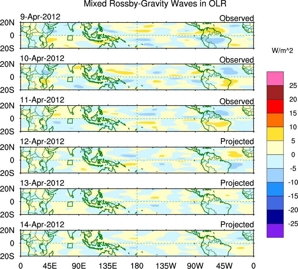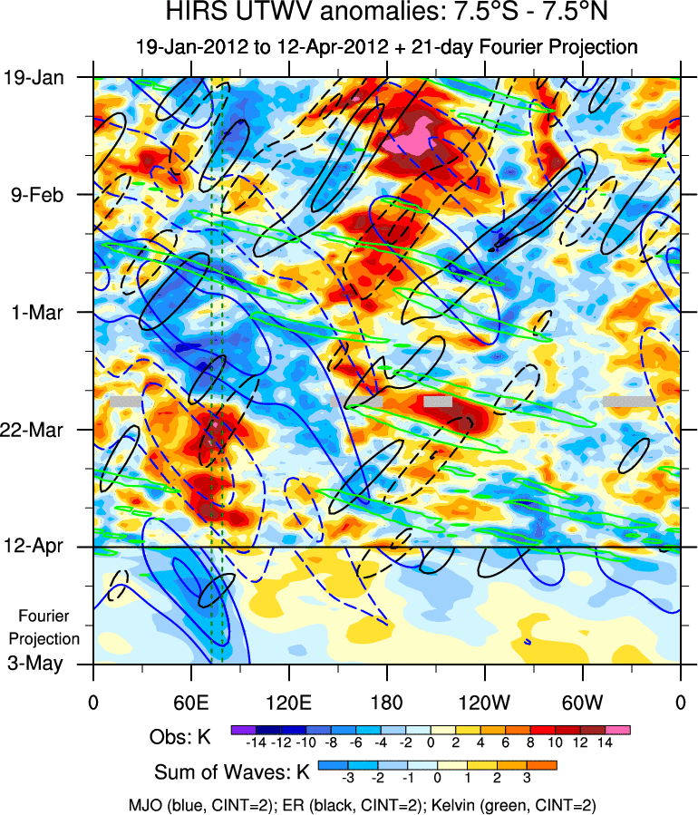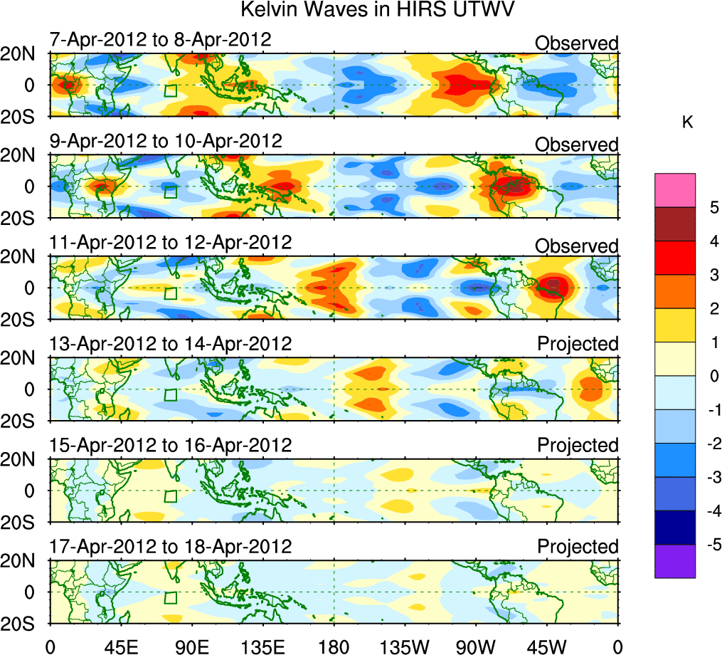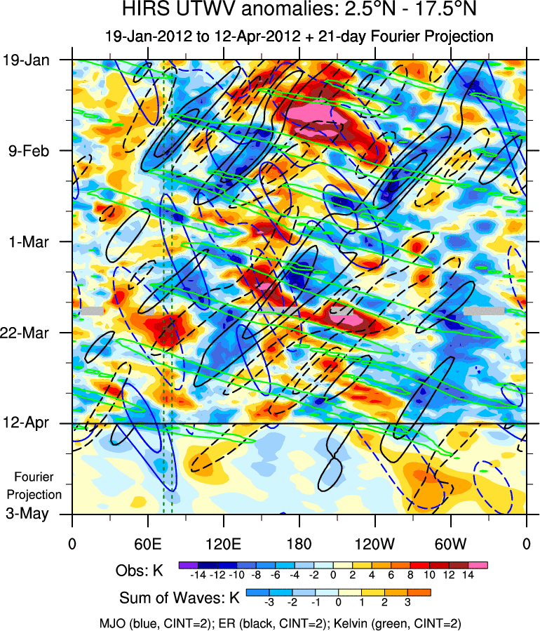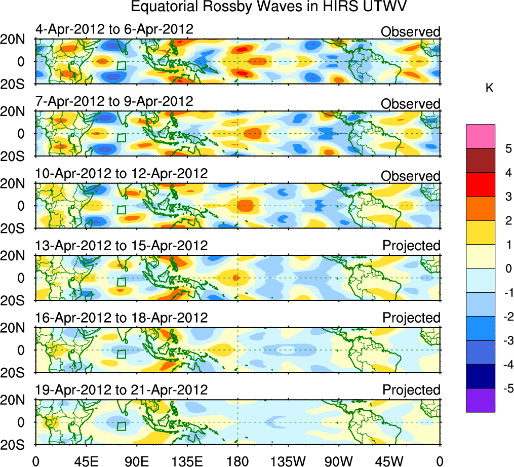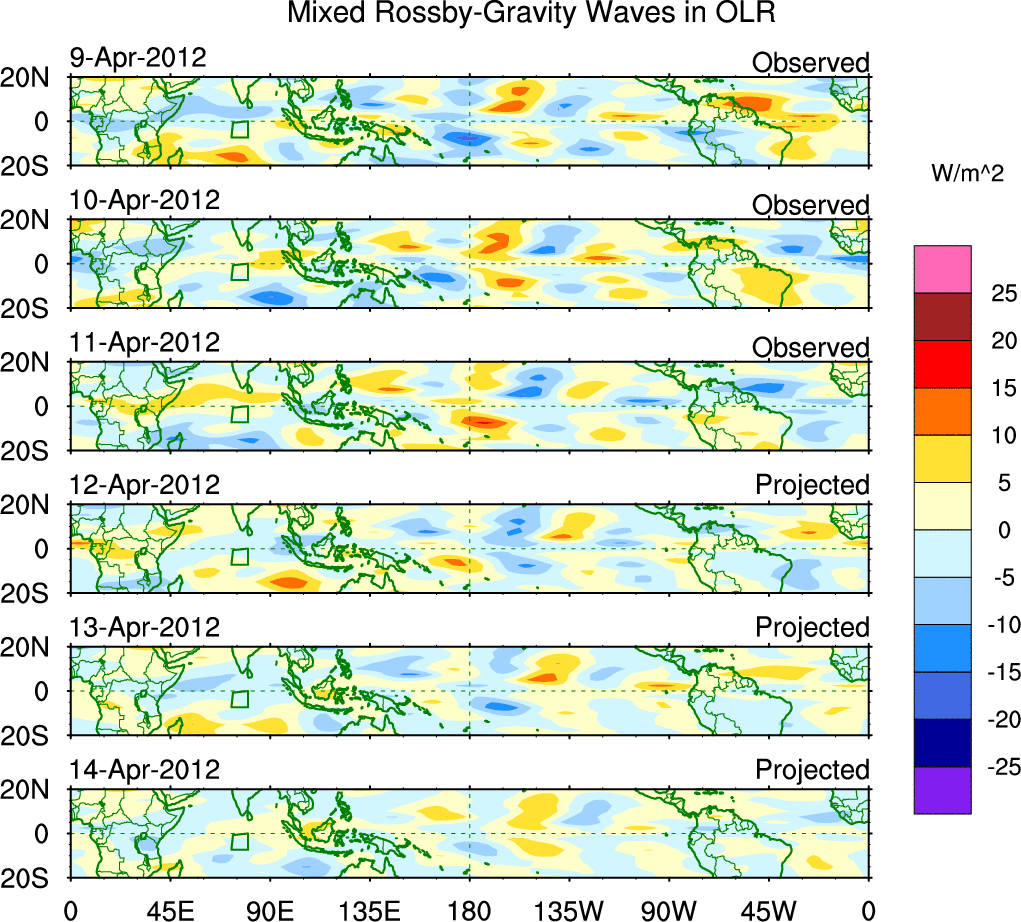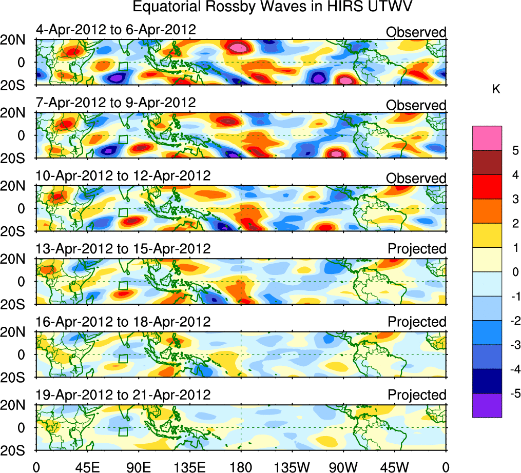 To identify tropical waves in near real-time, the OLR and UTWV data are filtered following Wheeler & Weickmann (2001 MWR). The daily anomalies are calculated using the first 3 harmonics of the seasonal cycle for 1979–2009. Missing values are then filled using linear interpolation in space and time. The most recent 365 days of anomalies are padded with 659 days of zeroes, and the result is filtered for each wave type.