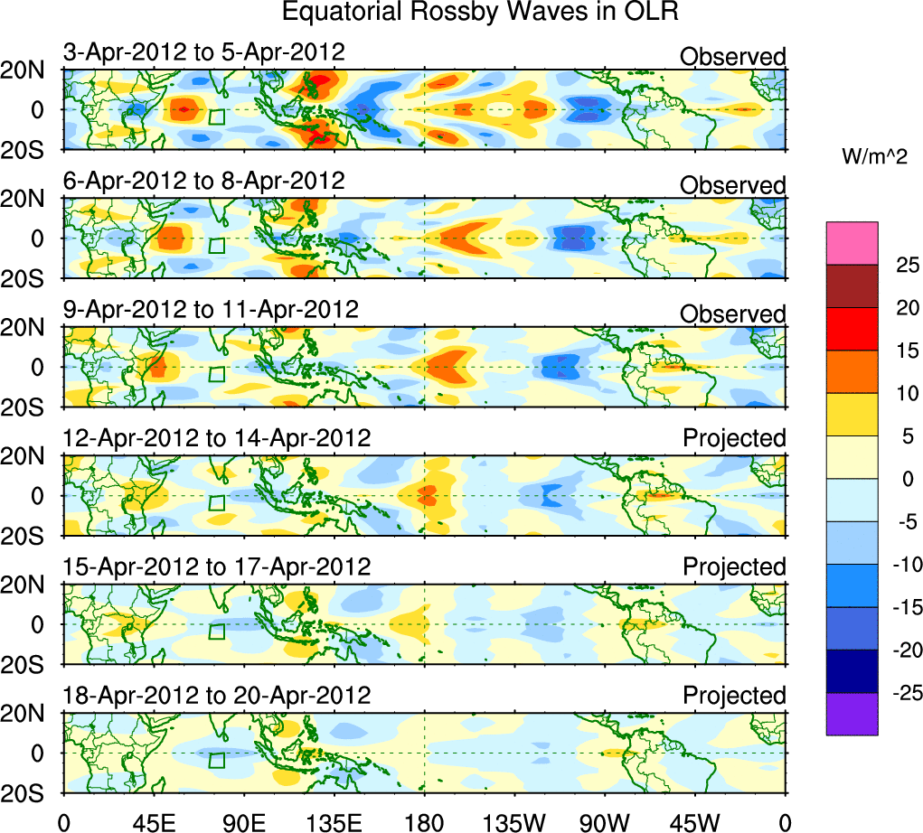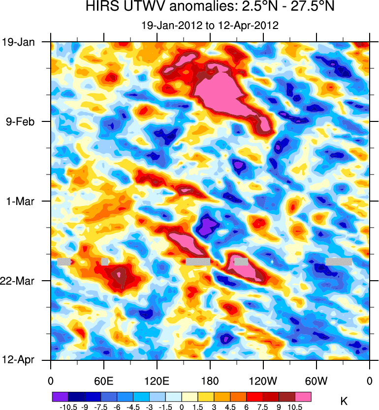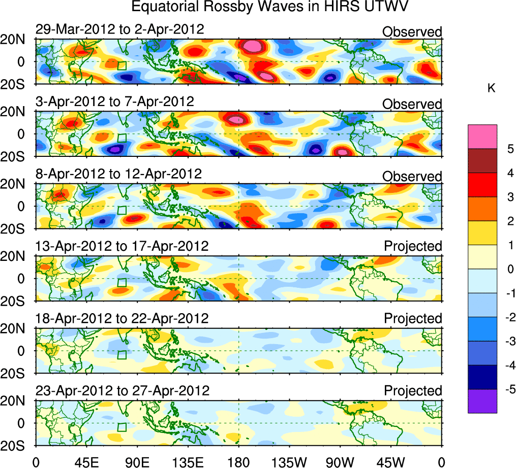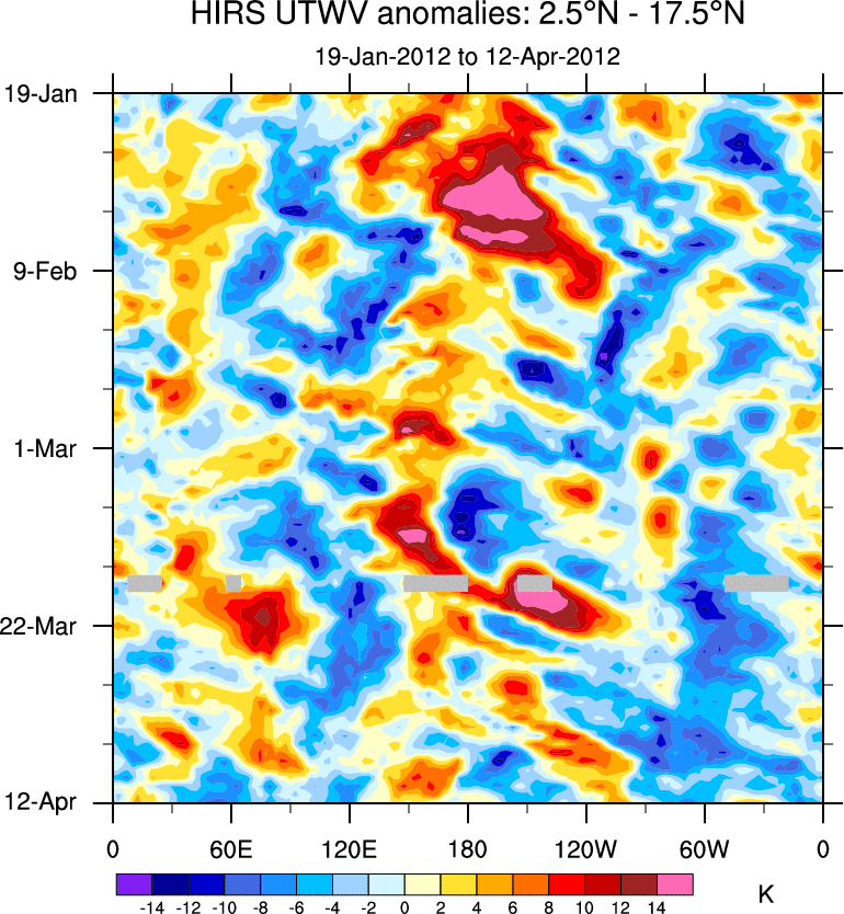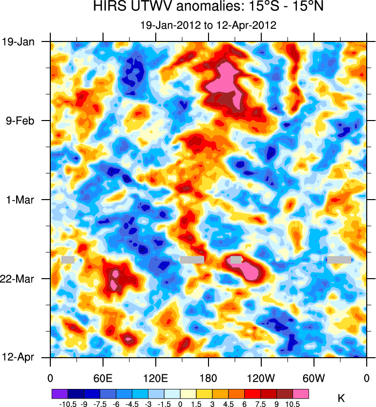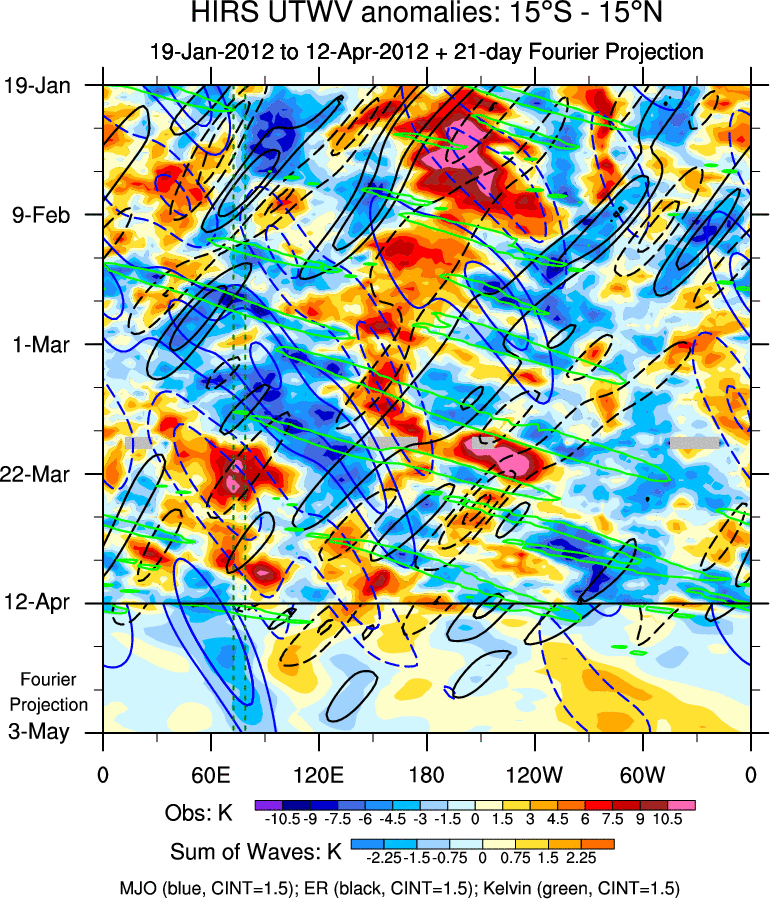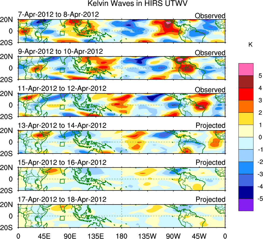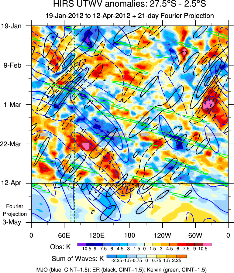 To identify tropical waves in near real-time, the OLR and UTWV data are filtered following Wheeler & Weickmann (2001 MWR). The daily anomalies are calculated using the first 3 harmonics of the seasonal cycle for 1979–2009. Missing values are then filled using linear interpolation in space and time. The most recent 365 days of anomalies are padded with 659 days of zeroes, and the result is filtered for each wave type.