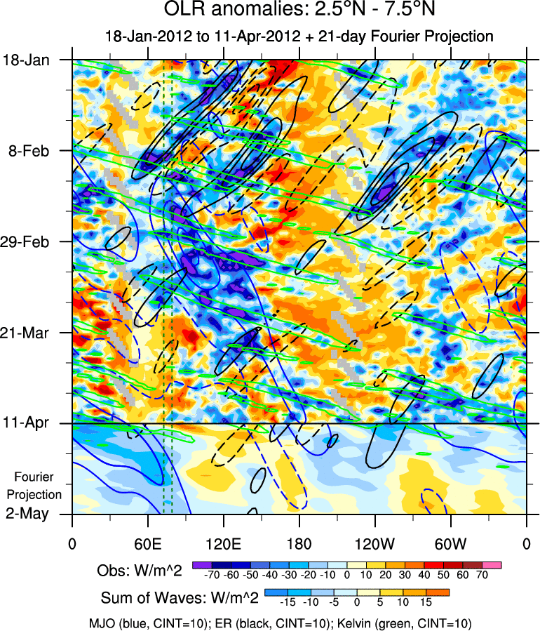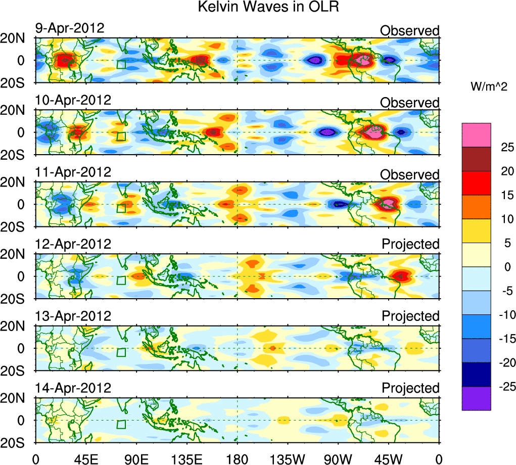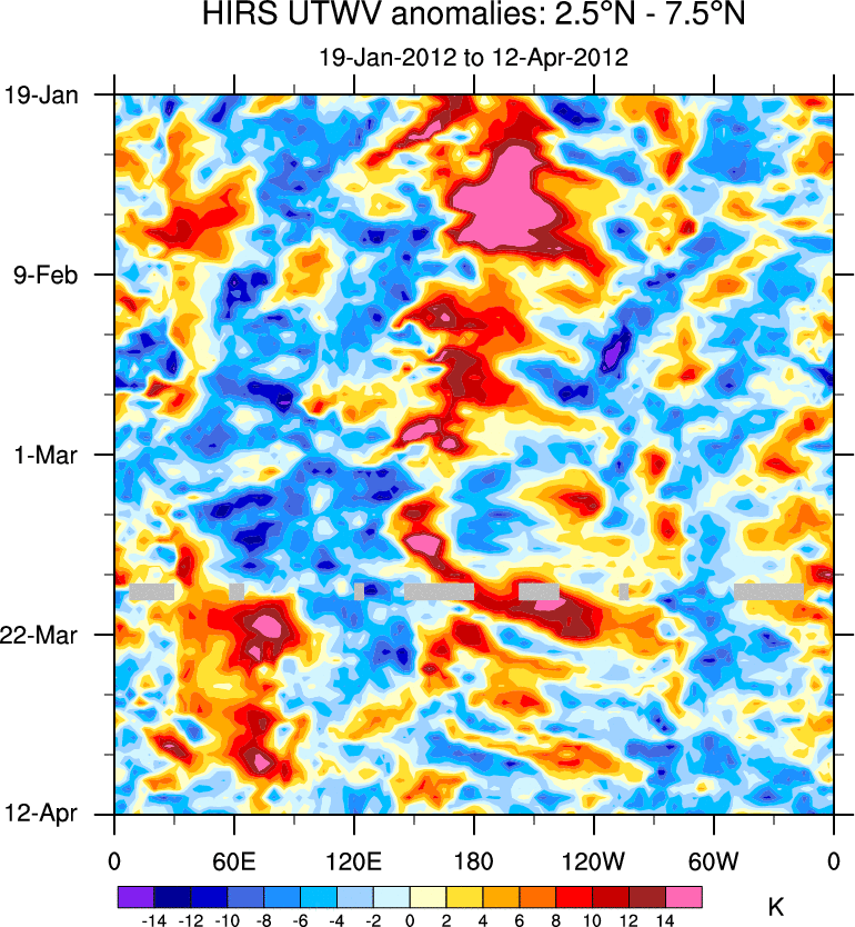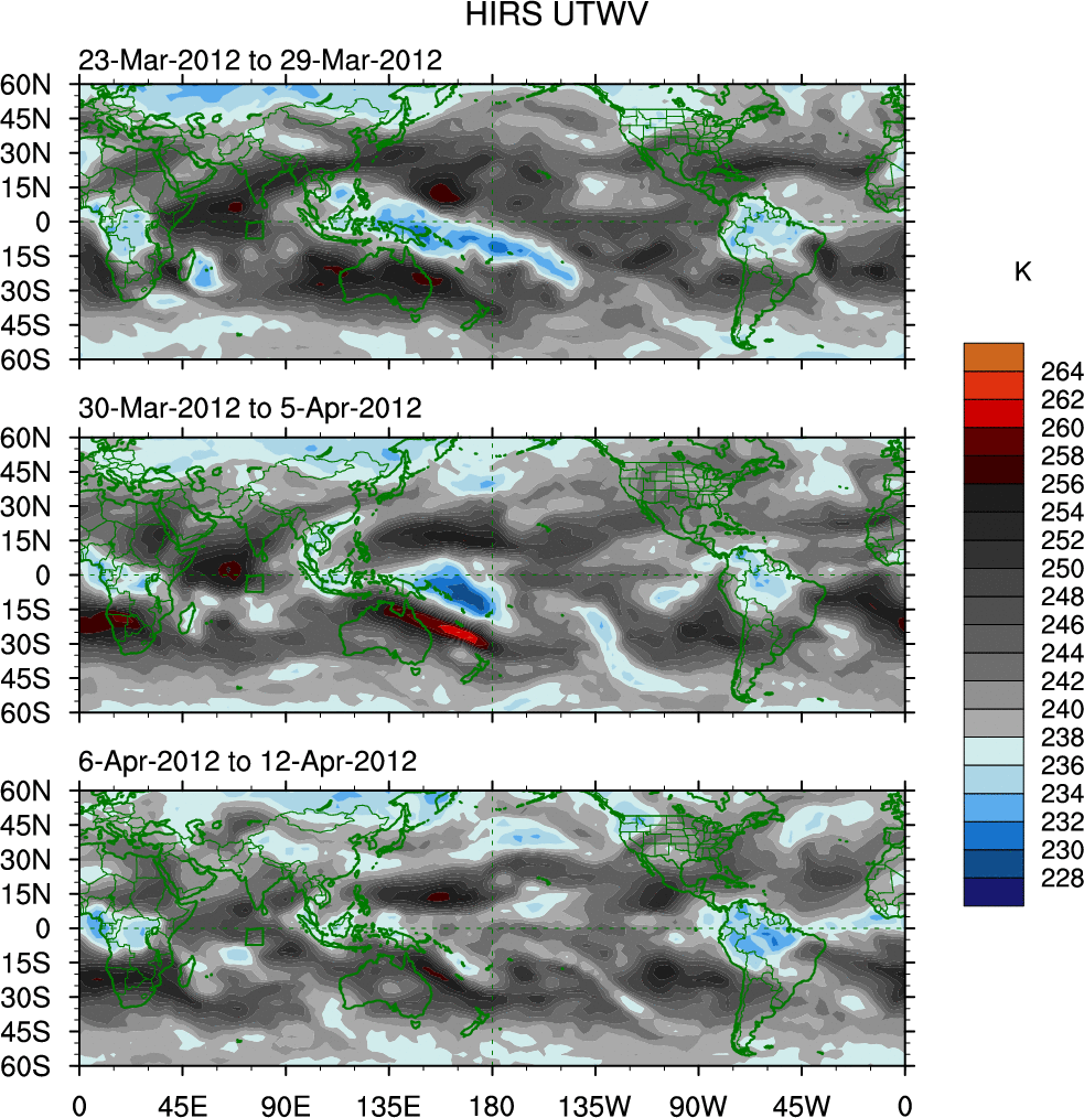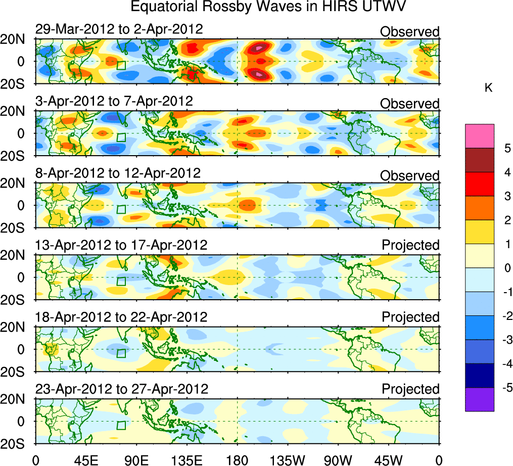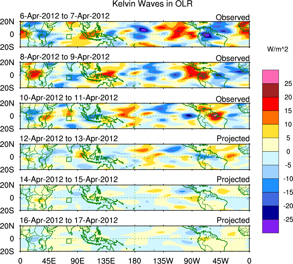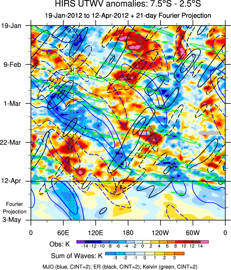 To identify tropical waves in near real-time, the OLR and UTWV data are filtered following Wheeler & Weickmann (2001 MWR). The daily anomalies are calculated using the first 3 harmonics of the seasonal cycle for 1979–2009. Missing values are then filled using linear interpolation in space and time. The most recent 365 days of anomalies are padded with 659 days of zeroes, and the result is filtered for each wave type.