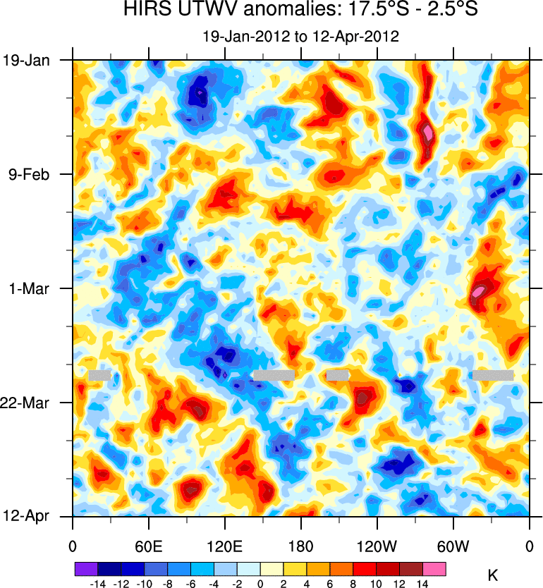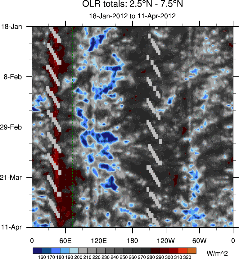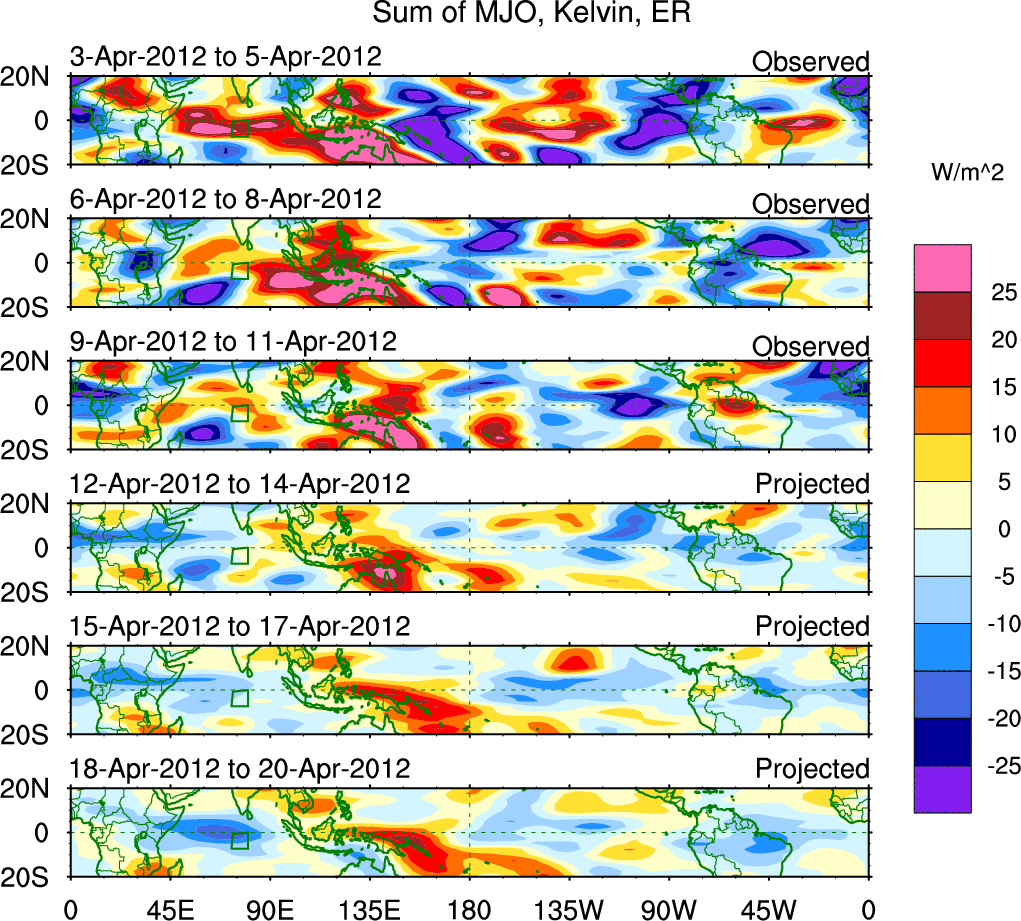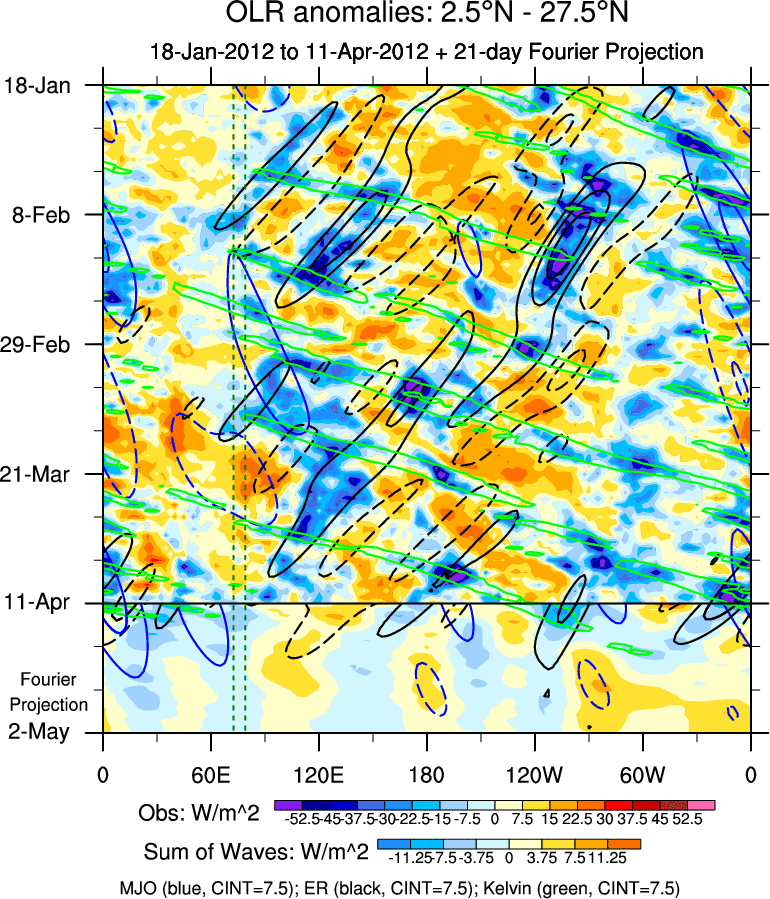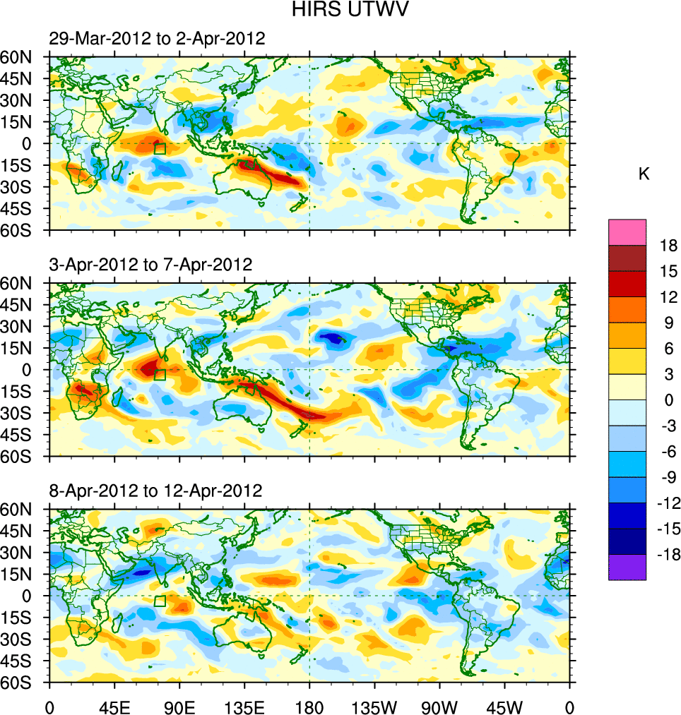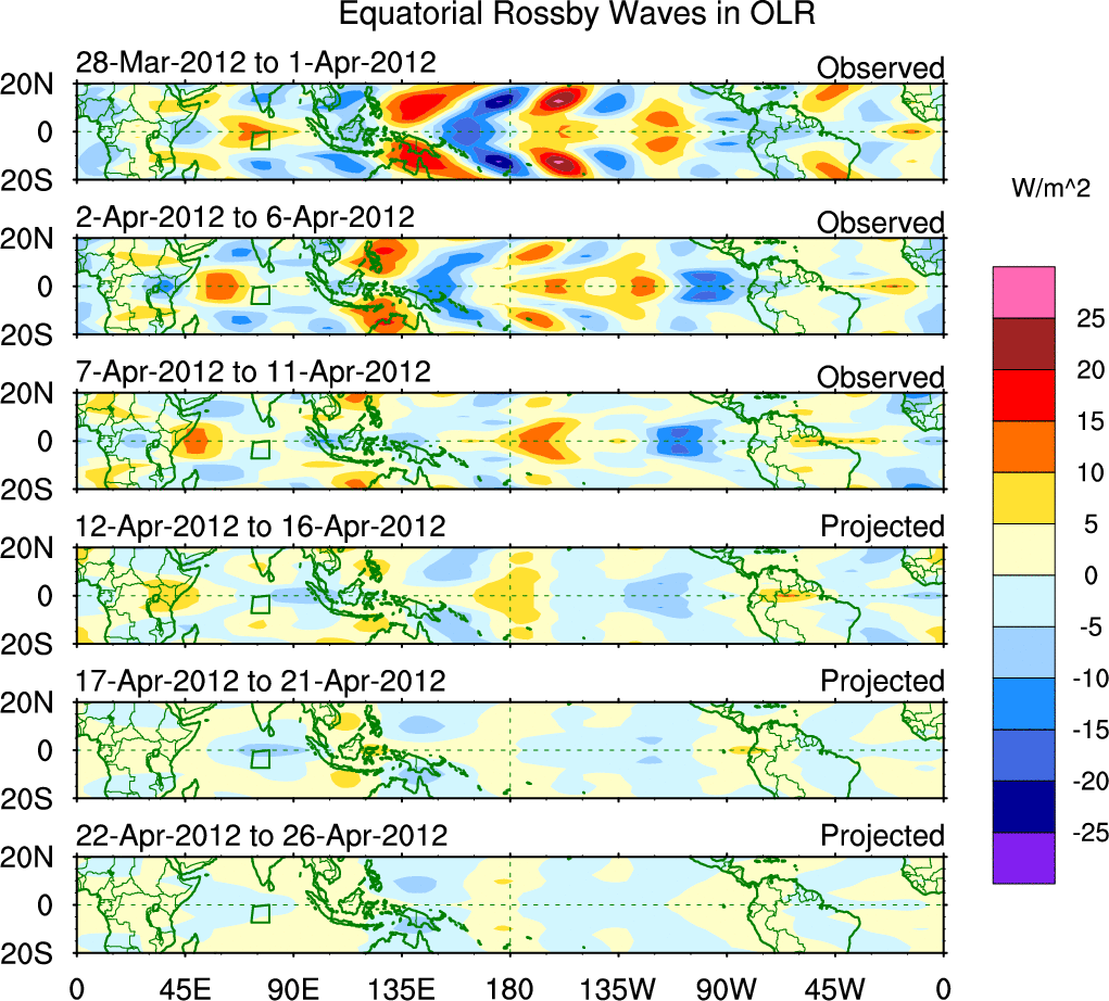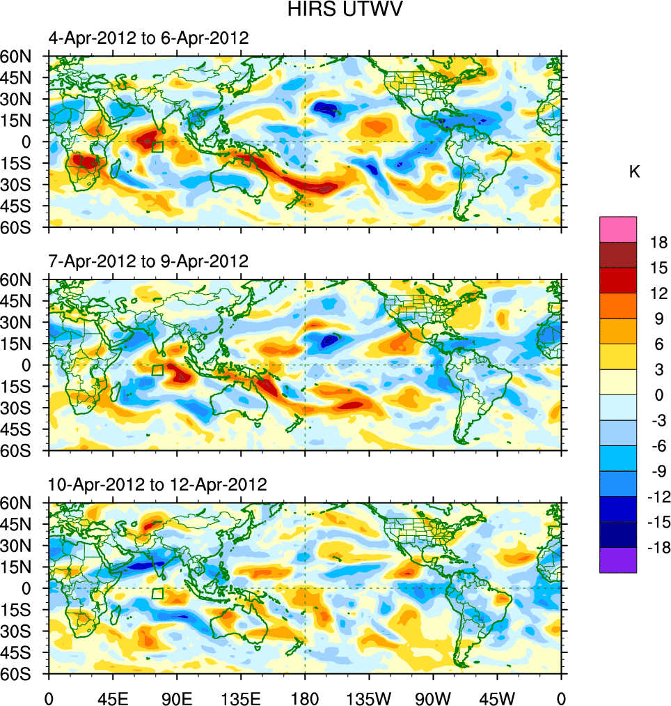 To identify tropical waves in near real-time, the OLR and UTWV data are filtered following Wheeler & Weickmann (2001 MWR). The daily anomalies are calculated using the first 3 harmonics of the seasonal cycle for 1979–2009. Missing values are then filled using linear interpolation in space and time. The most recent 365 days of anomalies are padded with 659 days of zeroes, and the result is filtered for each wave type.