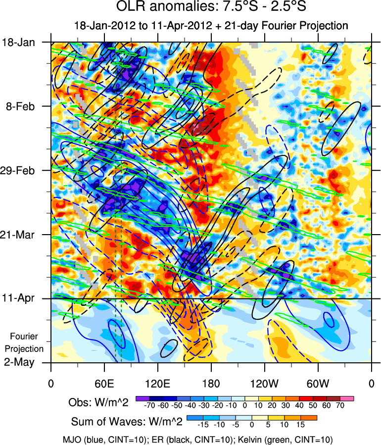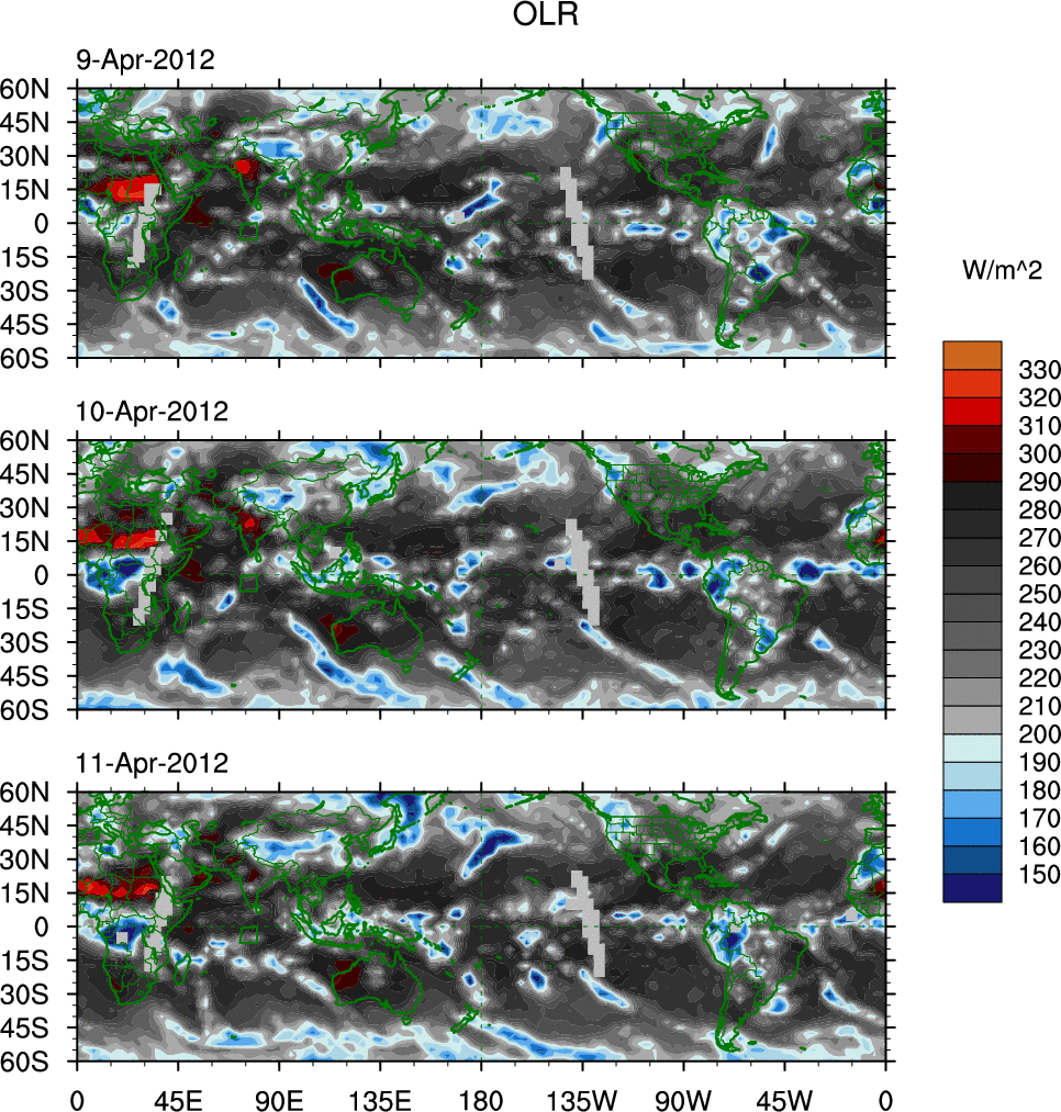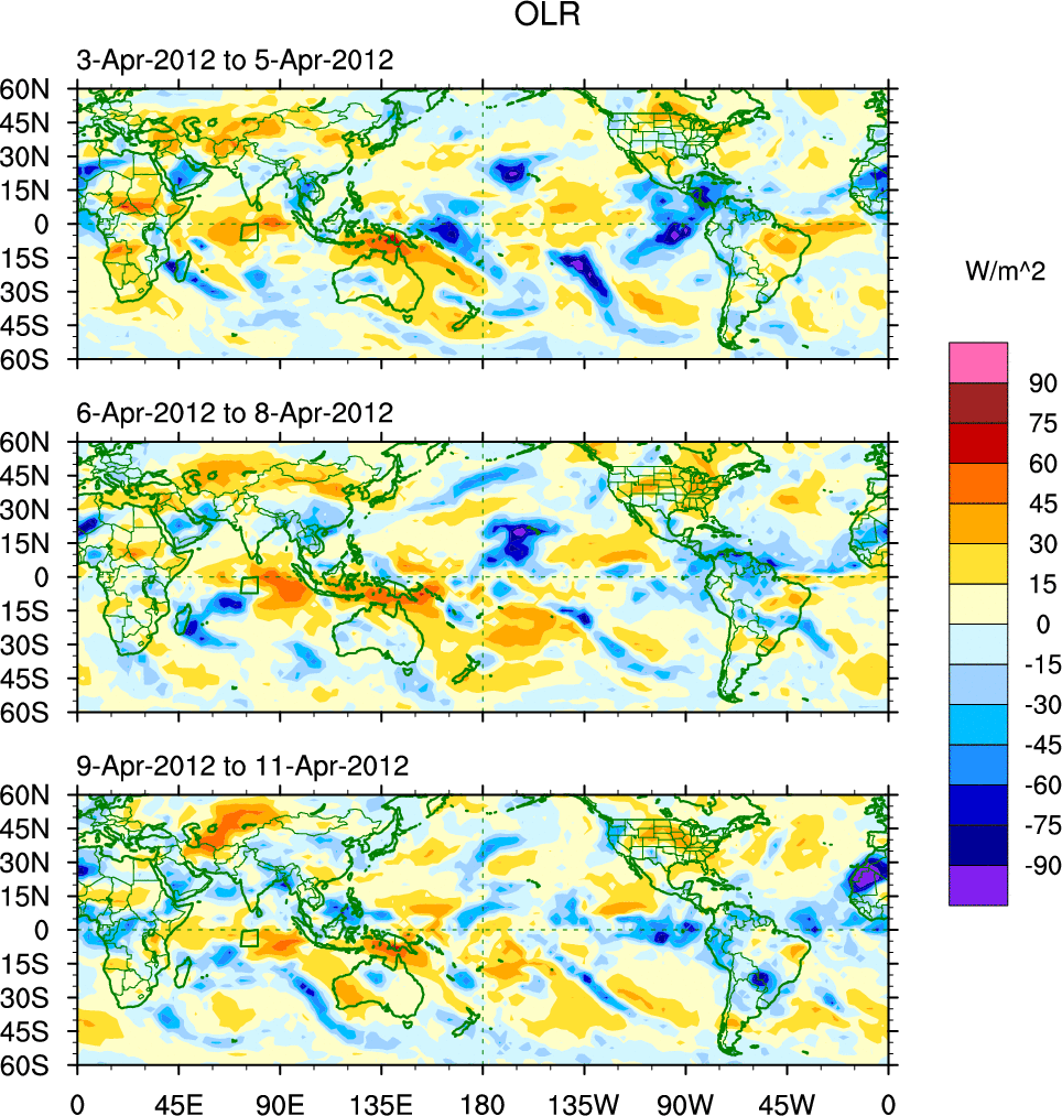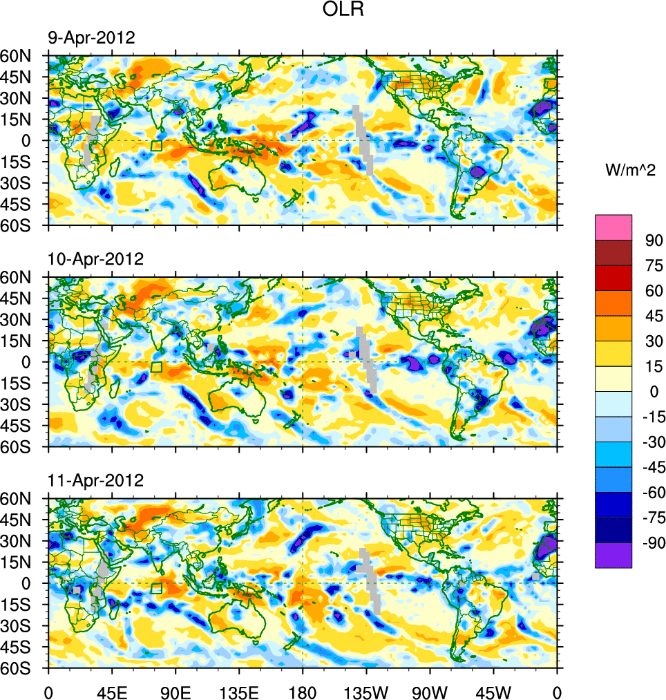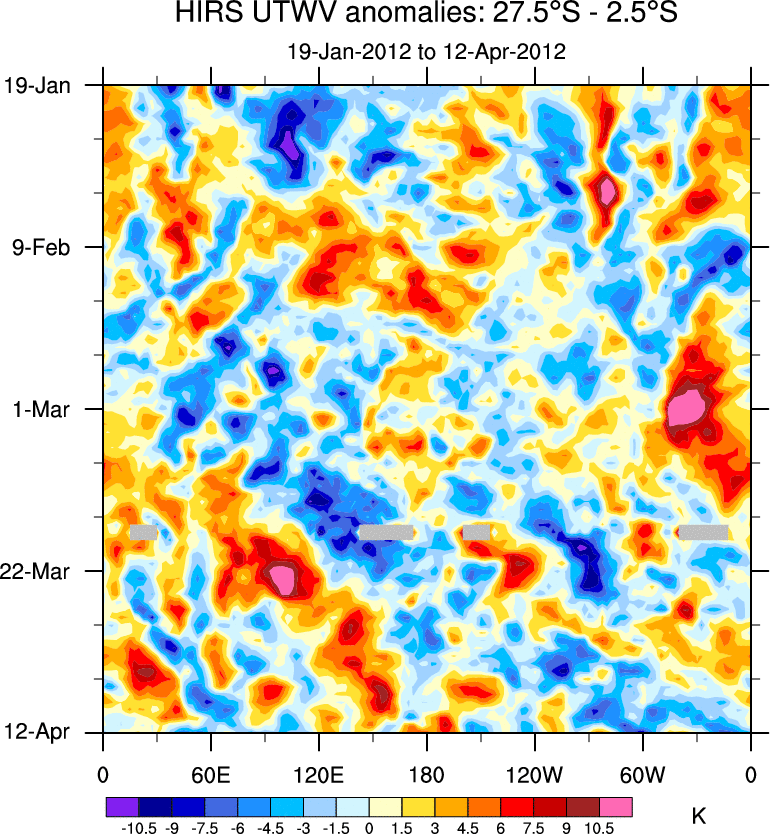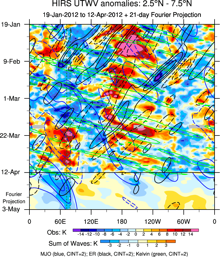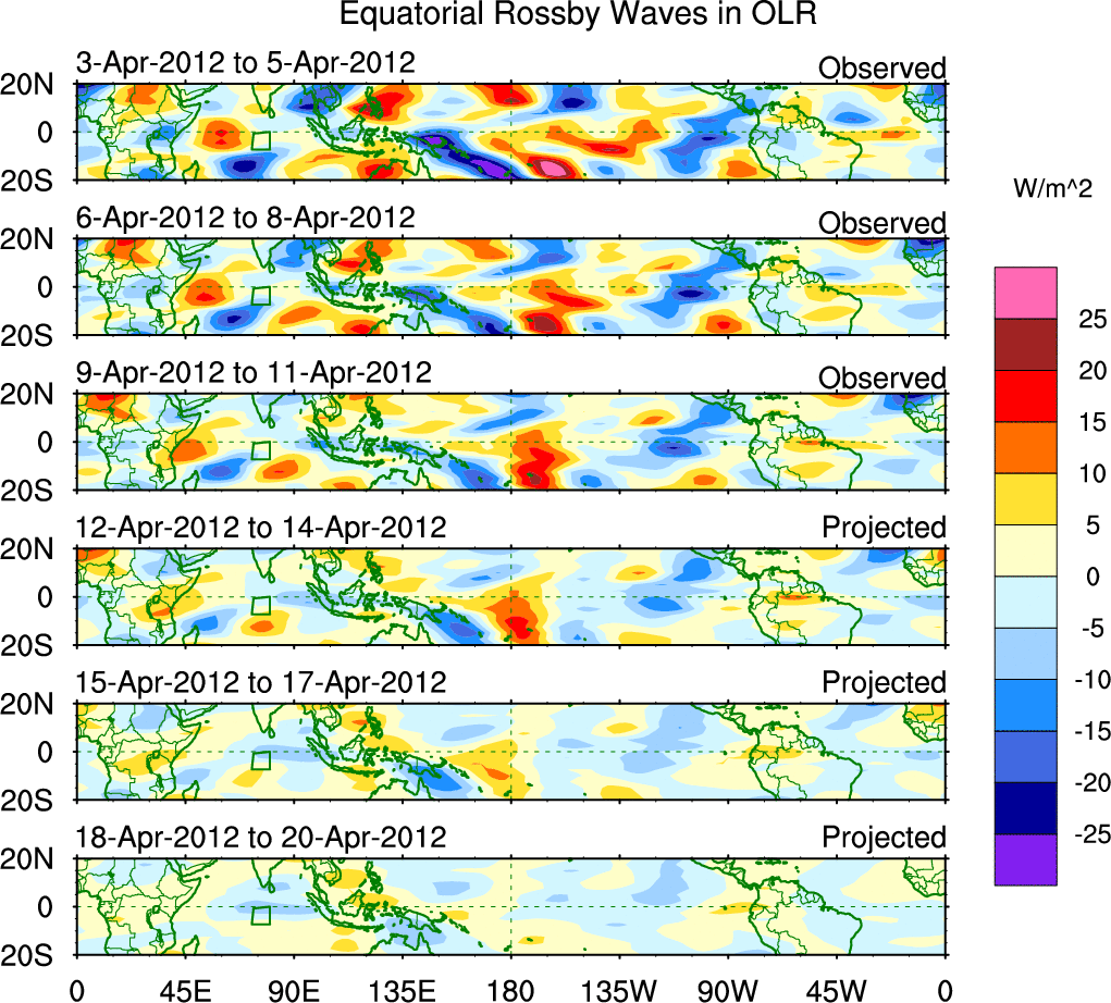 To identify tropical waves in near real-time, the OLR and UTWV data are filtered following Wheeler & Weickmann (2001 MWR). The daily anomalies are calculated using the first 3 harmonics of the seasonal cycle for 1979–2009. Missing values are then filled using linear interpolation in space and time. The most recent 365 days of anomalies are padded with 659 days of zeroes, and the result is filtered for each wave type.