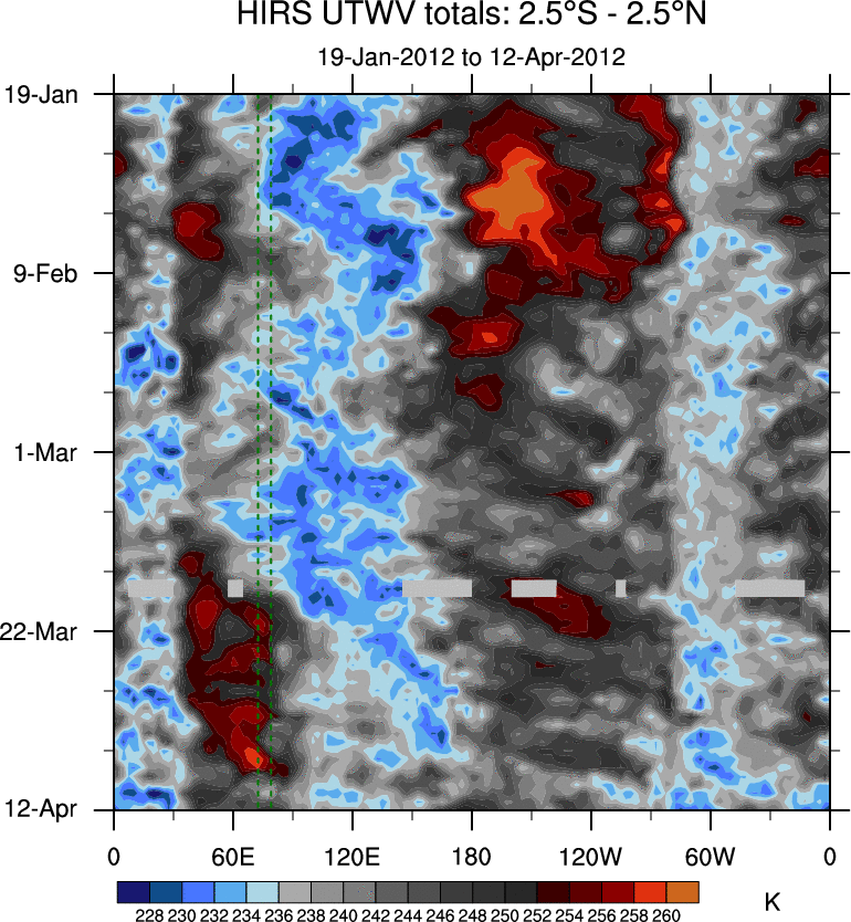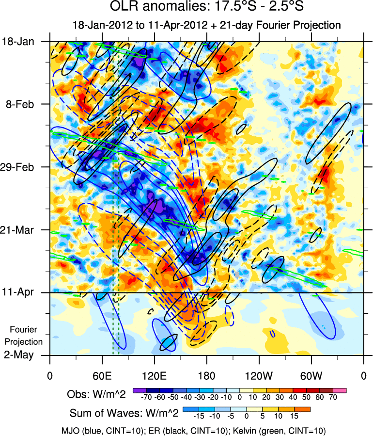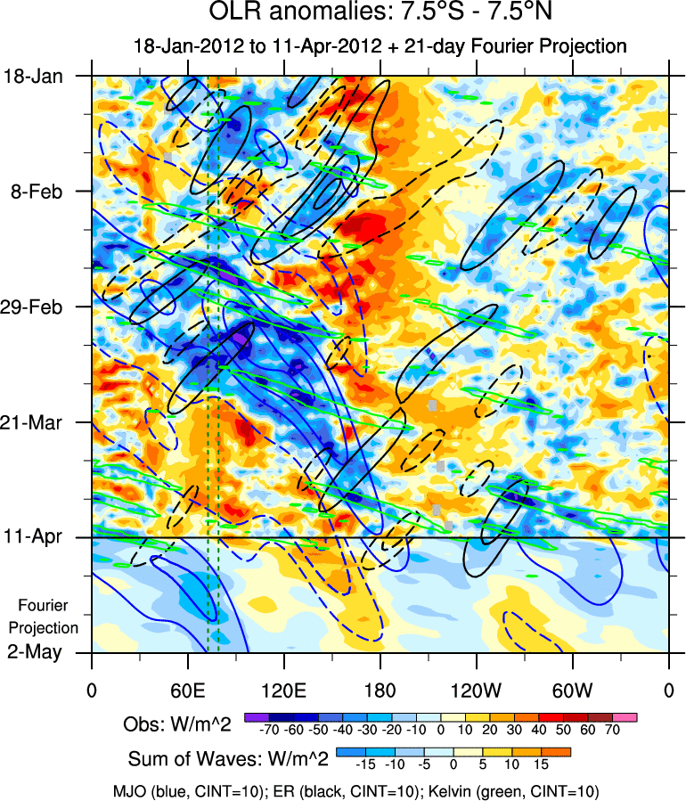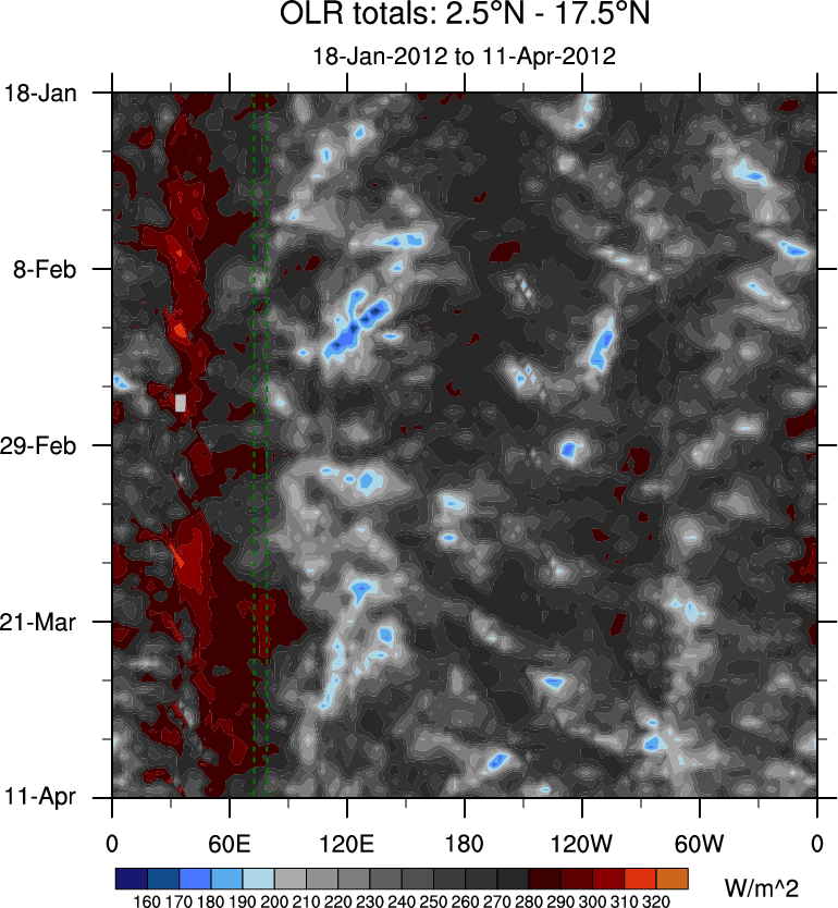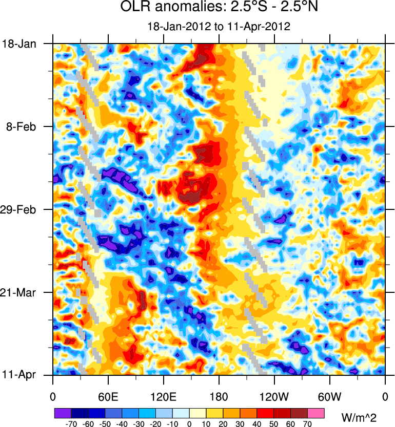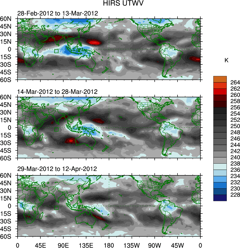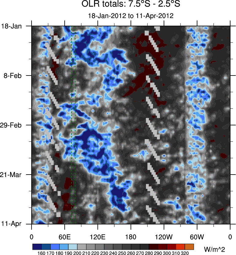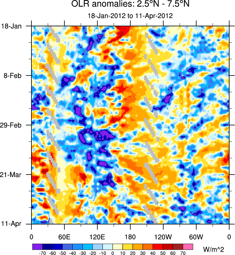 To identify tropical waves in near real-time, the OLR and UTWV data are filtered following Wheeler & Weickmann (2001 MWR). The daily anomalies are calculated using the first 3 harmonics of the seasonal cycle for 1979–2009. Missing values are then filled using linear interpolation in space and time. The most recent 365 days of anomalies are padded with 659 days of zeroes, and the result is filtered for each wave type.