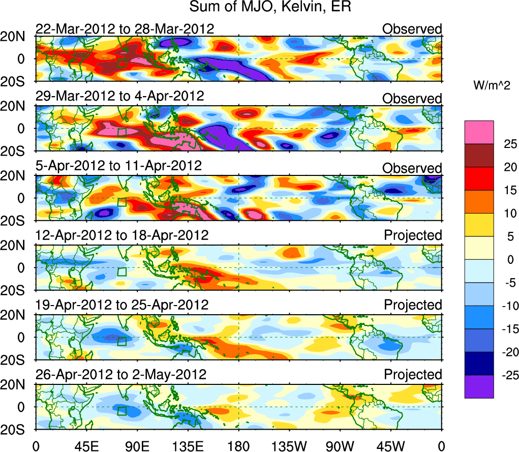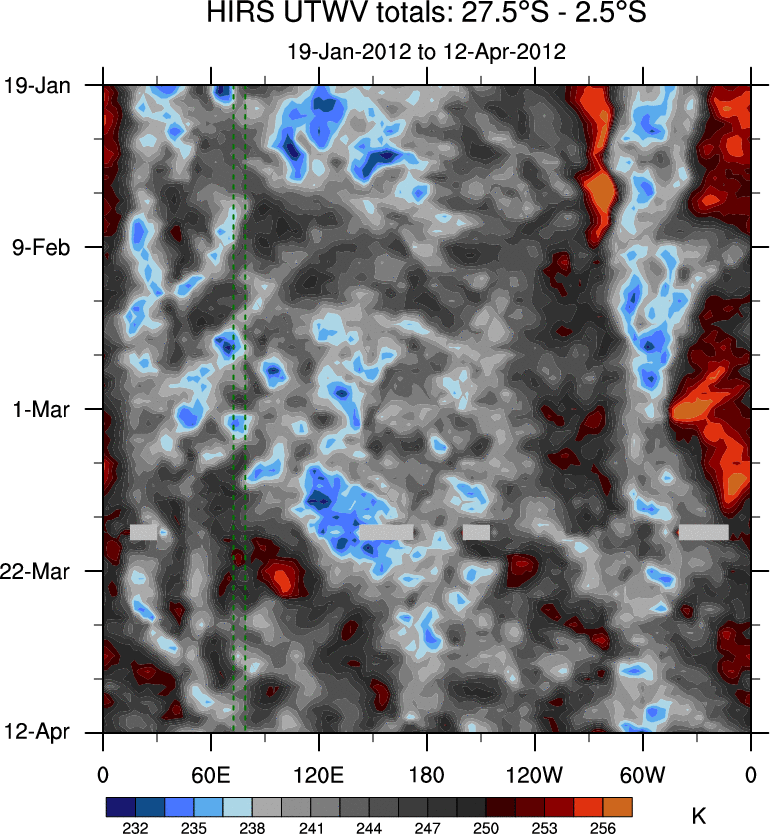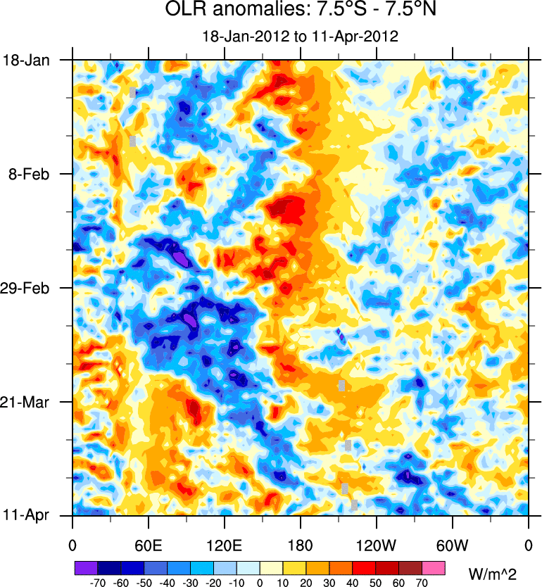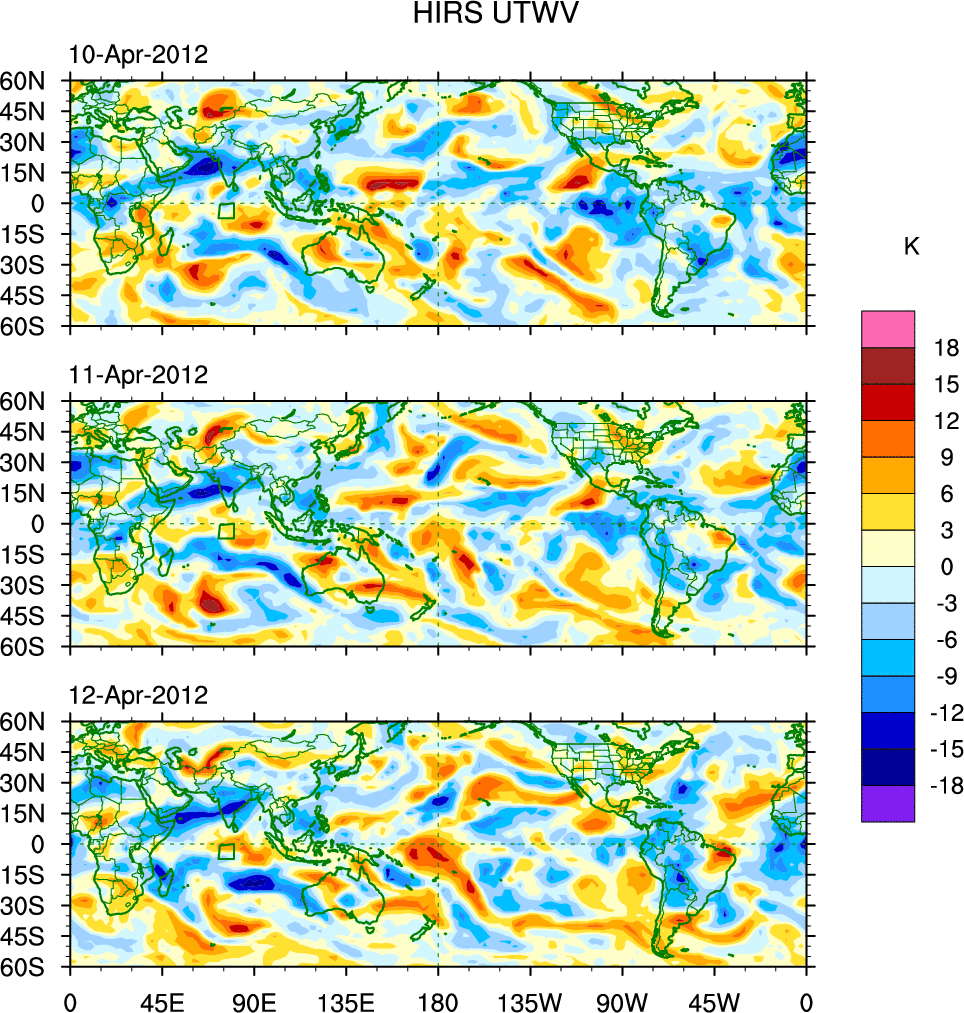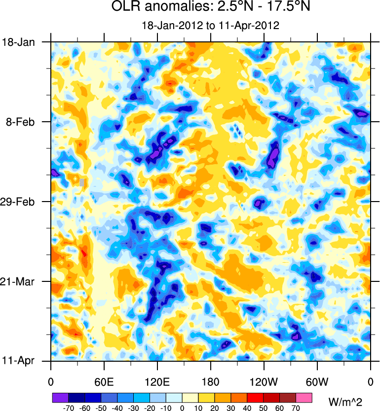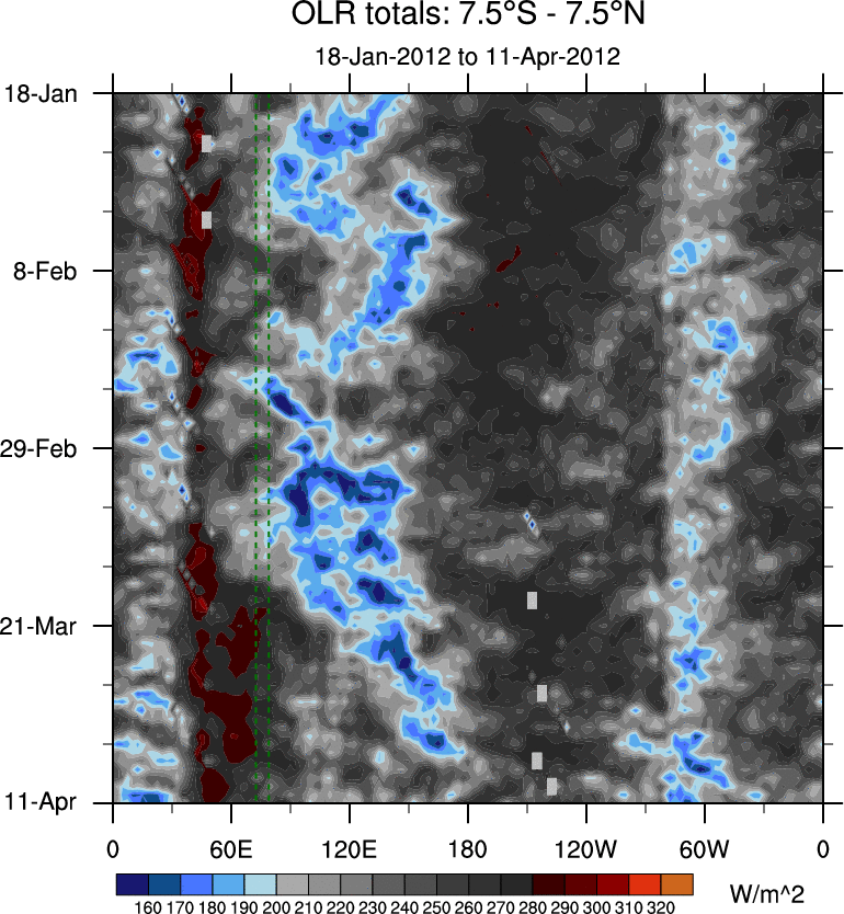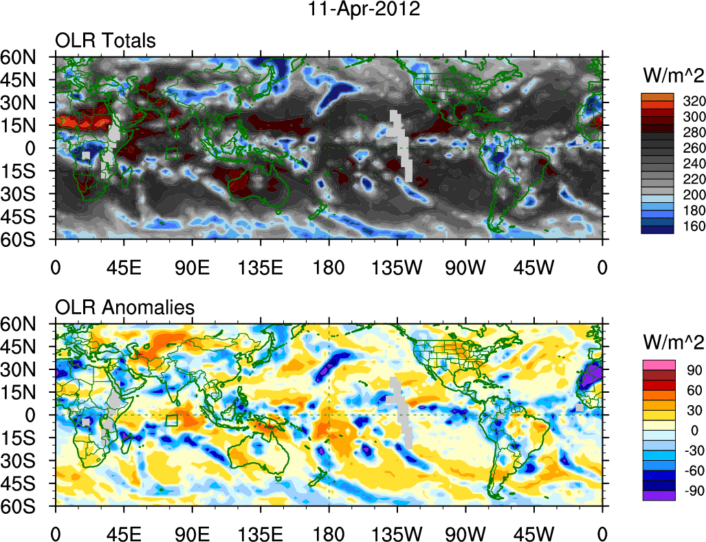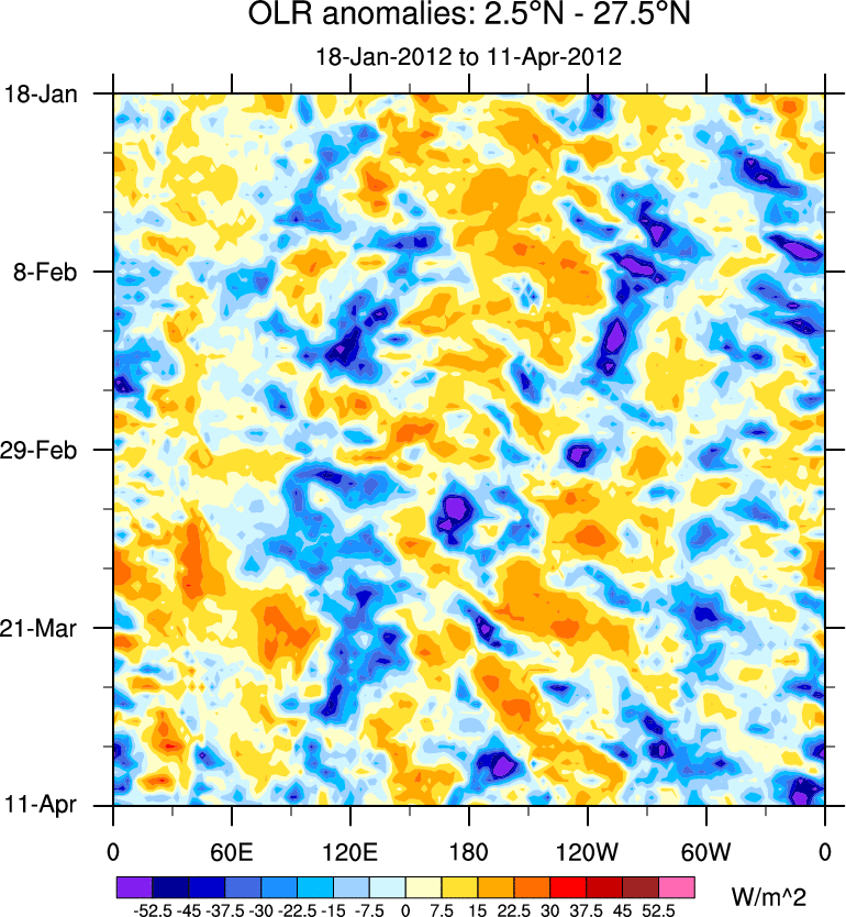 To identify tropical waves in near real-time, the OLR and UTWV data are filtered following Wheeler & Weickmann (2001 MWR). The daily anomalies are calculated using the first 3 harmonics of the seasonal cycle for 1979–2009. Missing values are then filled using linear interpolation in space and time. The most recent 365 days of anomalies are padded with 659 days of zeroes, and the result is filtered for each wave type.