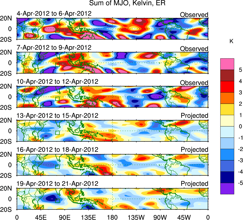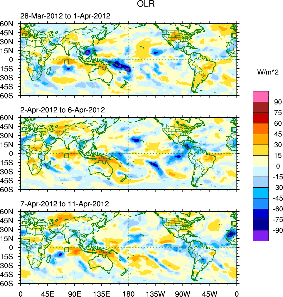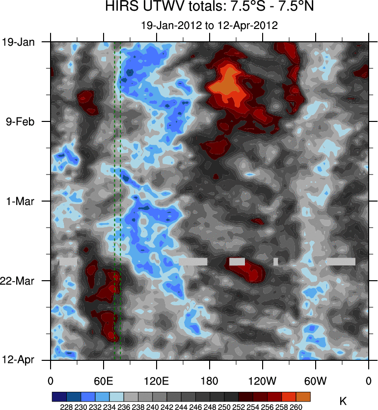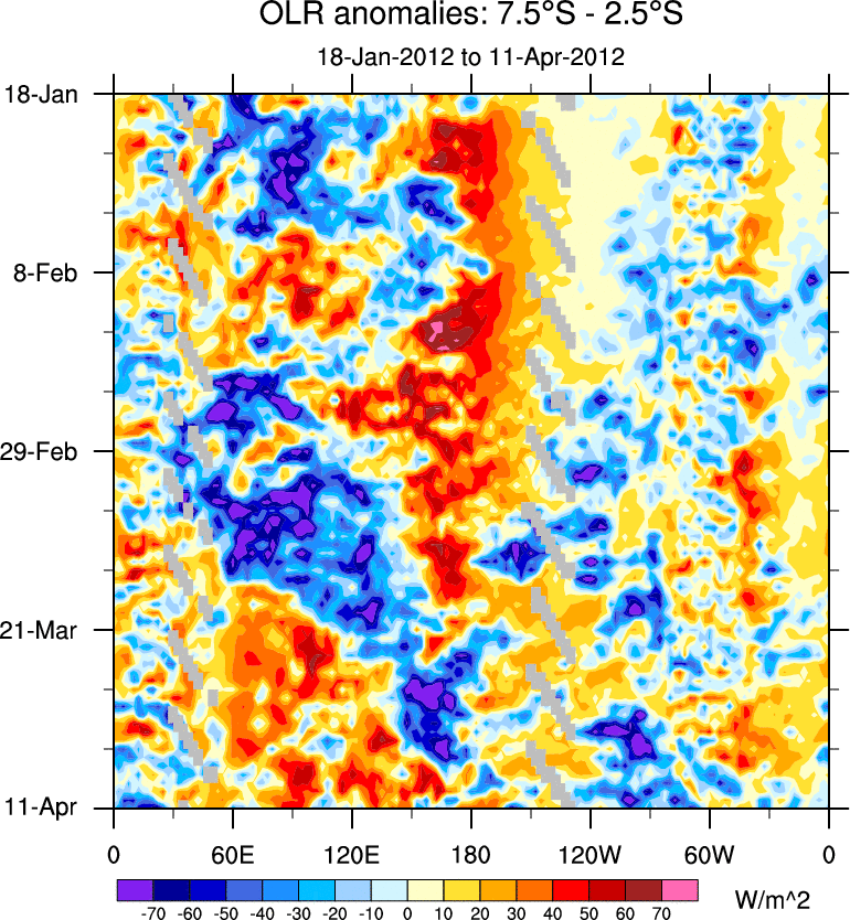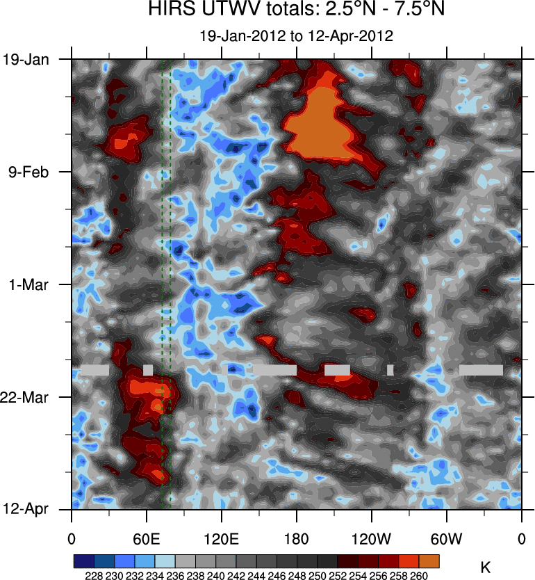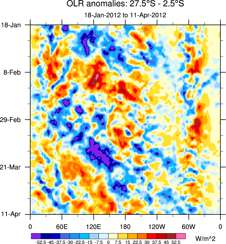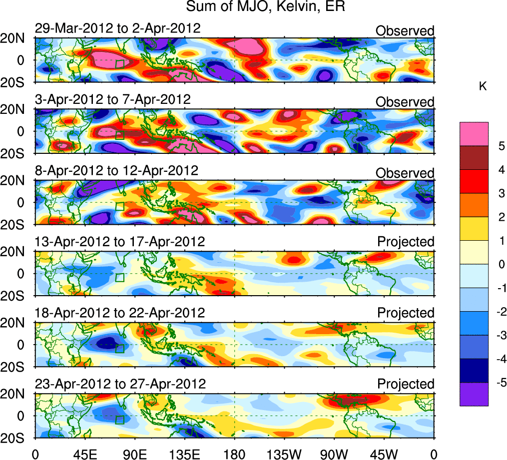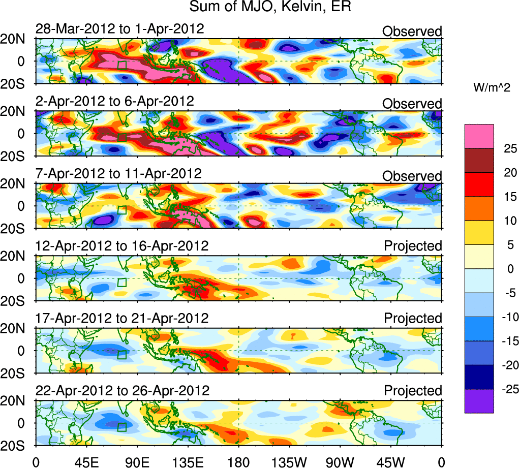 To identify tropical waves in near real-time, the OLR and UTWV data are filtered following Wheeler & Weickmann (2001 MWR). The daily anomalies are calculated using the first 3 harmonics of the seasonal cycle for 1979–2009. Missing values are then filled using linear interpolation in space and time. The most recent 365 days of anomalies are padded with 659 days of zeroes, and the result is filtered for each wave type.