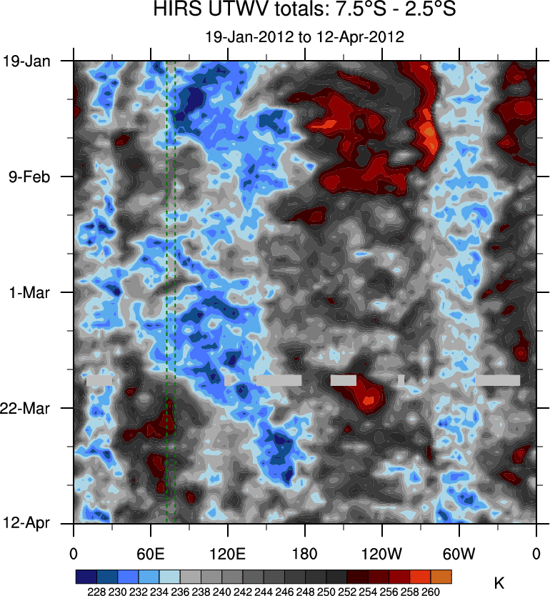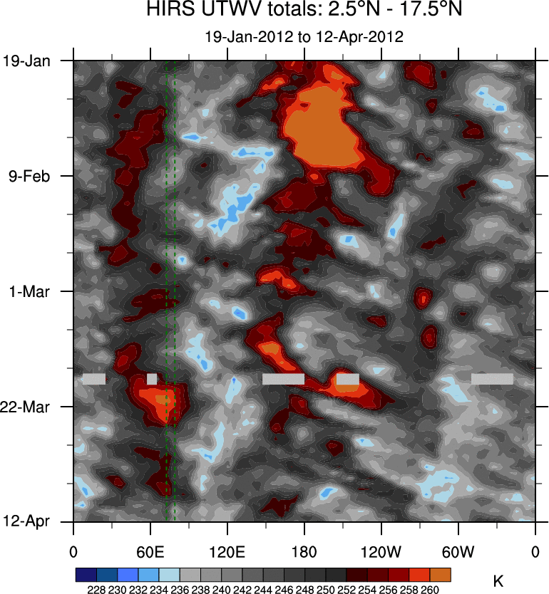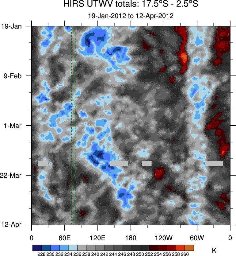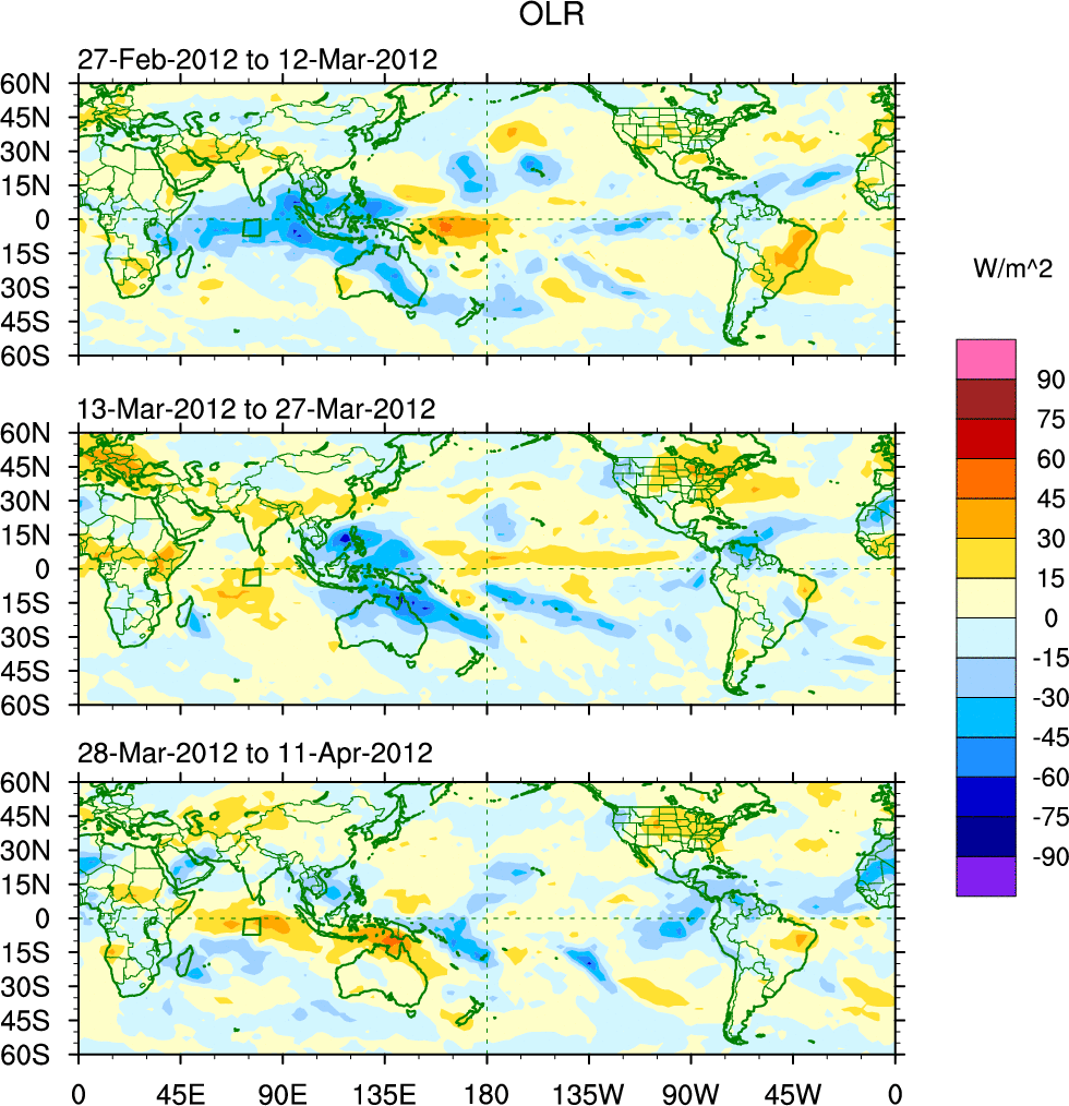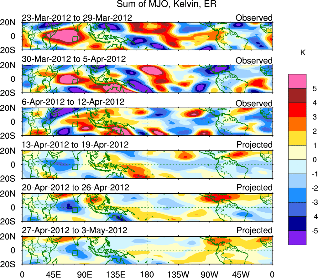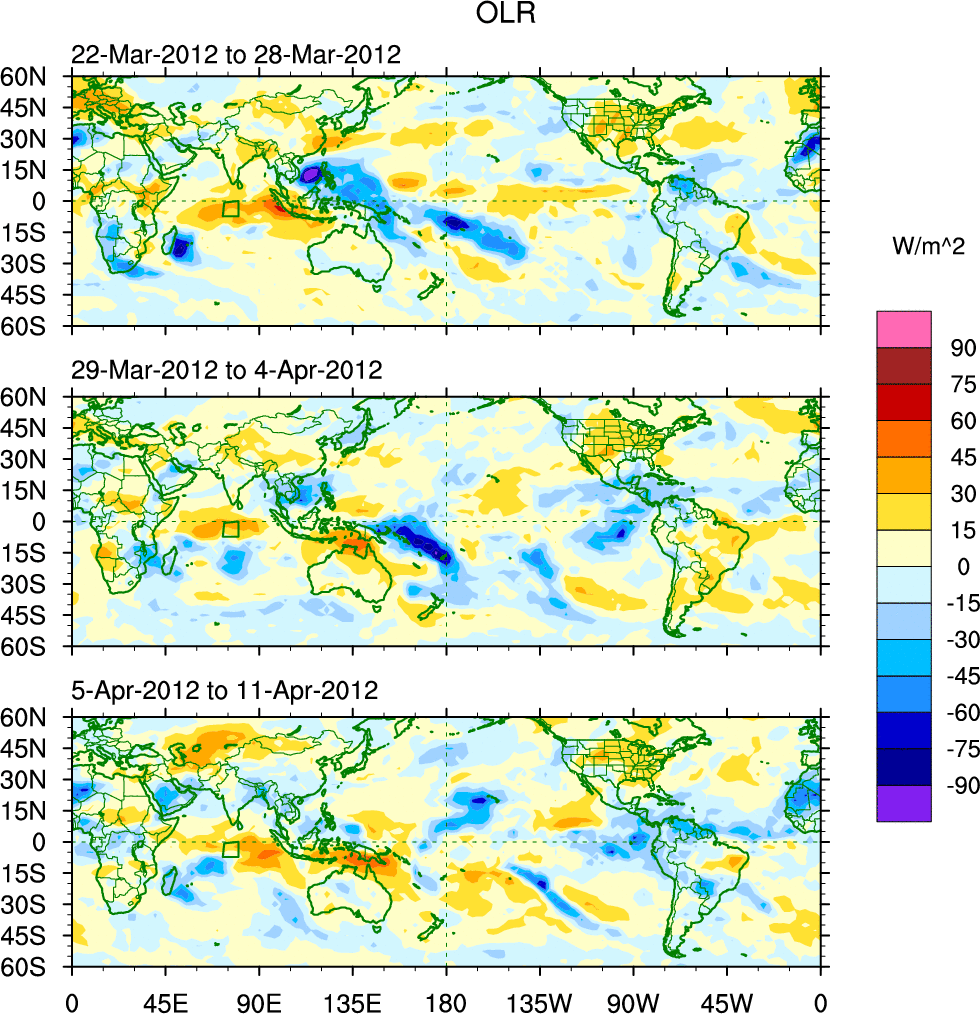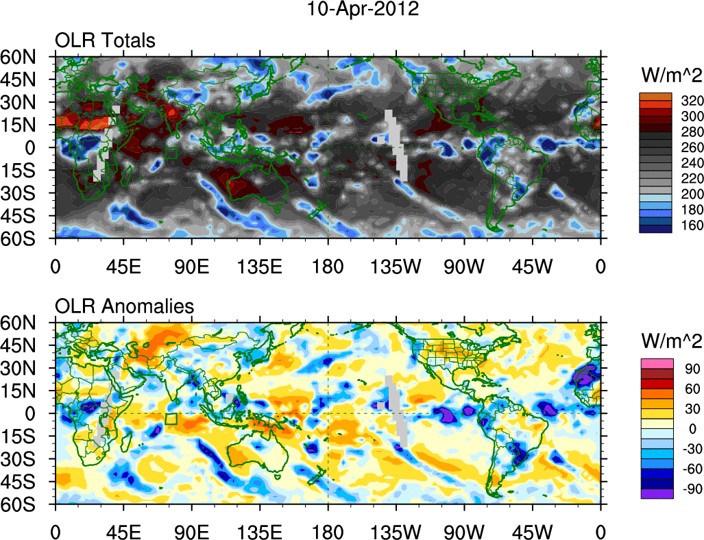 To identify tropical waves in near real-time, the OLR and UTWV data are filtered following Wheeler & Weickmann (2001 MWR). The daily anomalies are calculated using the first 3 harmonics of the seasonal cycle for 1979–2009. Missing values are then filled using linear interpolation in space and time. The most recent 365 days of anomalies are padded with 659 days of zeroes, and the result is filtered for each wave type.