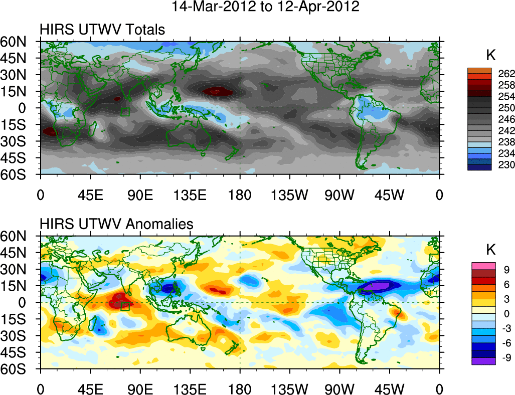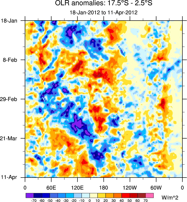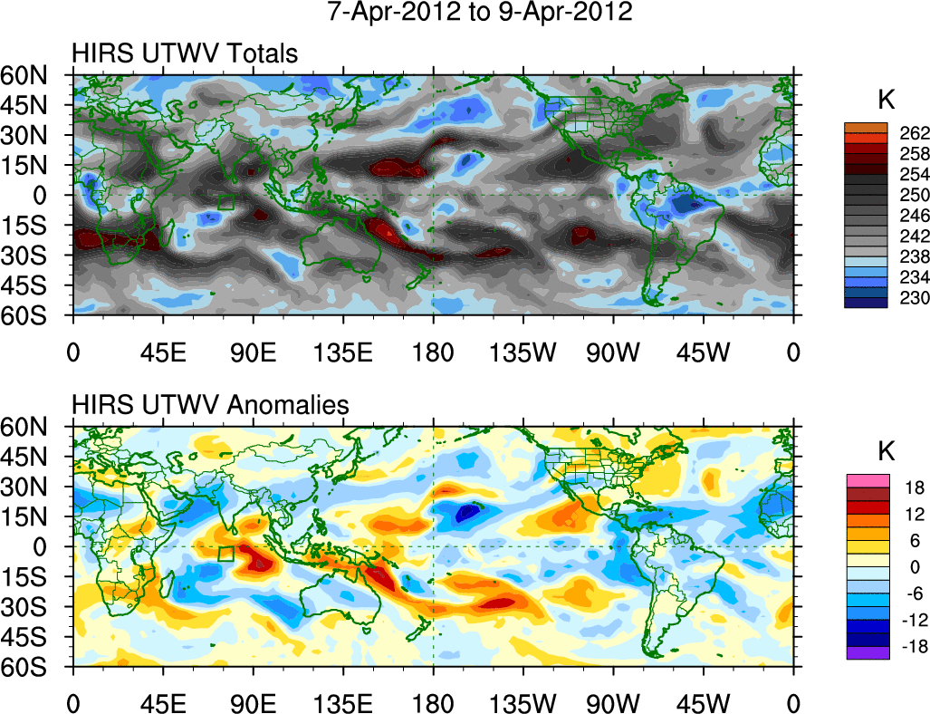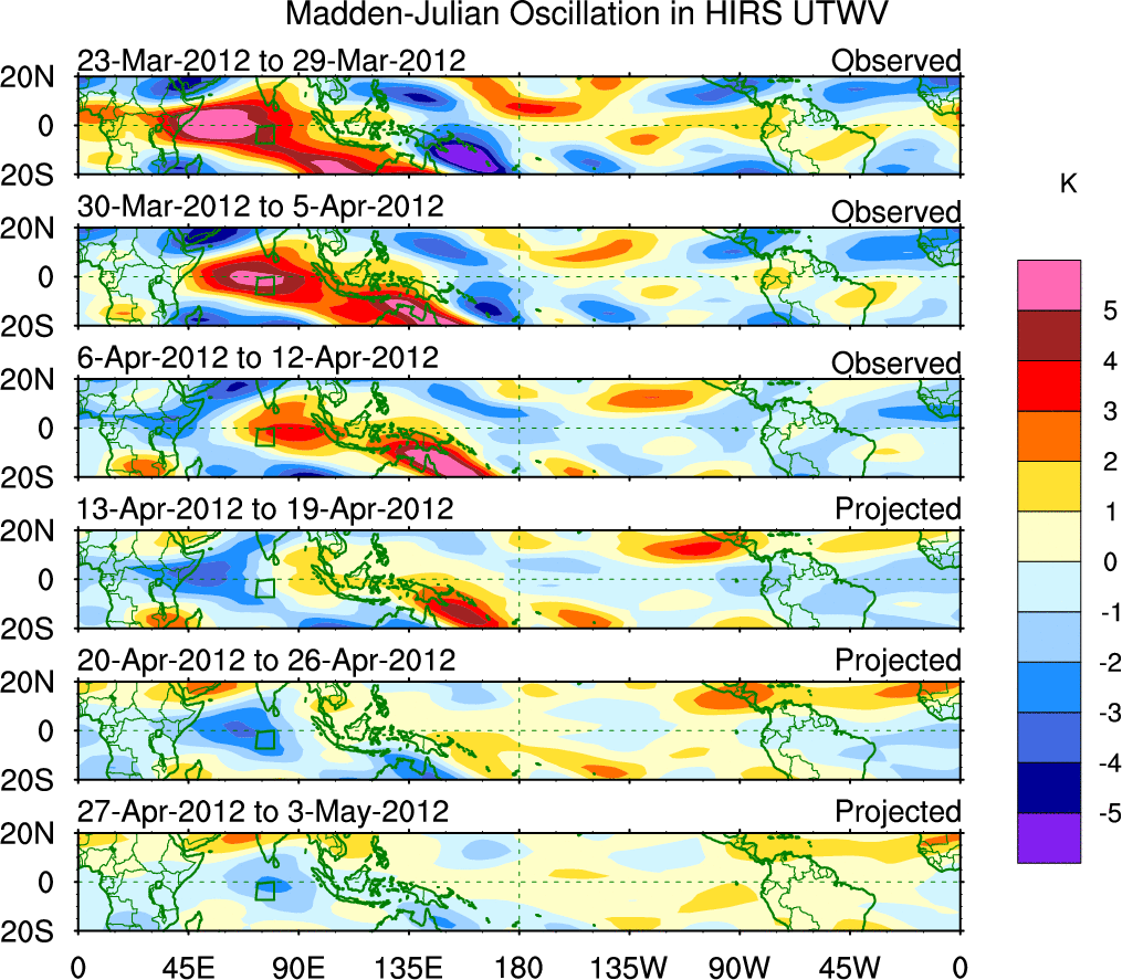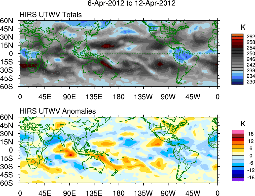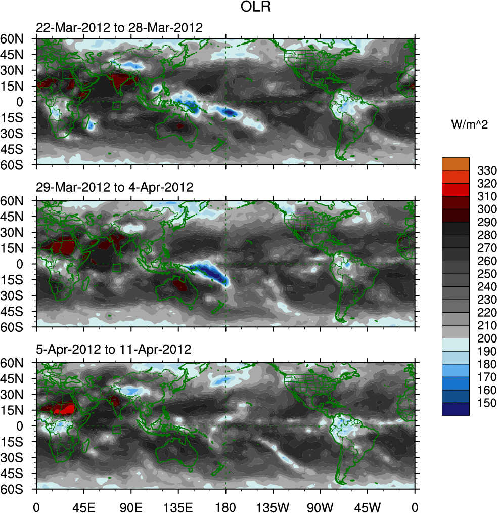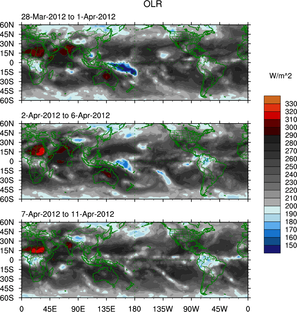 To identify tropical waves in near real-time, the OLR and UTWV data are filtered following Wheeler & Weickmann (2001 MWR). The daily anomalies are calculated using the first 3 harmonics of the seasonal cycle for 1979–2009. Missing values are then filled using linear interpolation in space and time. The most recent 365 days of anomalies are padded with 659 days of zeroes, and the result is filtered for each wave type.
