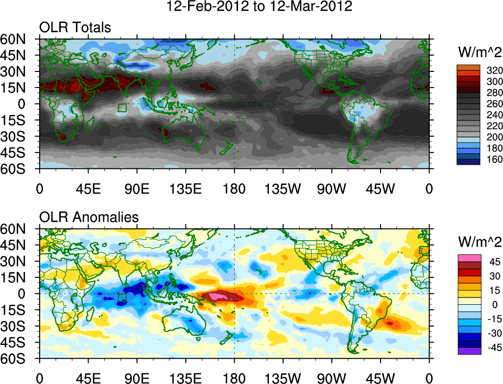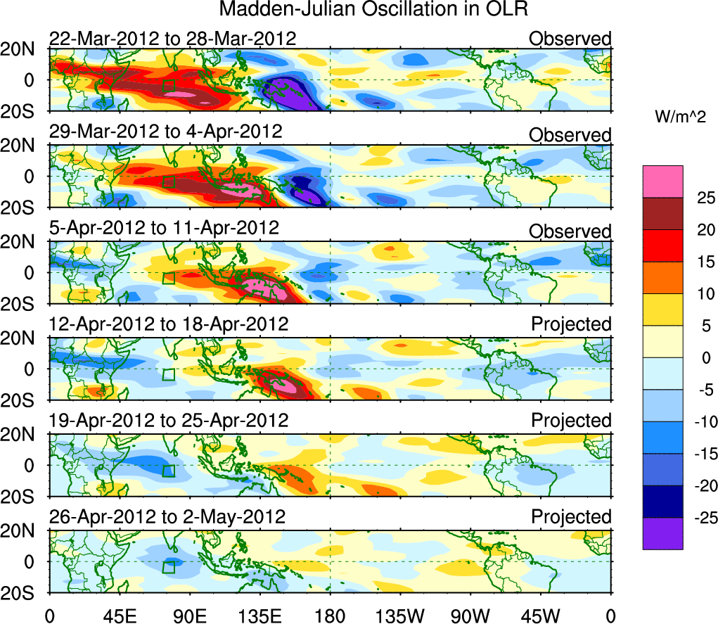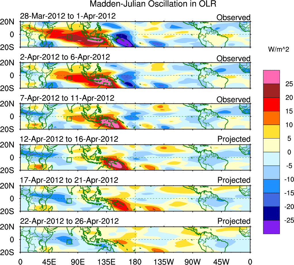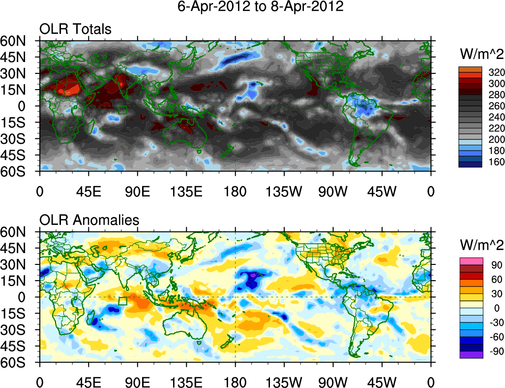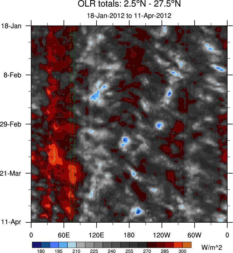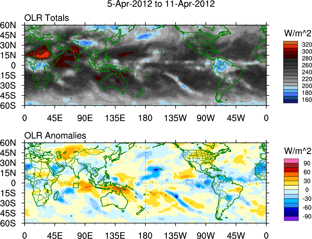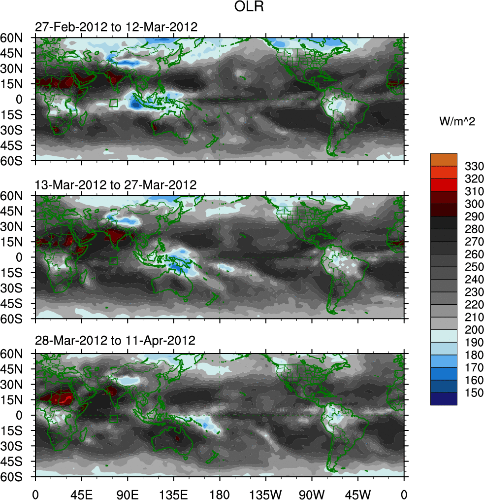 To identify tropical waves in near real-time, the OLR and UTWV data are filtered following Wheeler & Weickmann (2001 MWR). The daily anomalies are calculated using the first 3 harmonics of the seasonal cycle for 1979–2009. Missing values are then filled using linear interpolation in space and time. The most recent 365 days of anomalies are padded with 659 days of zeroes, and the result is filtered for each wave type.