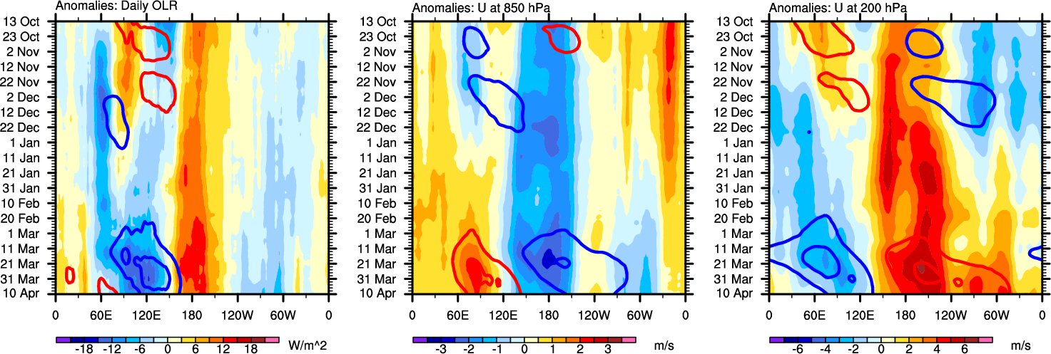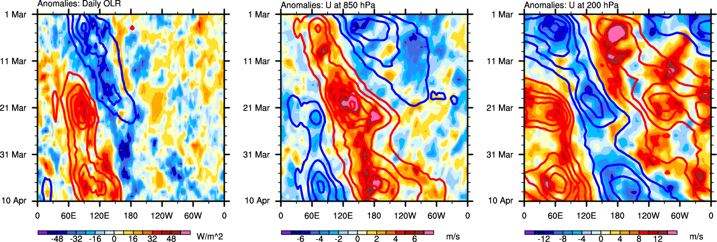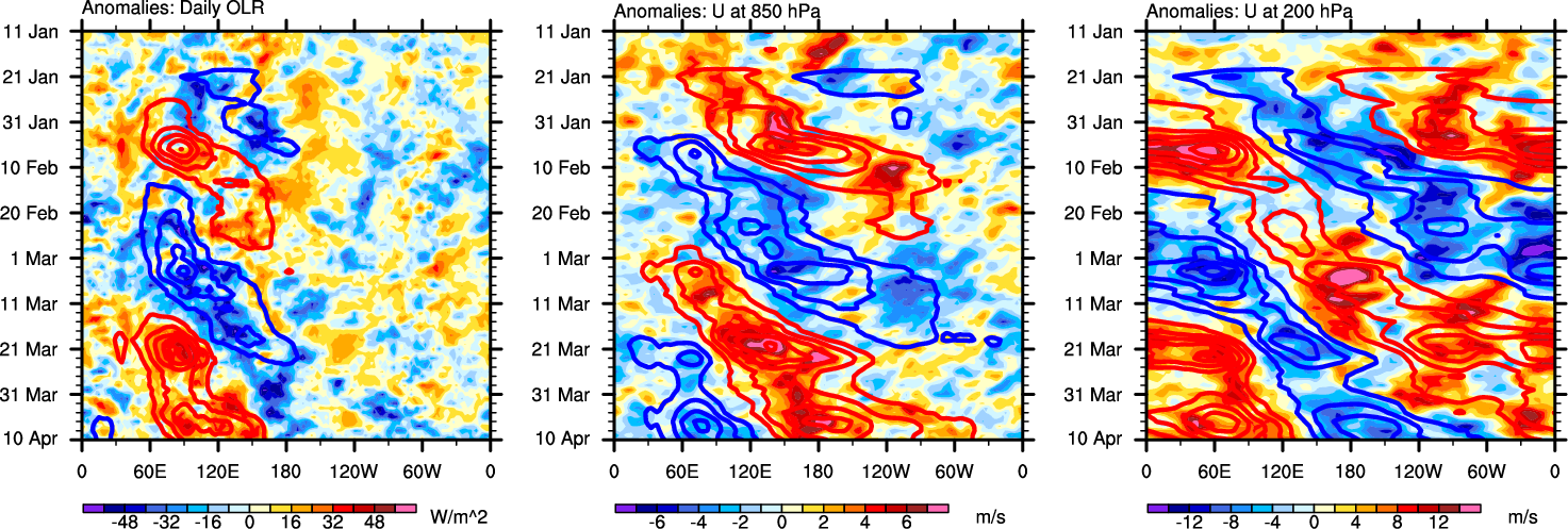 The Hovmollers show longitude-time plots for OLR, U-850, and U-200. The shading indicates the observed anomalies, while the contours are the projection of those anomalies onto the RMM EOFs.
