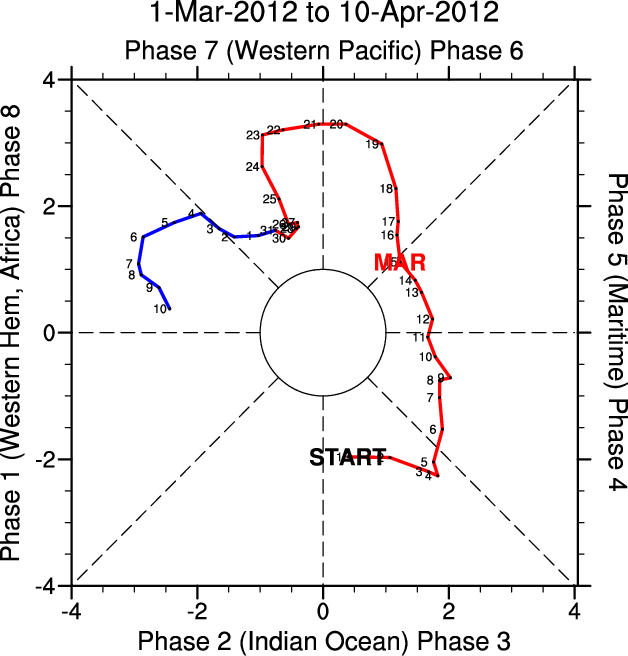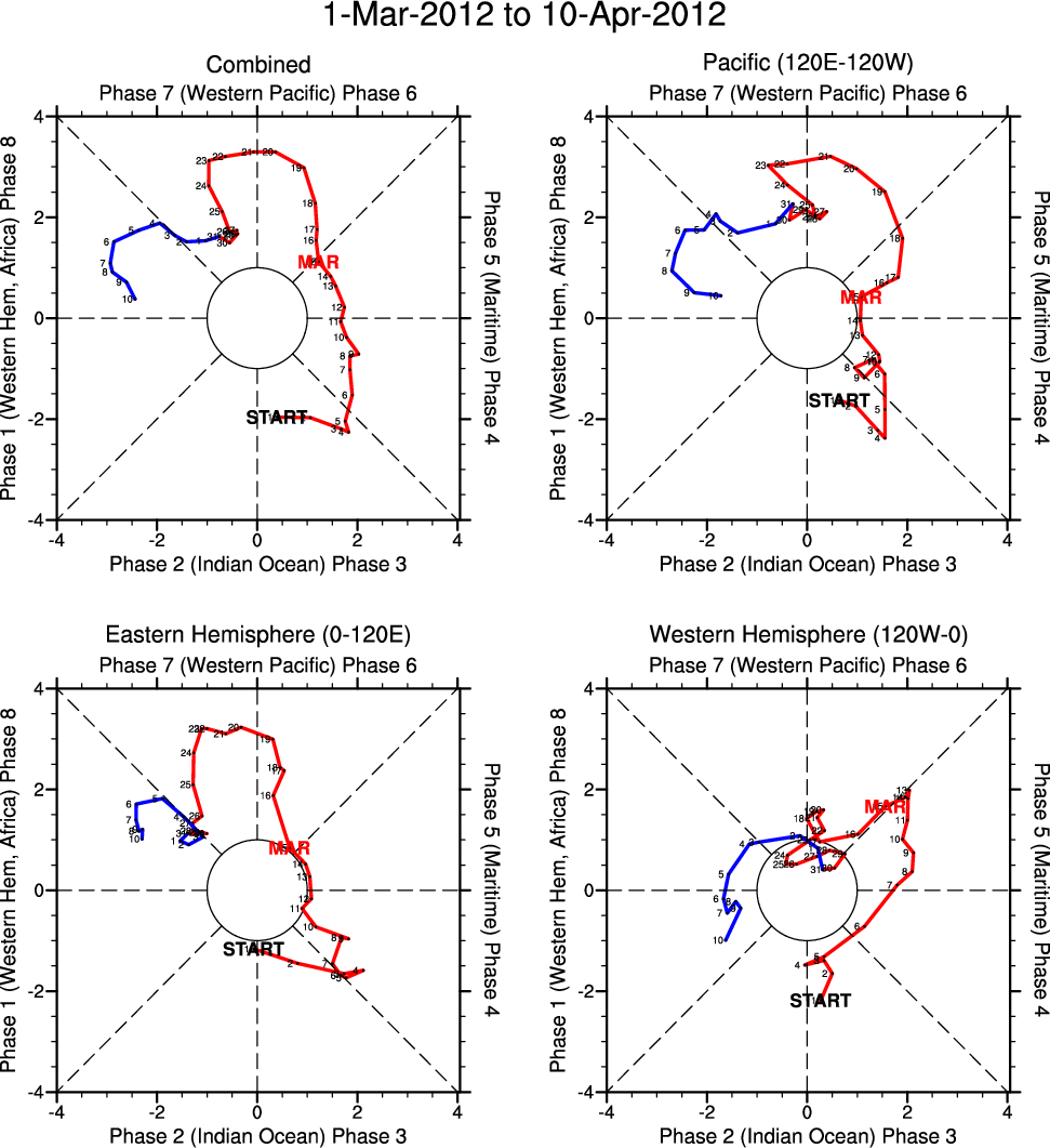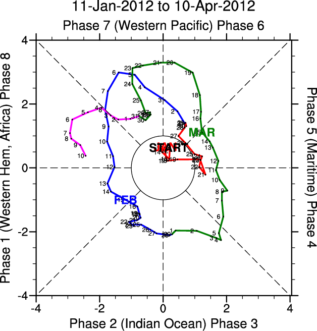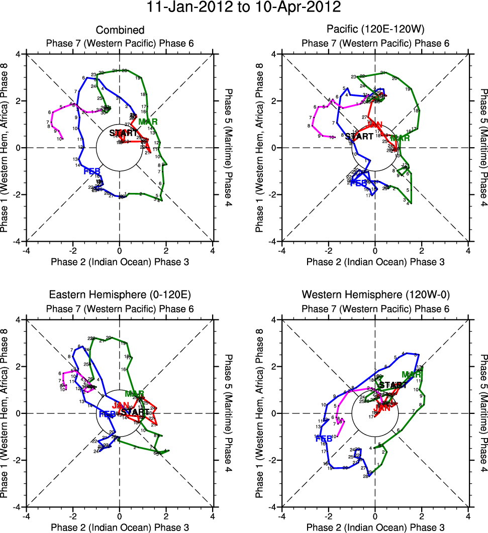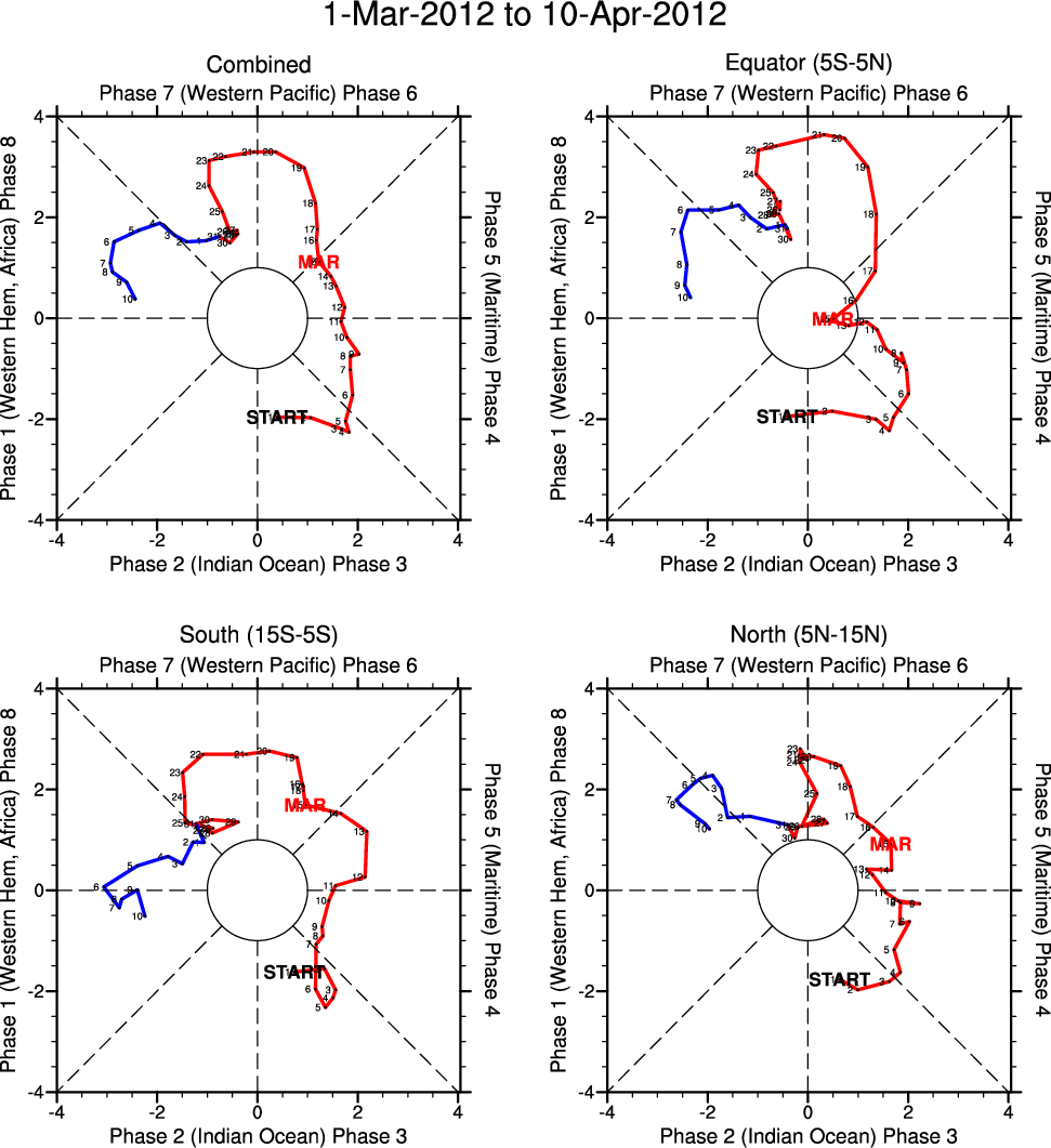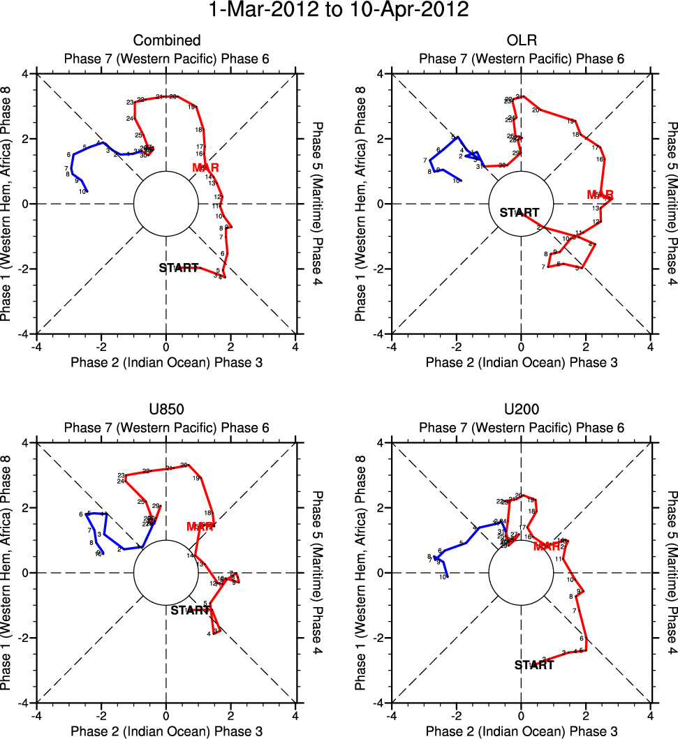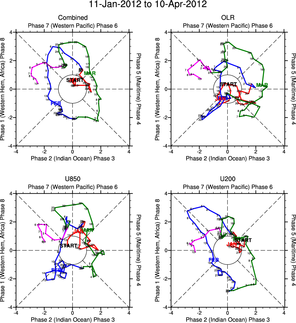 Wheeler and Hendon (2004) constructed the RMM index for monitoring the MJO. This index consists of the first two principal components (PCs) of OLR, 850-hPa zonal wind, and 200-hPa zonal wind averaged 15S-15N.