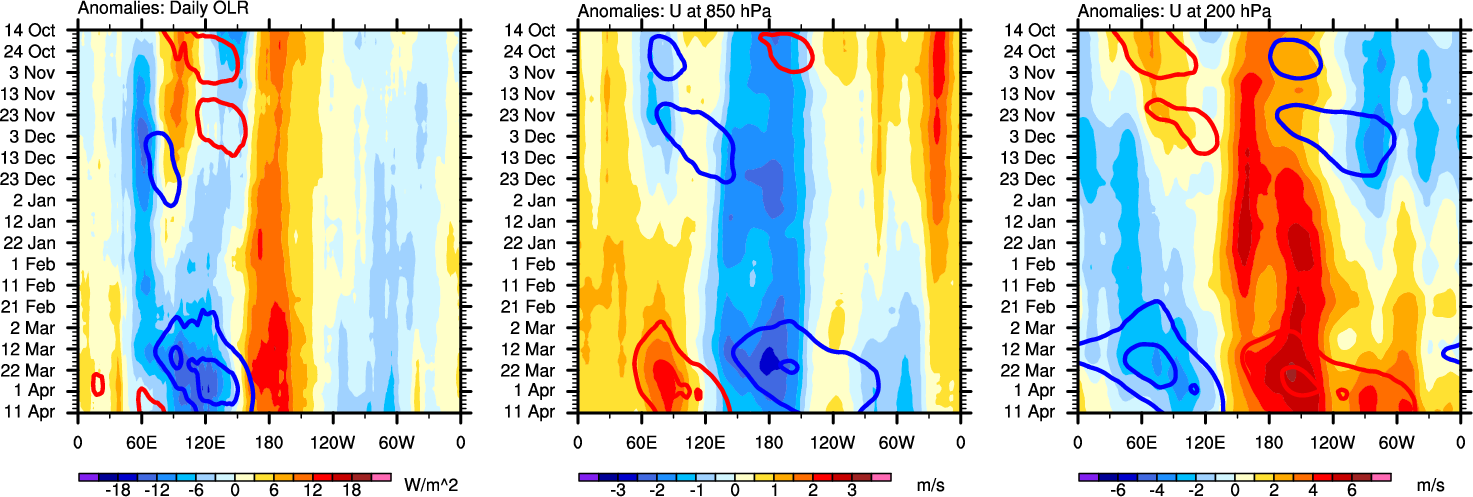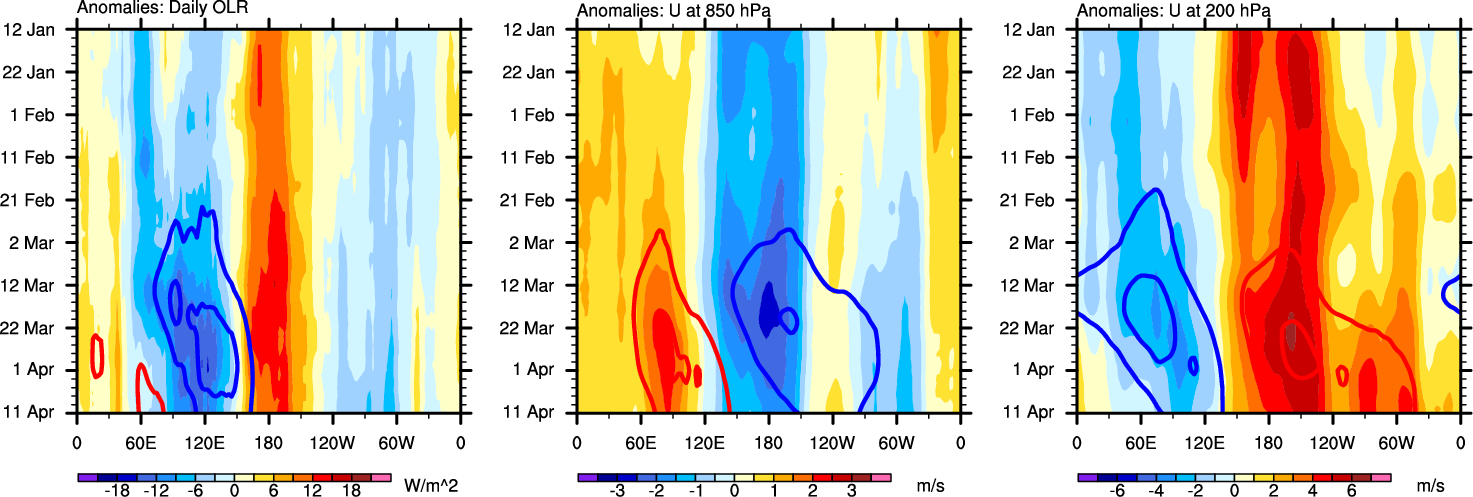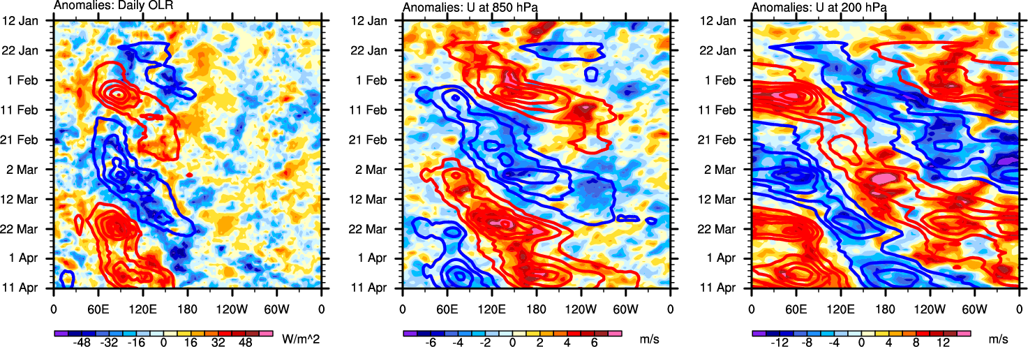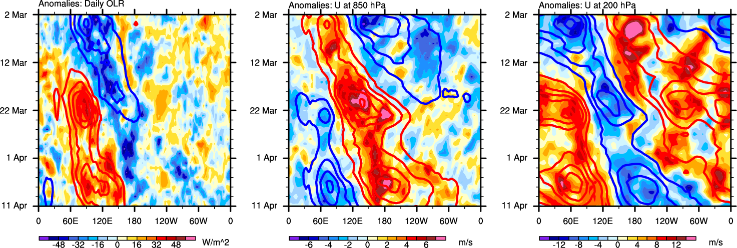 The Hovmollers show longitude-time plots for OLR, U-850, and U-200. The shading indicates the observed anomalies, while the contours are the projection of those anomalies onto the RMM EOFs.