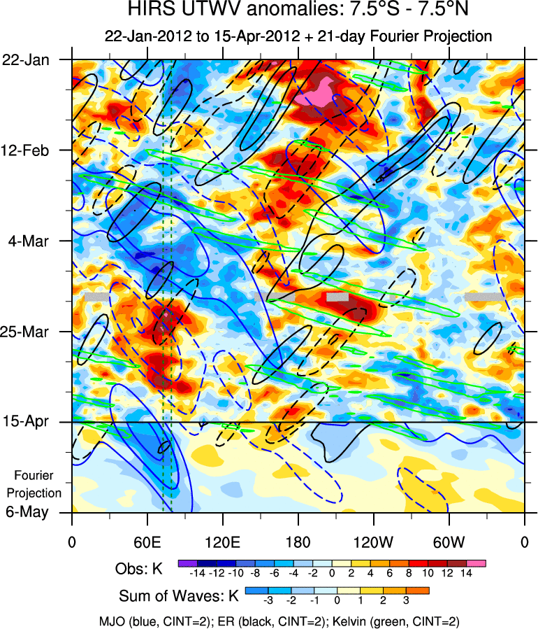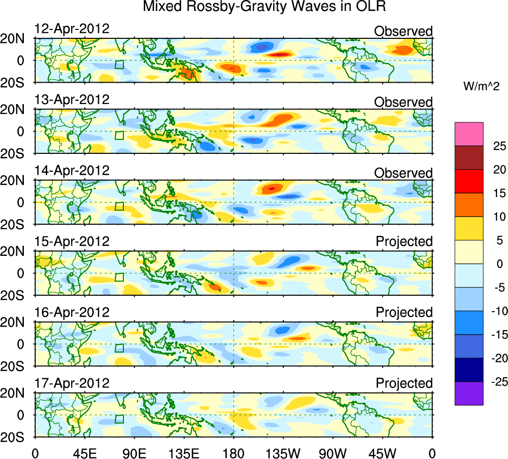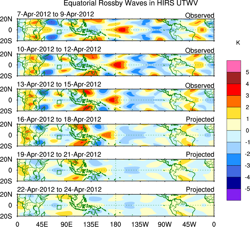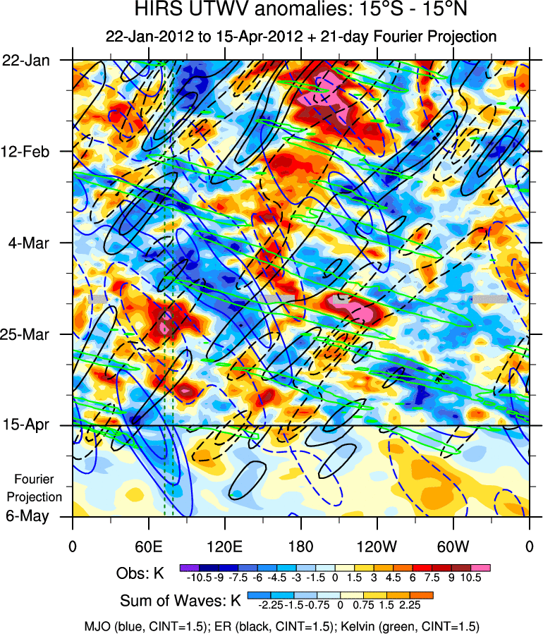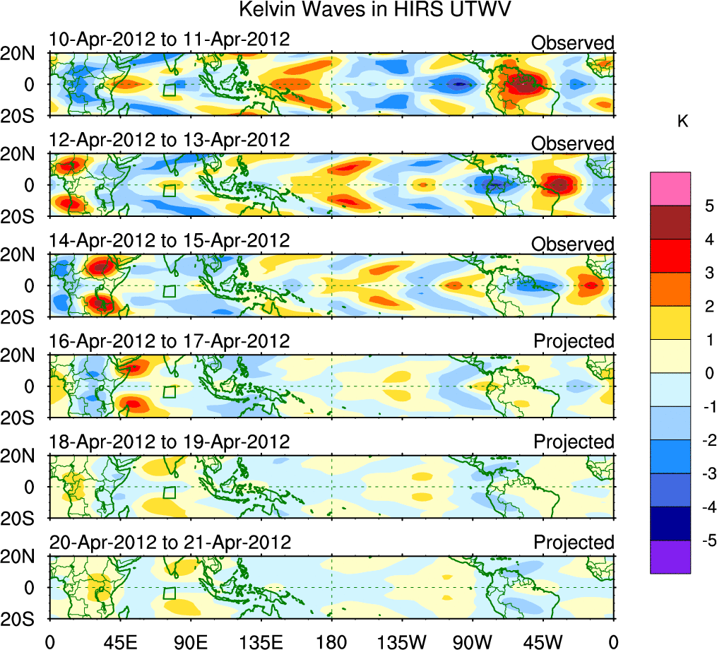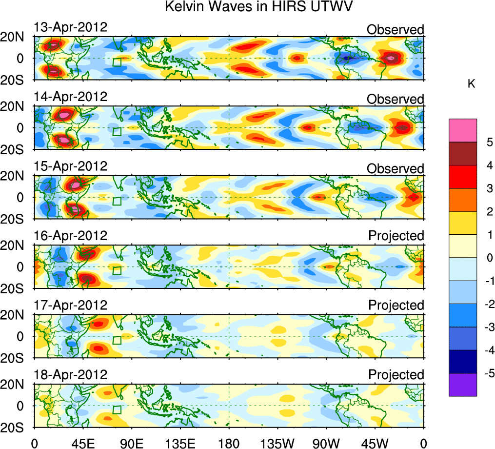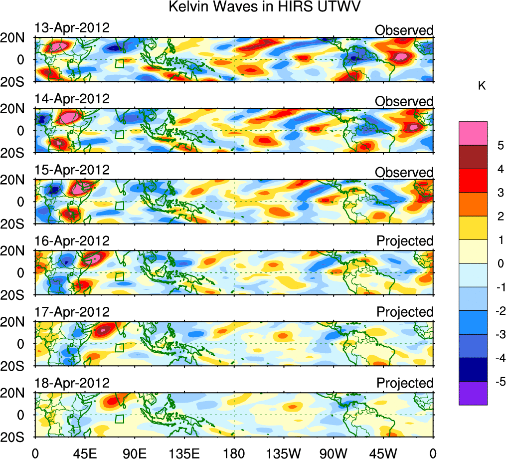 To identify tropical waves in near real-time, the OLR and UTWV data are filtered following Wheeler & Weickmann (2001 MWR). The daily anomalies are calculated using the first 3 harmonics of the seasonal cycle for 1979–2009. Missing values are then filled using linear interpolation in space and time. The most recent 365 days of anomalies are padded with 659 days of zeroes, and the result is filtered for each wave type.