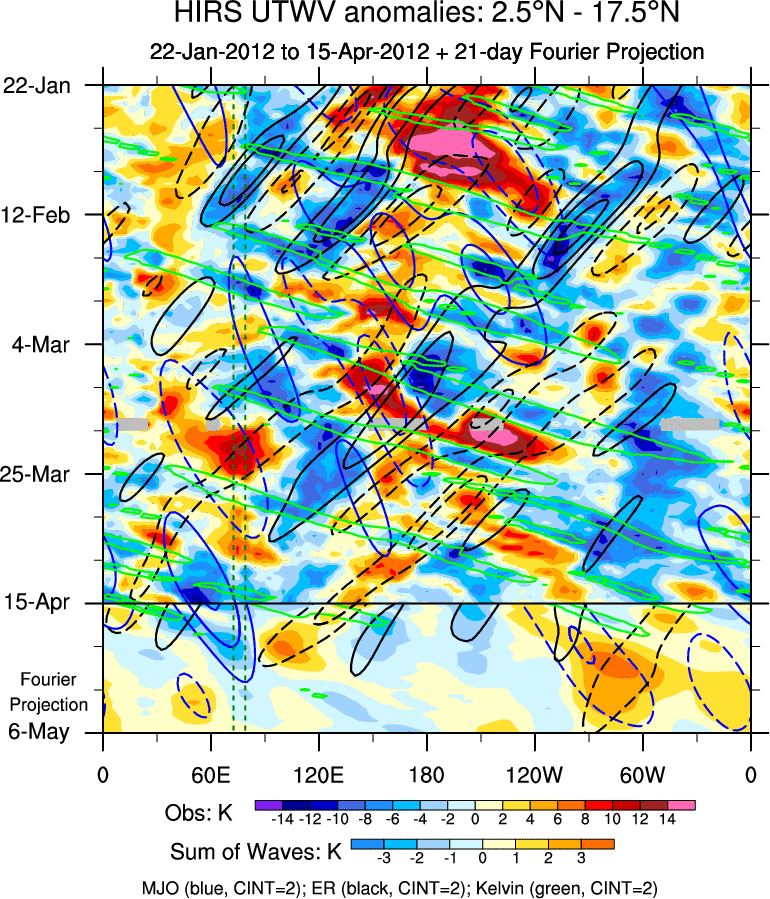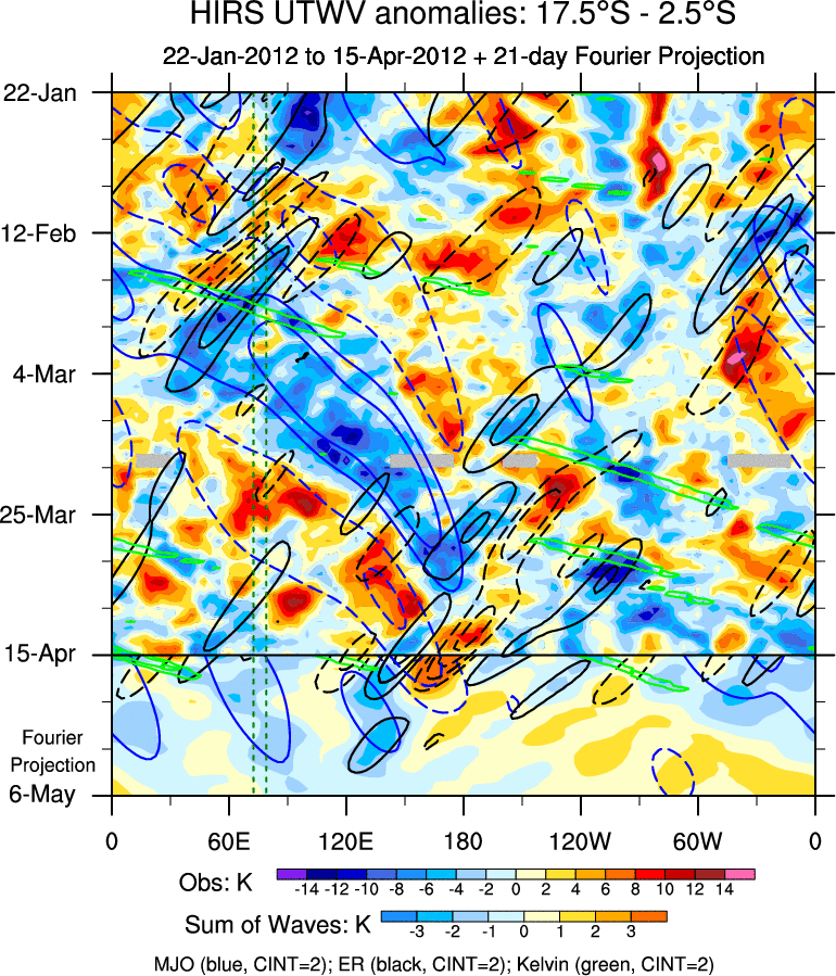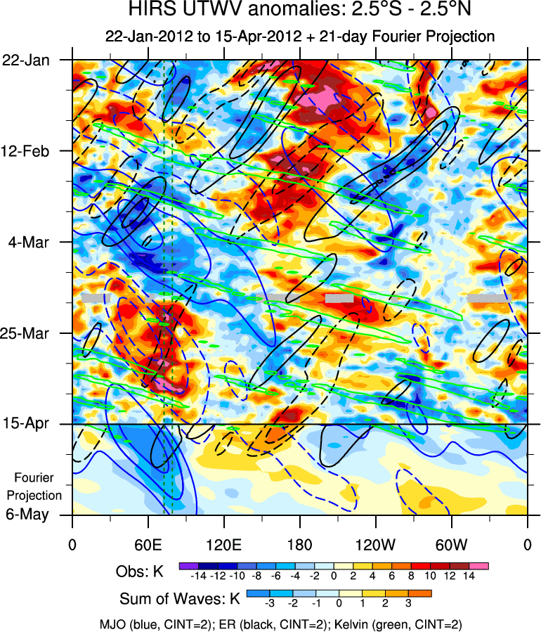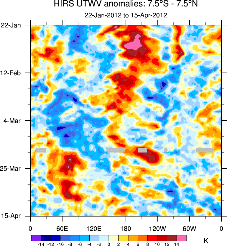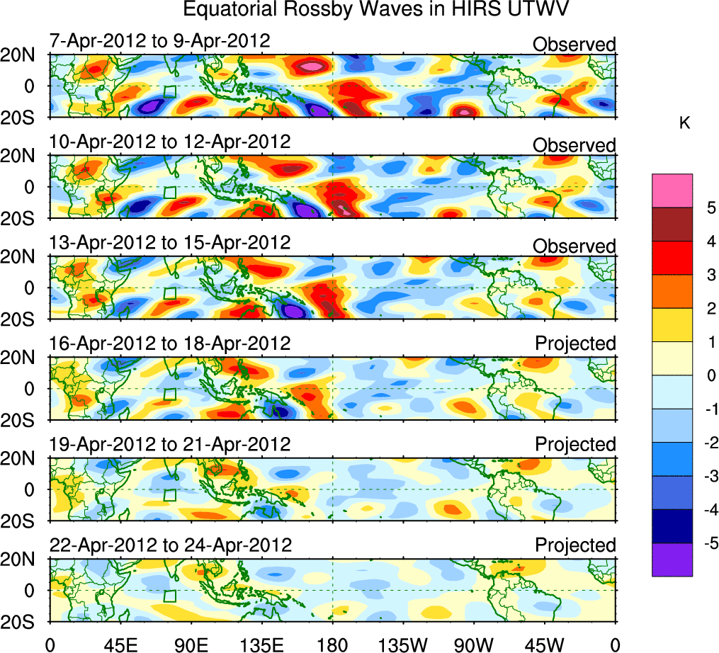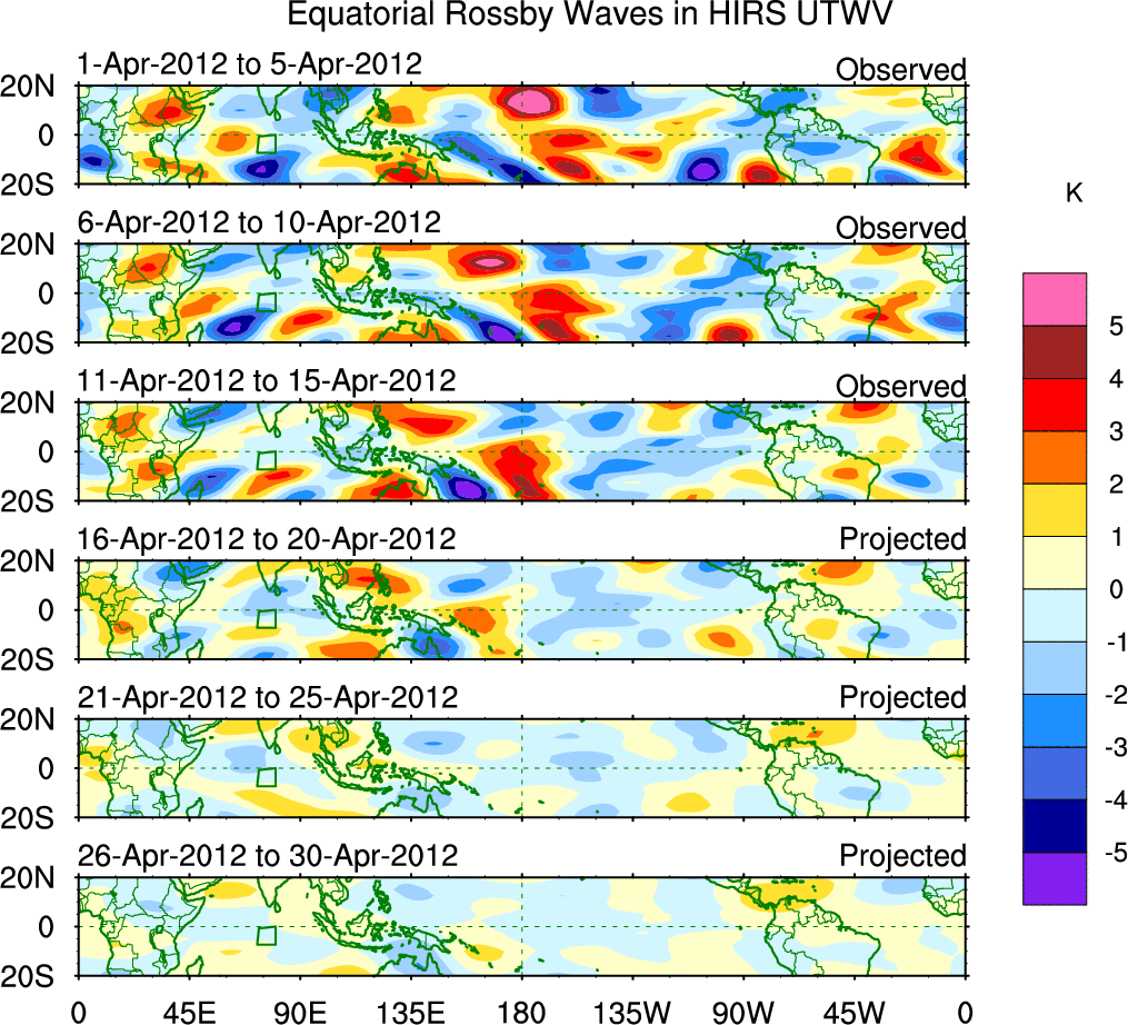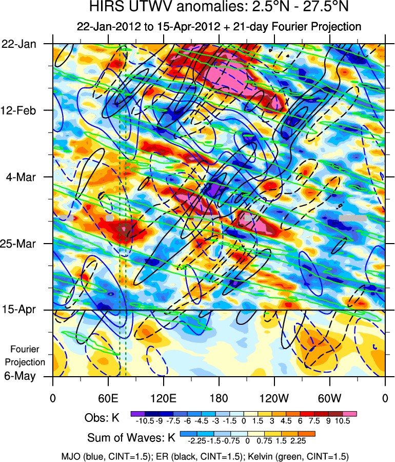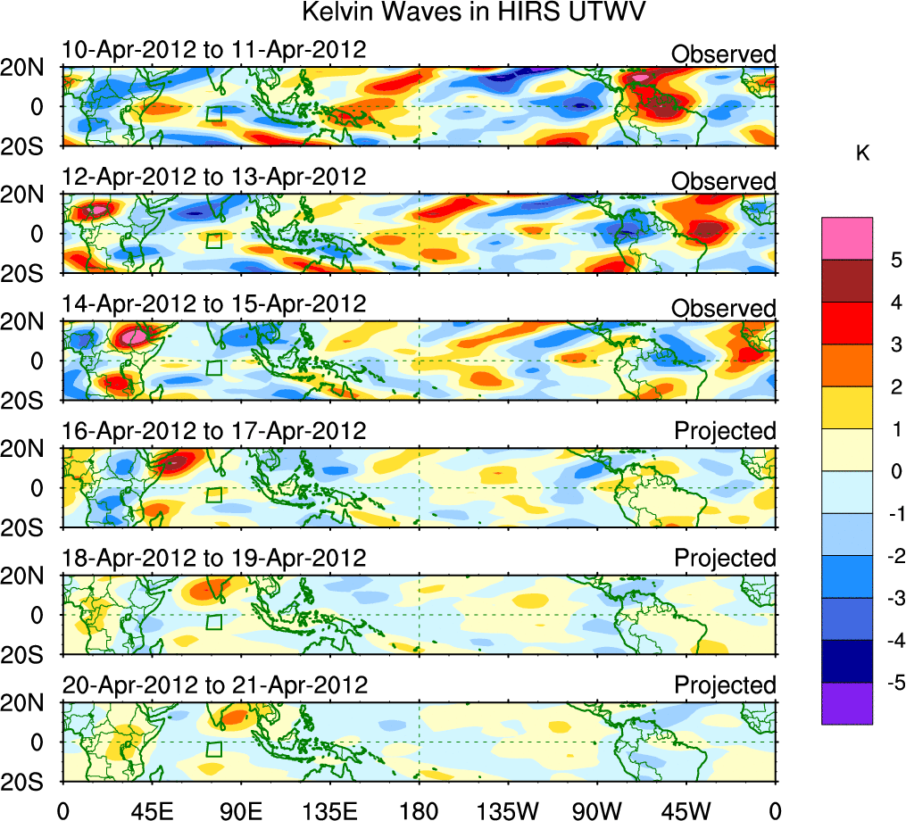 To identify tropical waves in near real-time, the OLR and UTWV data are filtered following Wheeler & Weickmann (2001 MWR). The daily anomalies are calculated using the first 3 harmonics of the seasonal cycle for 1979–2009. Missing values are then filled using linear interpolation in space and time. The most recent 365 days of anomalies are padded with 659 days of zeroes, and the result is filtered for each wave type.