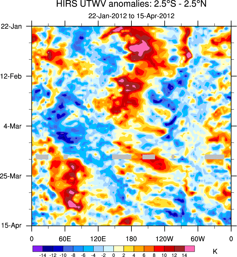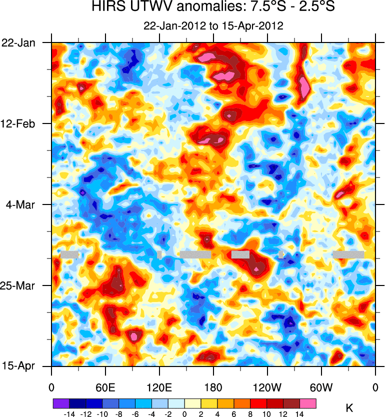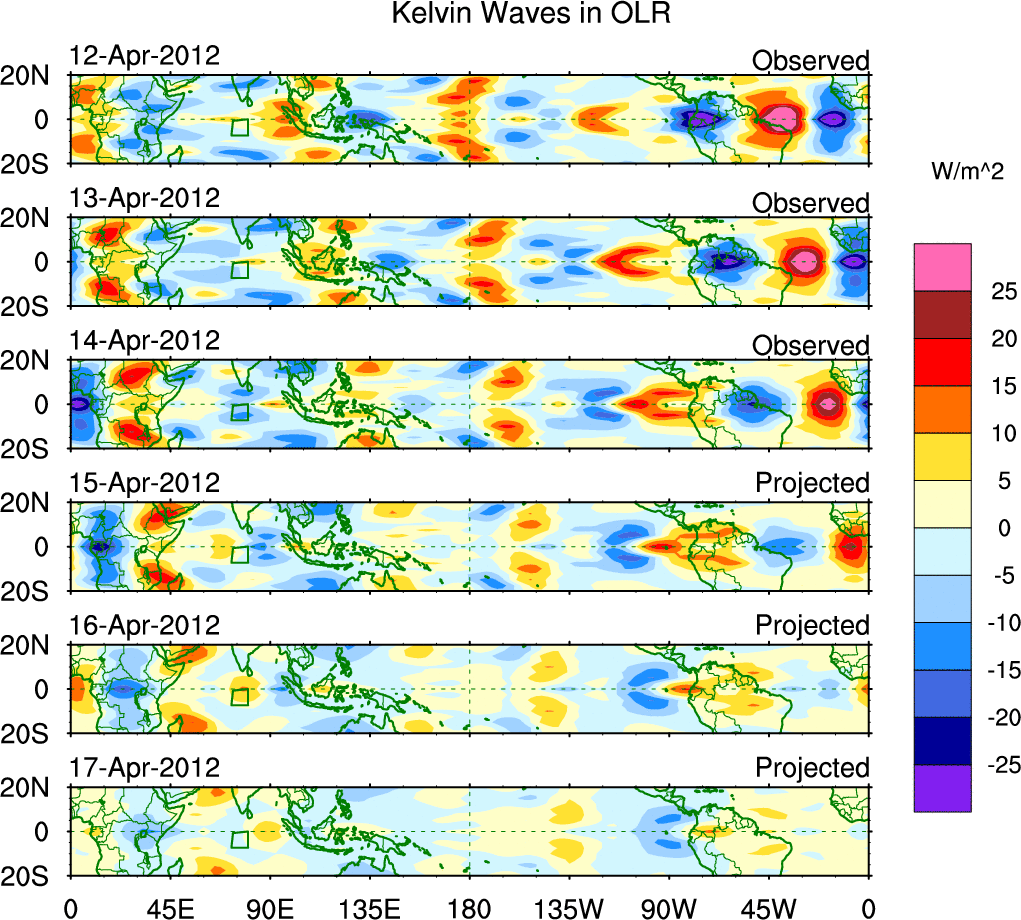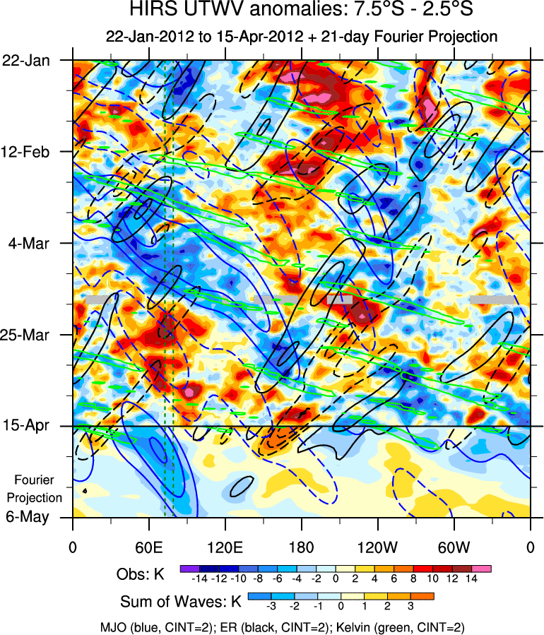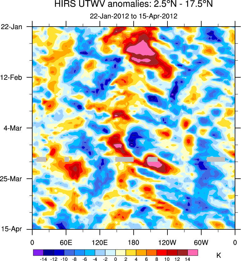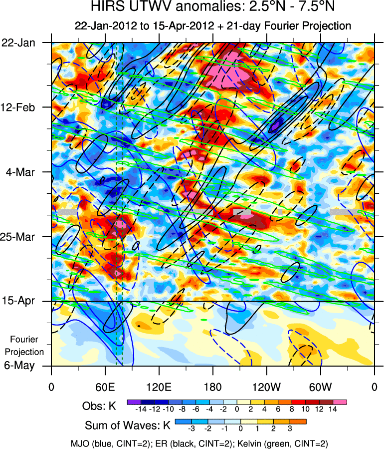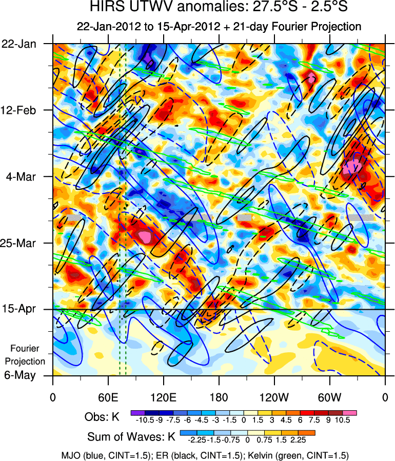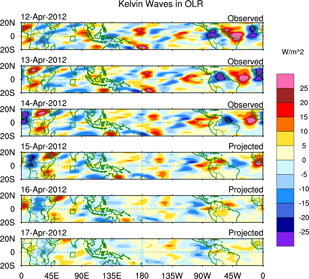 To identify tropical waves in near real-time, the OLR and UTWV data are filtered following Wheeler & Weickmann (2001 MWR). The daily anomalies are calculated using the first 3 harmonics of the seasonal cycle for 1979–2009. Missing values are then filled using linear interpolation in space and time. The most recent 365 days of anomalies are padded with 659 days of zeroes, and the result is filtered for each wave type.