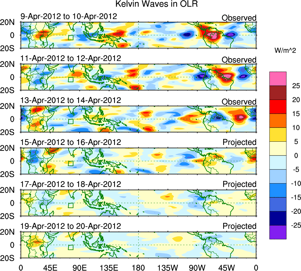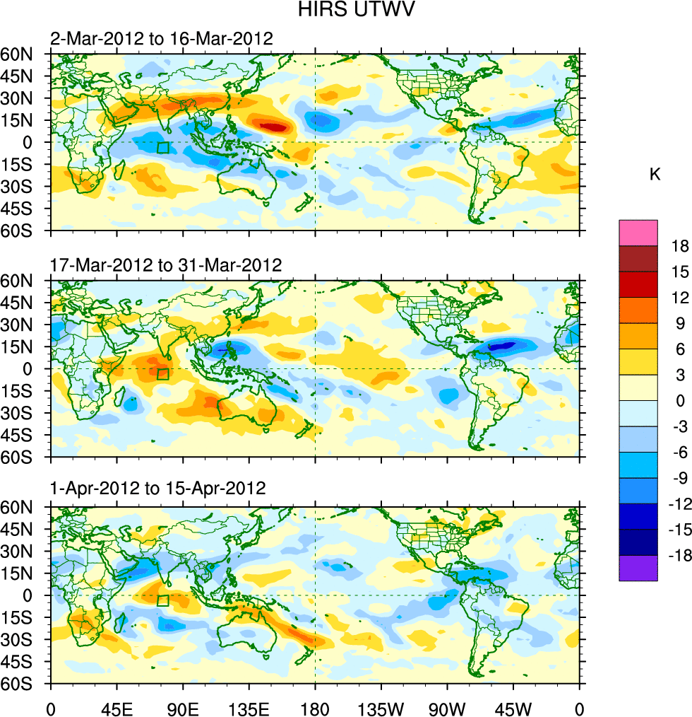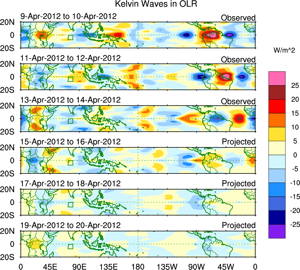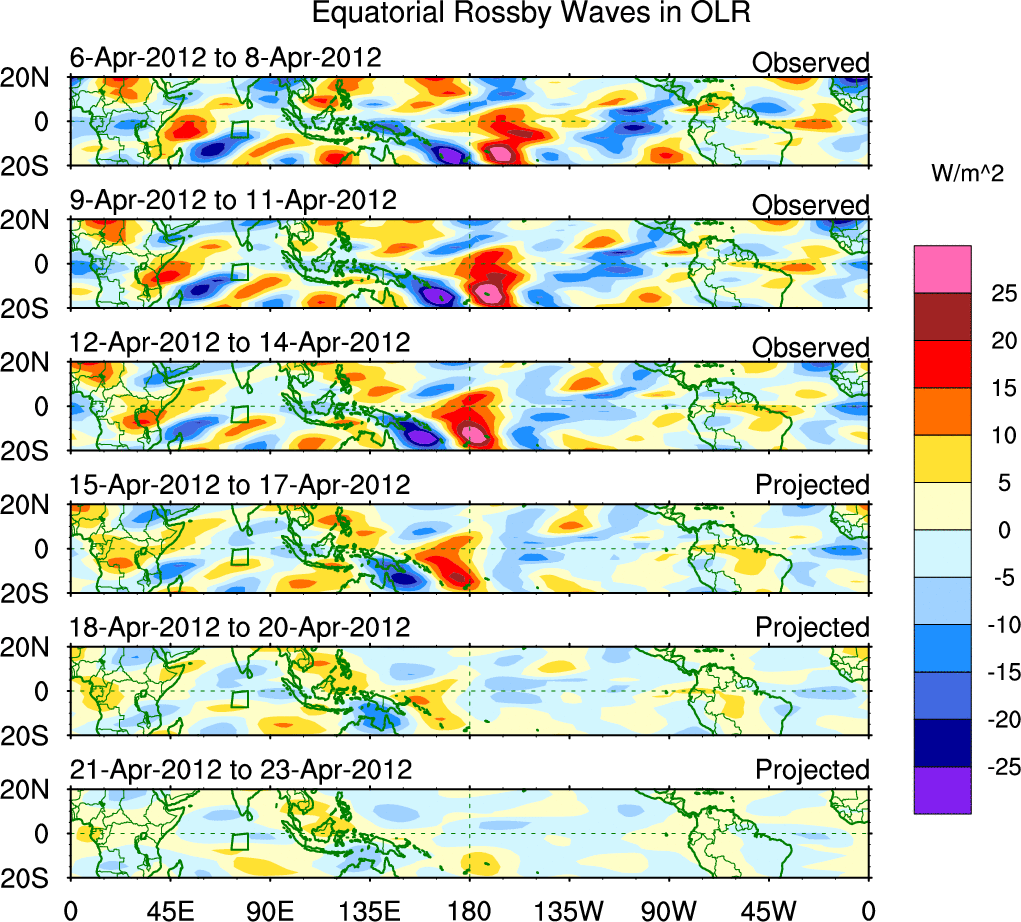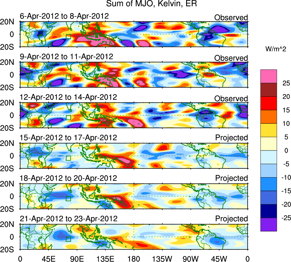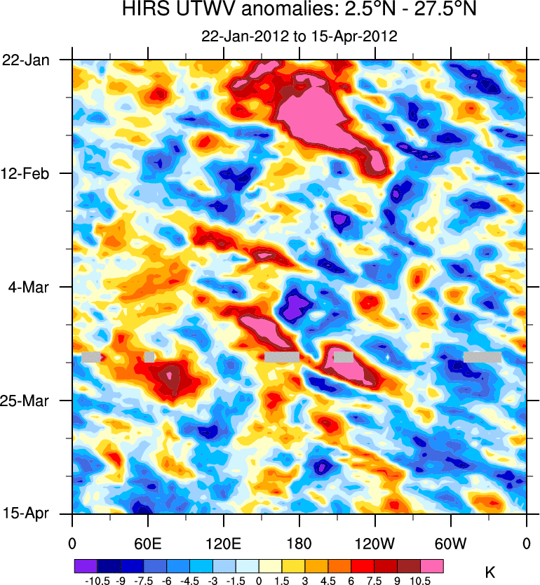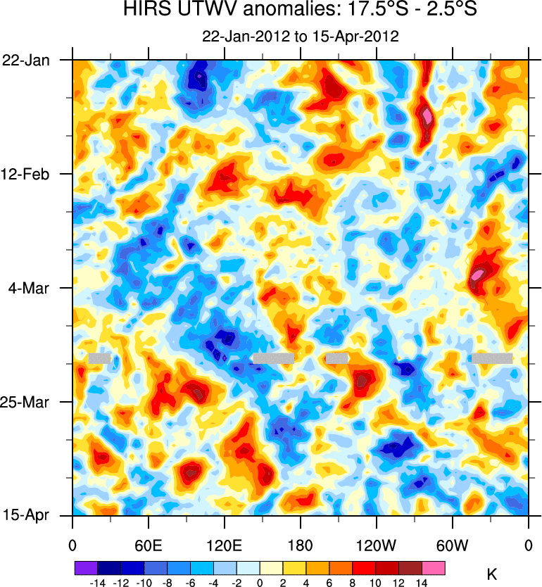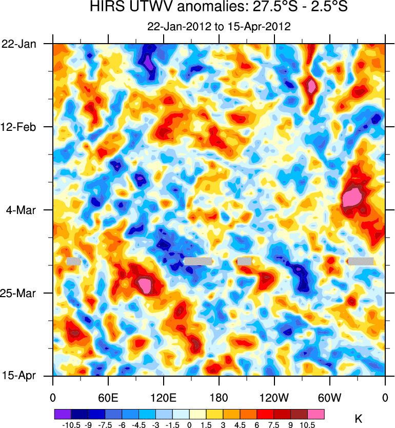 To identify tropical waves in near real-time, the OLR and UTWV data are filtered following Wheeler & Weickmann (2001 MWR). The daily anomalies are calculated using the first 3 harmonics of the seasonal cycle for 1979–2009. Missing values are then filled using linear interpolation in space and time. The most recent 365 days of anomalies are padded with 659 days of zeroes, and the result is filtered for each wave type.