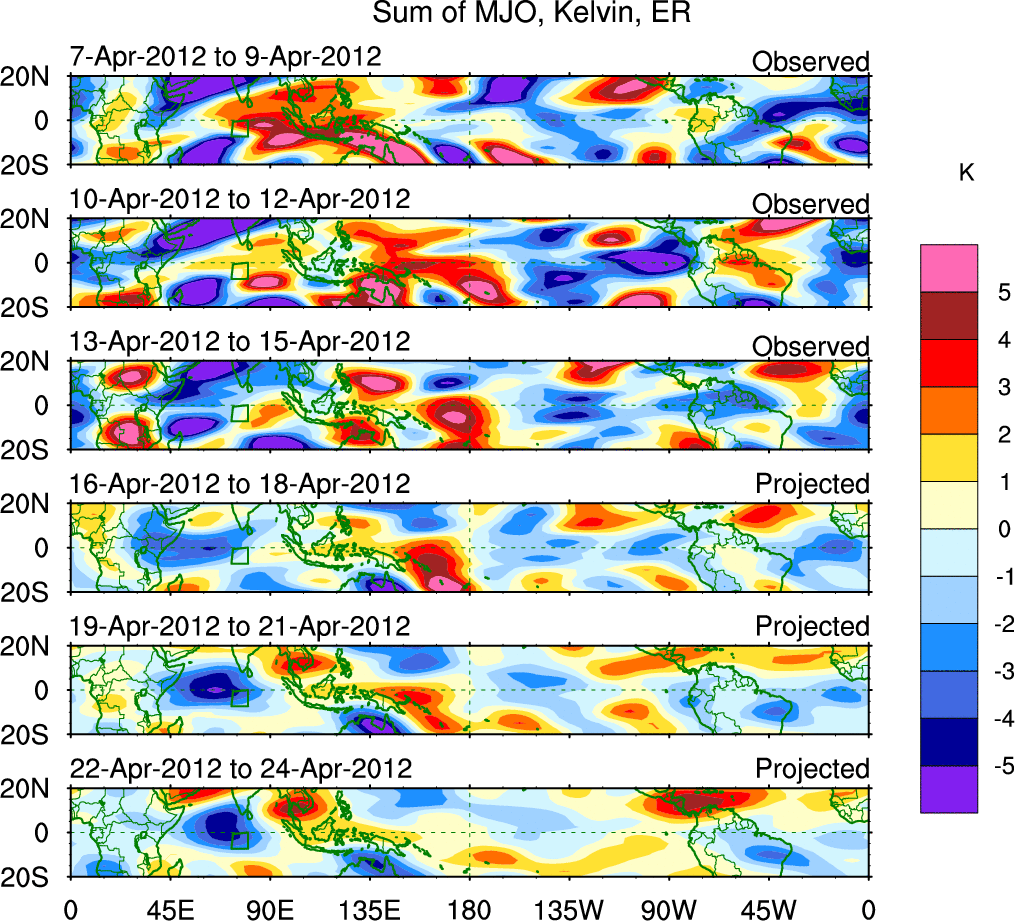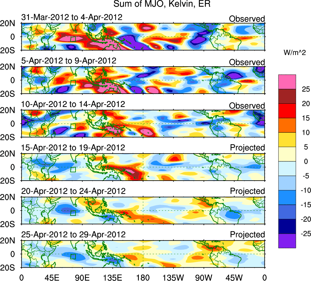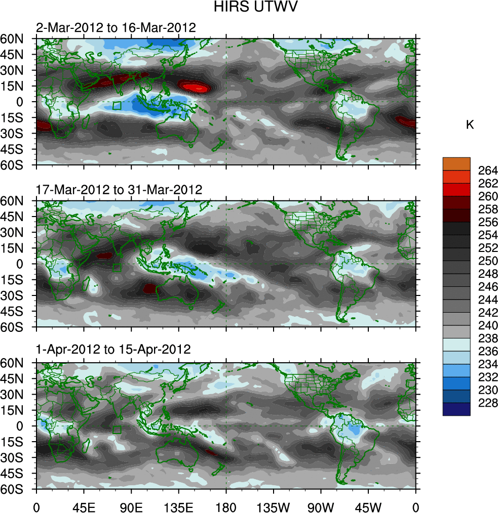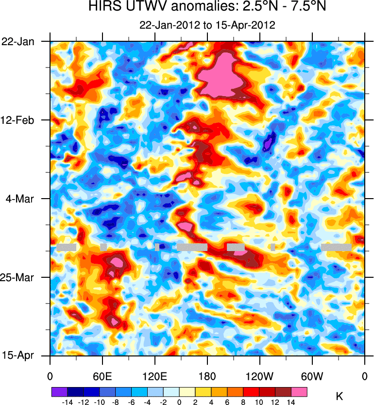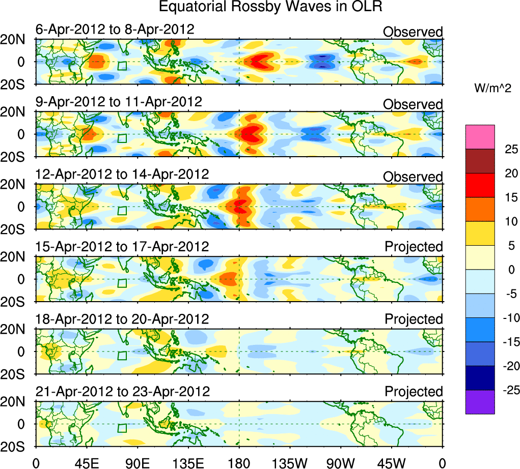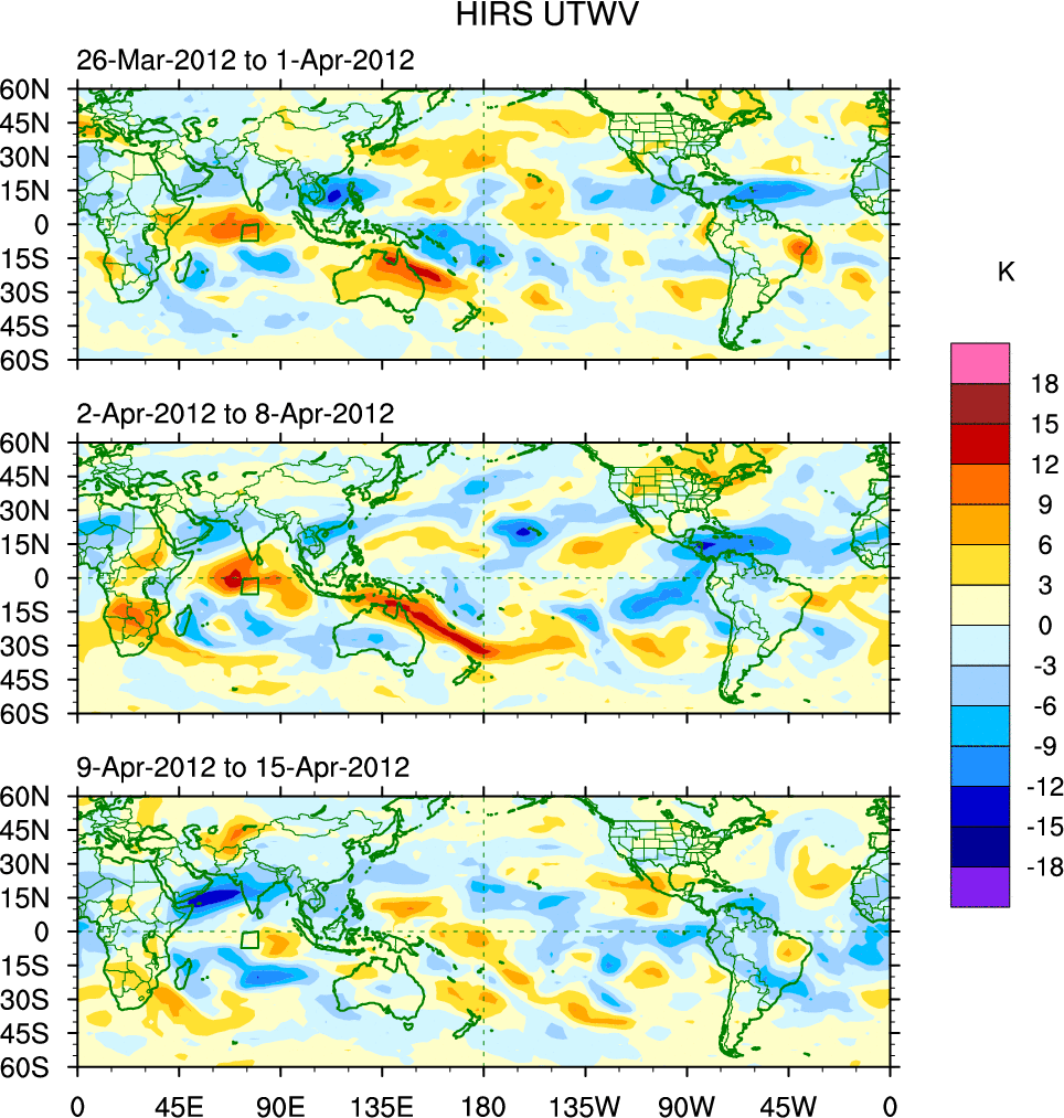 To identify tropical waves in near real-time, the OLR and UTWV data are filtered following Wheeler & Weickmann (2001 MWR). The daily anomalies are calculated using the first 3 harmonics of the seasonal cycle for 1979–2009. Missing values are then filled using linear interpolation in space and time. The most recent 365 days of anomalies are padded with 659 days of zeroes, and the result is filtered for each wave type.