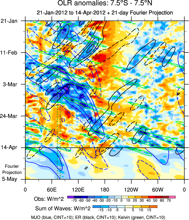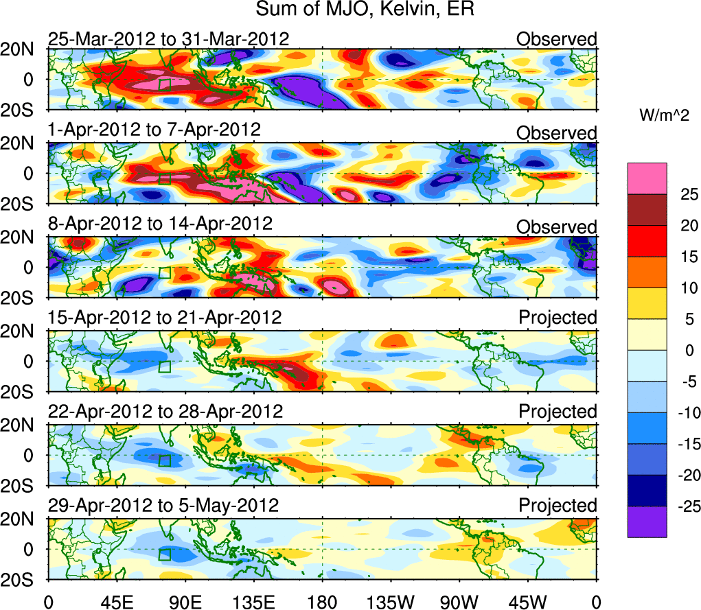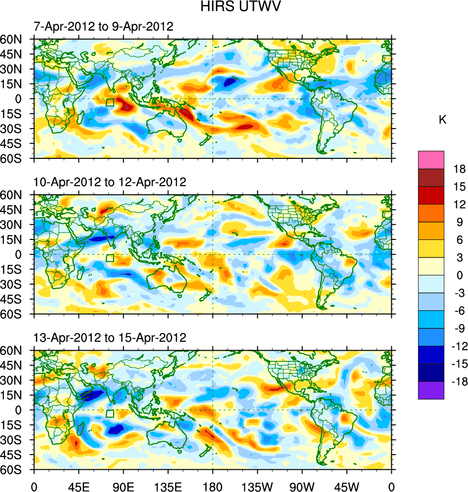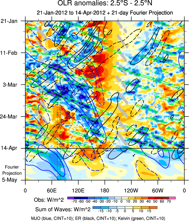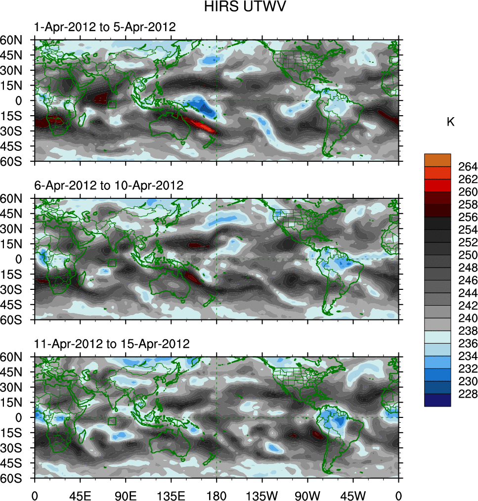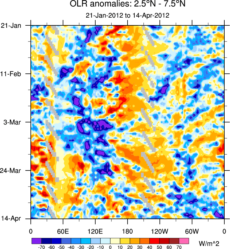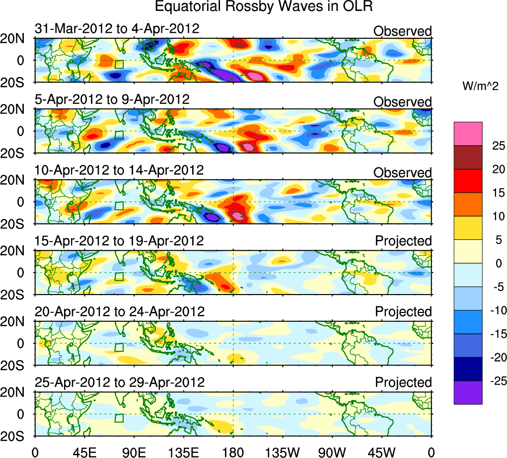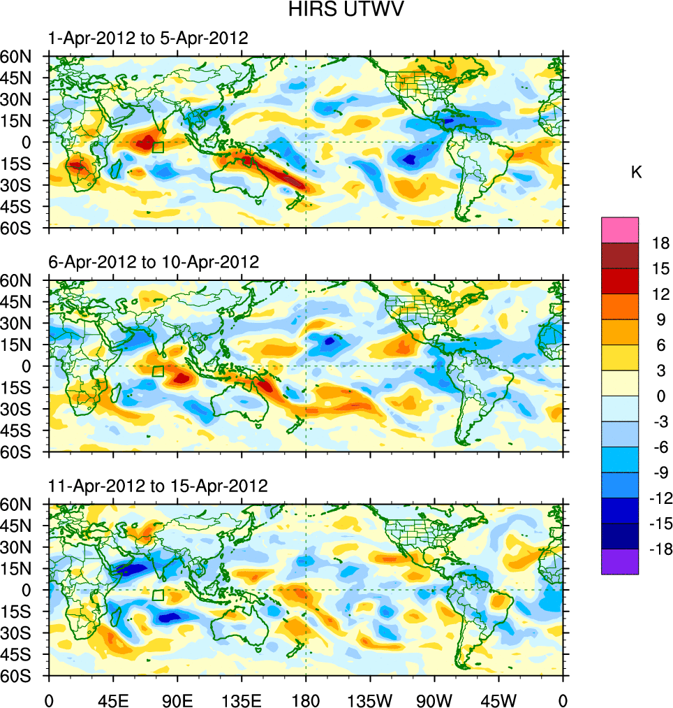 To identify tropical waves in near real-time, the OLR and UTWV data are filtered following Wheeler & Weickmann (2001 MWR). The daily anomalies are calculated using the first 3 harmonics of the seasonal cycle for 1979–2009. Missing values are then filled using linear interpolation in space and time. The most recent 365 days of anomalies are padded with 659 days of zeroes, and the result is filtered for each wave type.