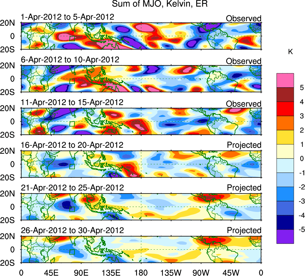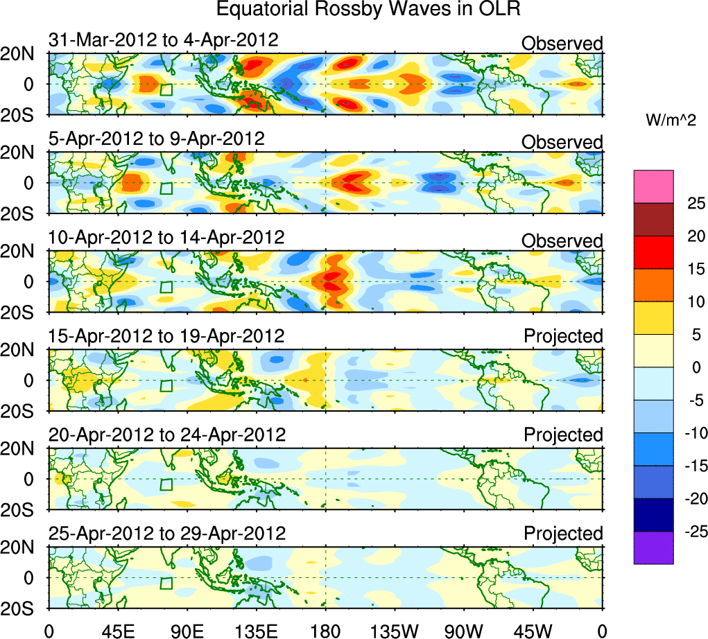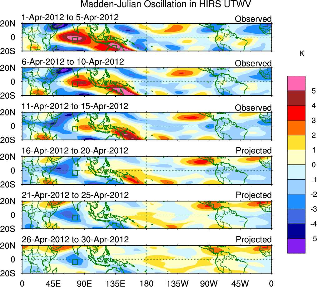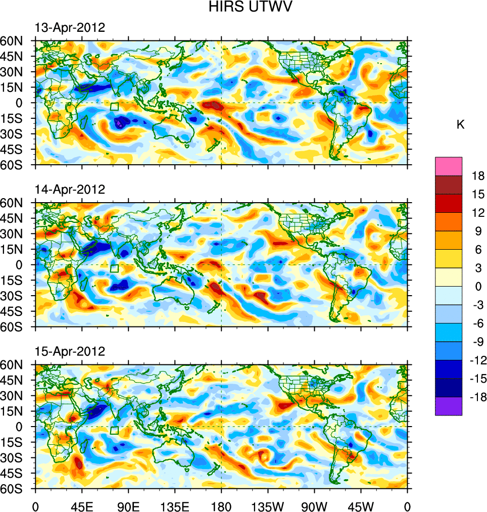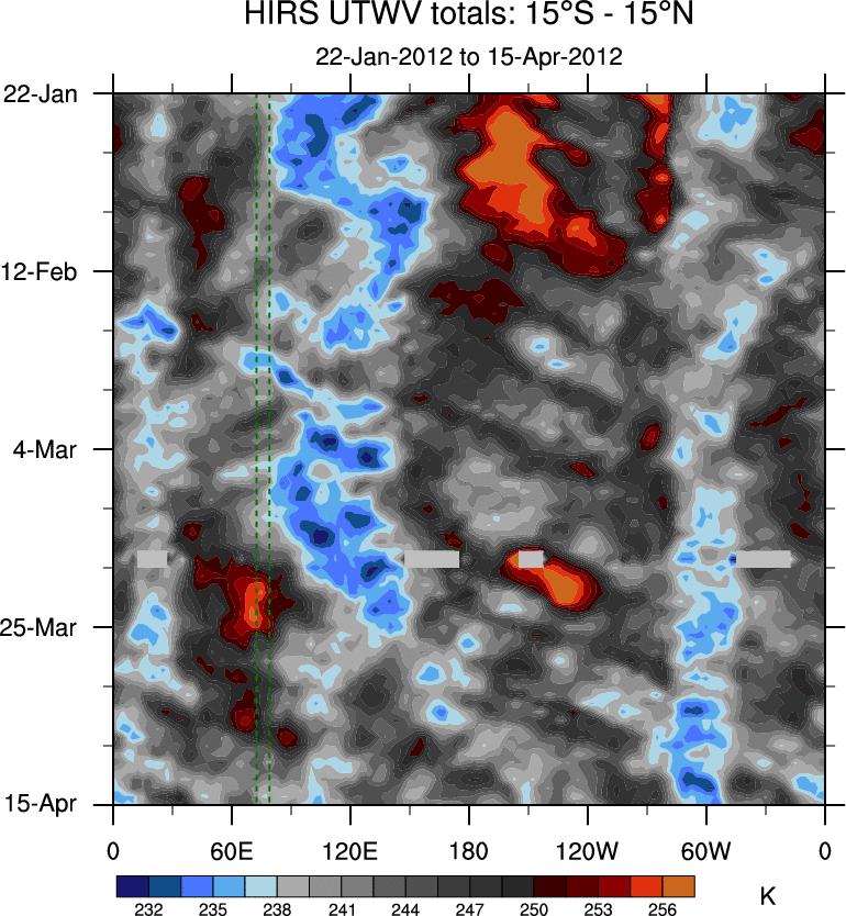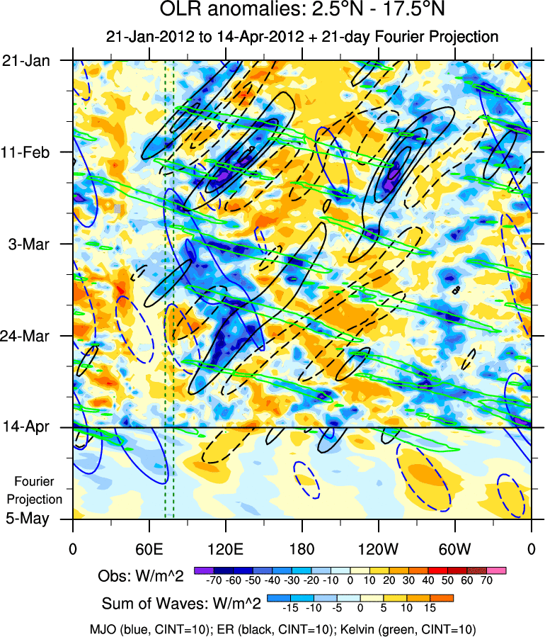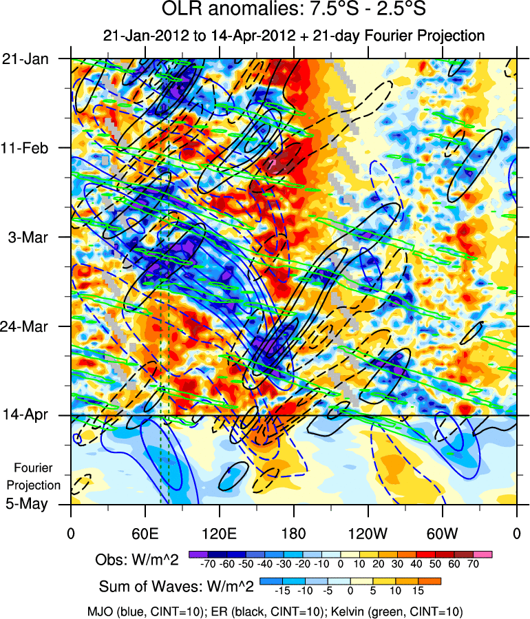 To identify tropical waves in near real-time, the OLR and UTWV data are filtered following Wheeler & Weickmann (2001 MWR). The daily anomalies are calculated using the first 3 harmonics of the seasonal cycle for 1979–2009. Missing values are then filled using linear interpolation in space and time. The most recent 365 days of anomalies are padded with 659 days of zeroes, and the result is filtered for each wave type.