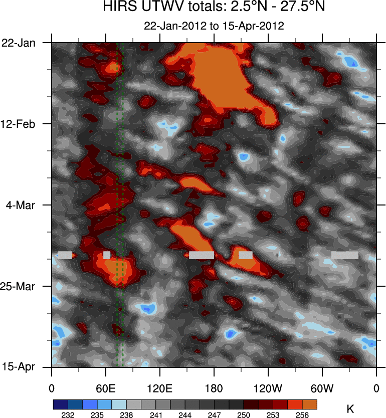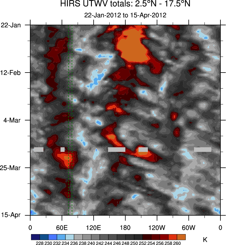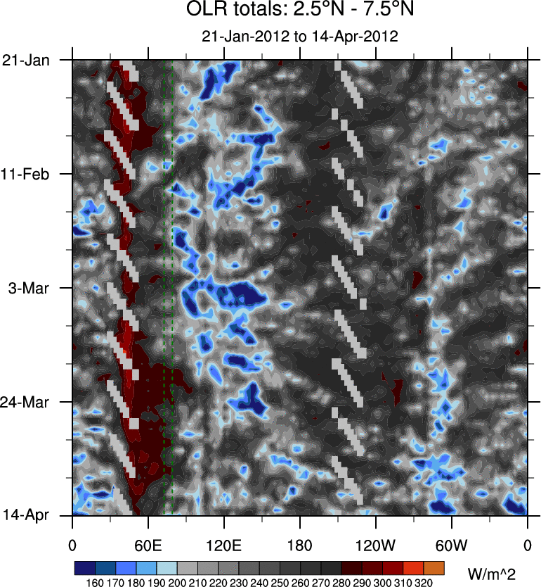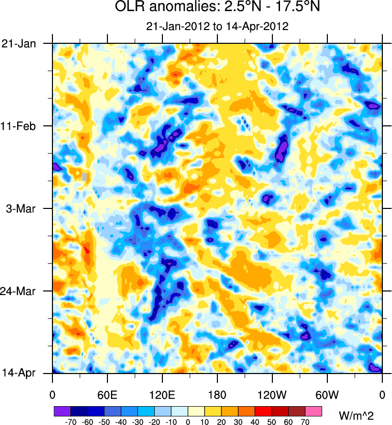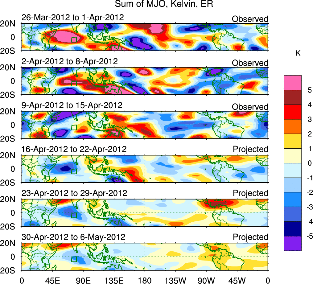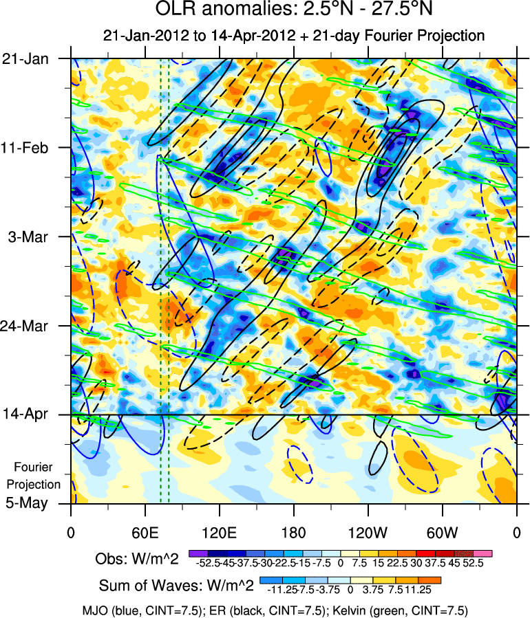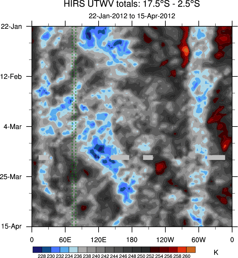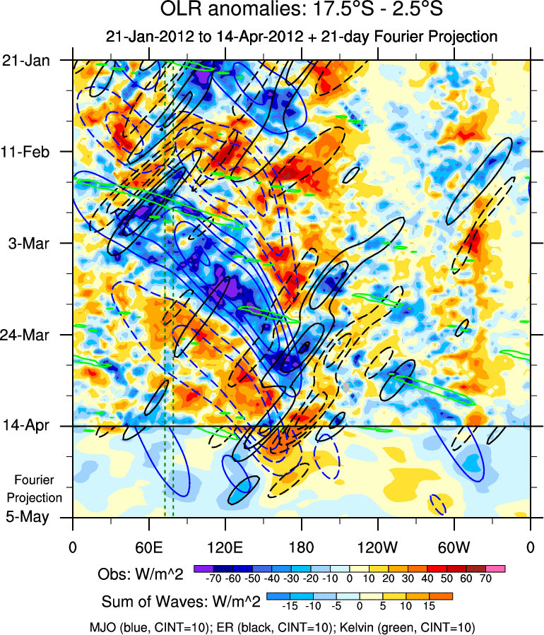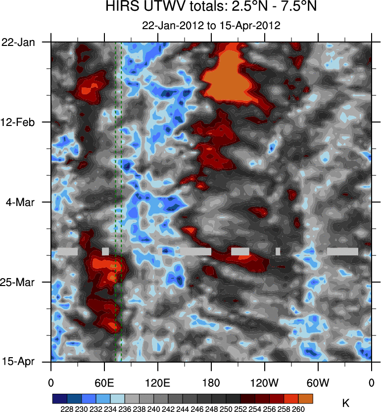 To identify tropical waves in near real-time, the OLR and UTWV data are filtered following Wheeler & Weickmann (2001 MWR). The daily anomalies are calculated using the first 3 harmonics of the seasonal cycle for 1979–2009. Missing values are then filled using linear interpolation in space and time. The most recent 365 days of anomalies are padded with 659 days of zeroes, and the result is filtered for each wave type.