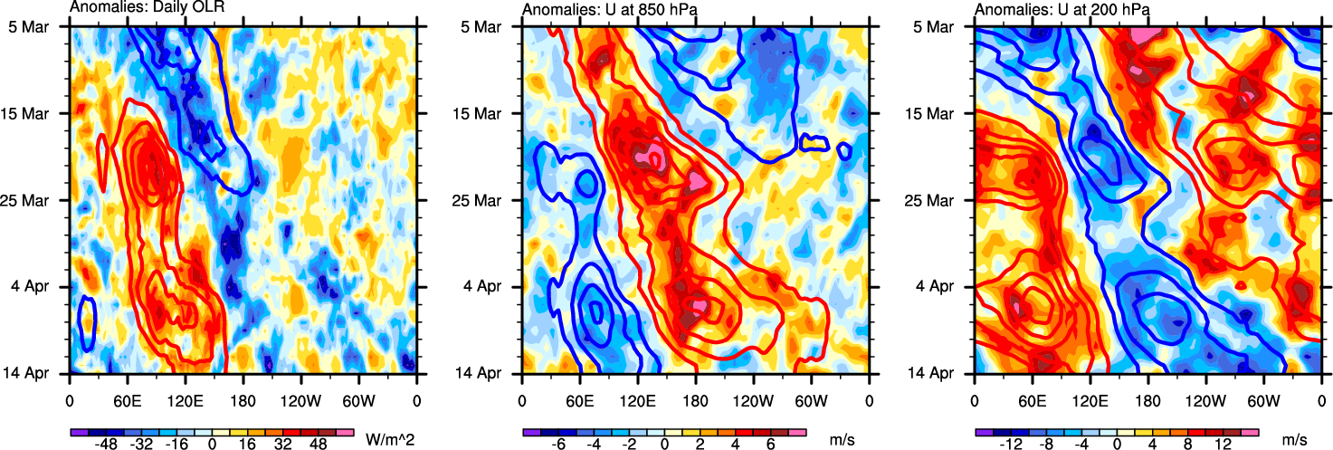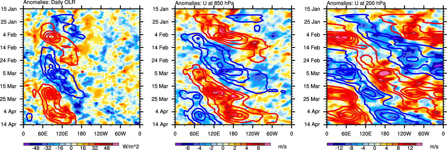 The Hovmollers show longitude-time plots for OLR, U-850, and U-200. The shading indicates the observed anomalies, while the contours are the projection of those anomalies onto the RMM EOFs.
