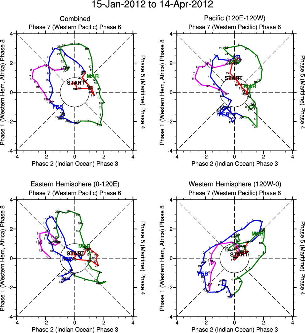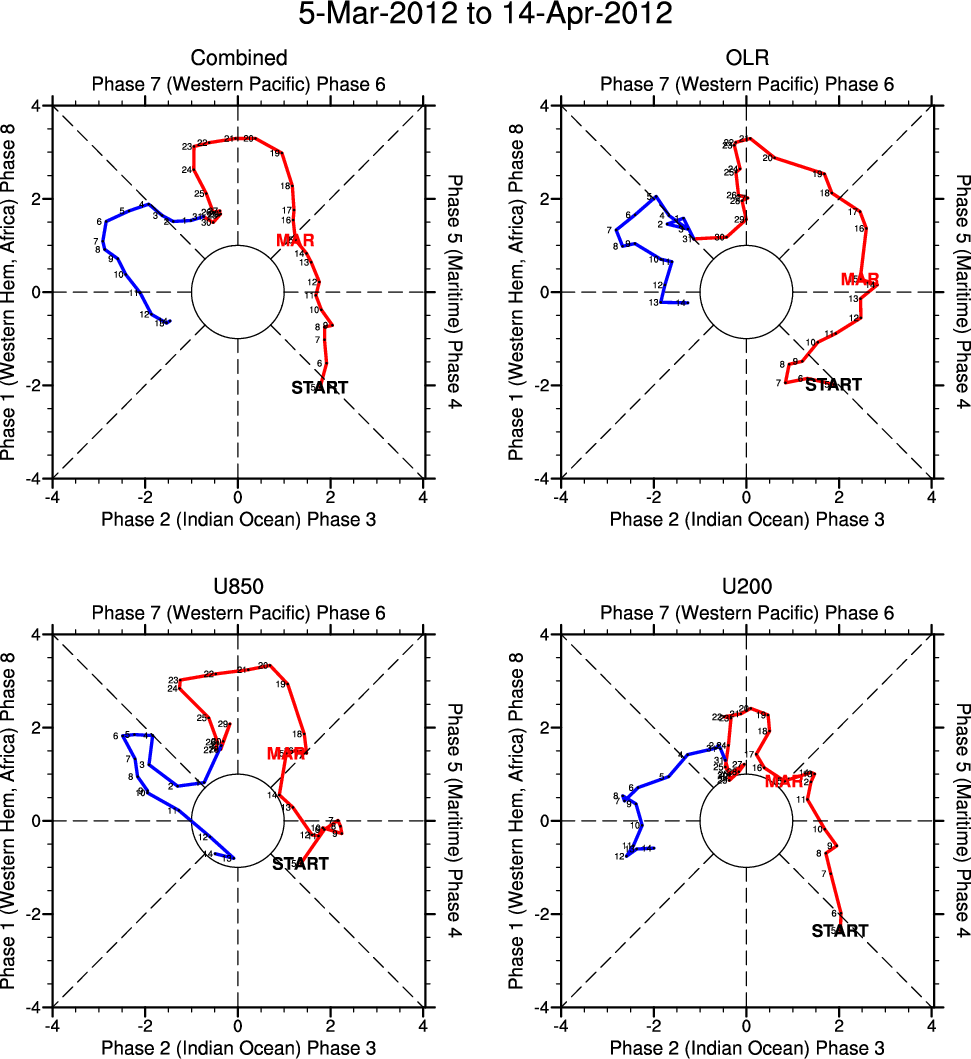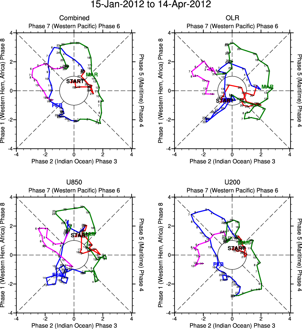 Wheeler and Hendon (2004) constructed the RMM index for monitoring the MJO. This index consists of the first two principal components (PCs) of OLR, 850-hPa zonal wind, and 200-hPa zonal wind averaged 15S-15N.