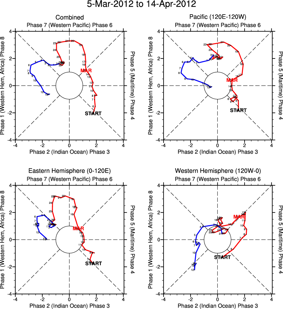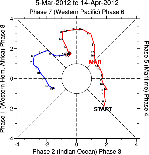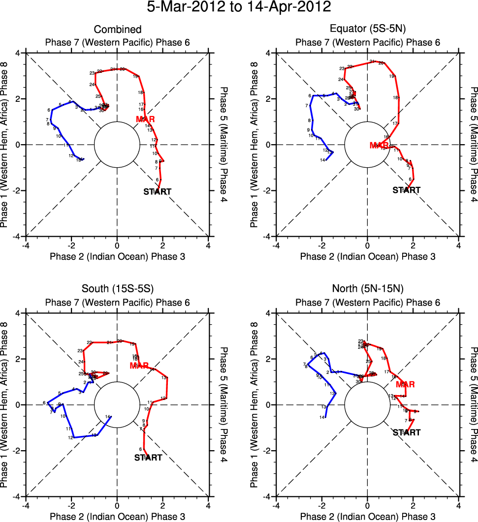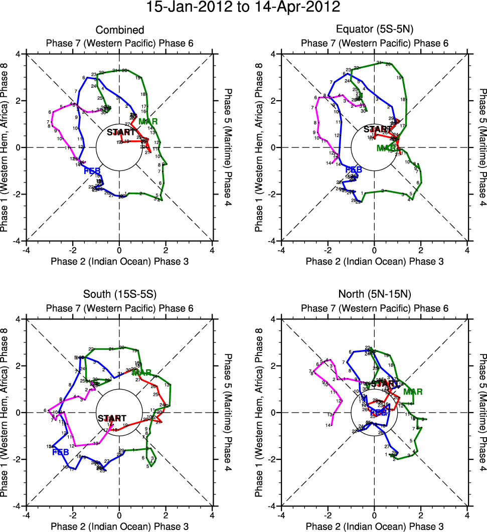 Wheeler and Hendon (2004) constructed the RMM index for monitoring the MJO. This index consists of the first two principal components (PCs) of OLR, 850-hPa zonal wind, and 200-hPa zonal wind averaged 15S-15N.