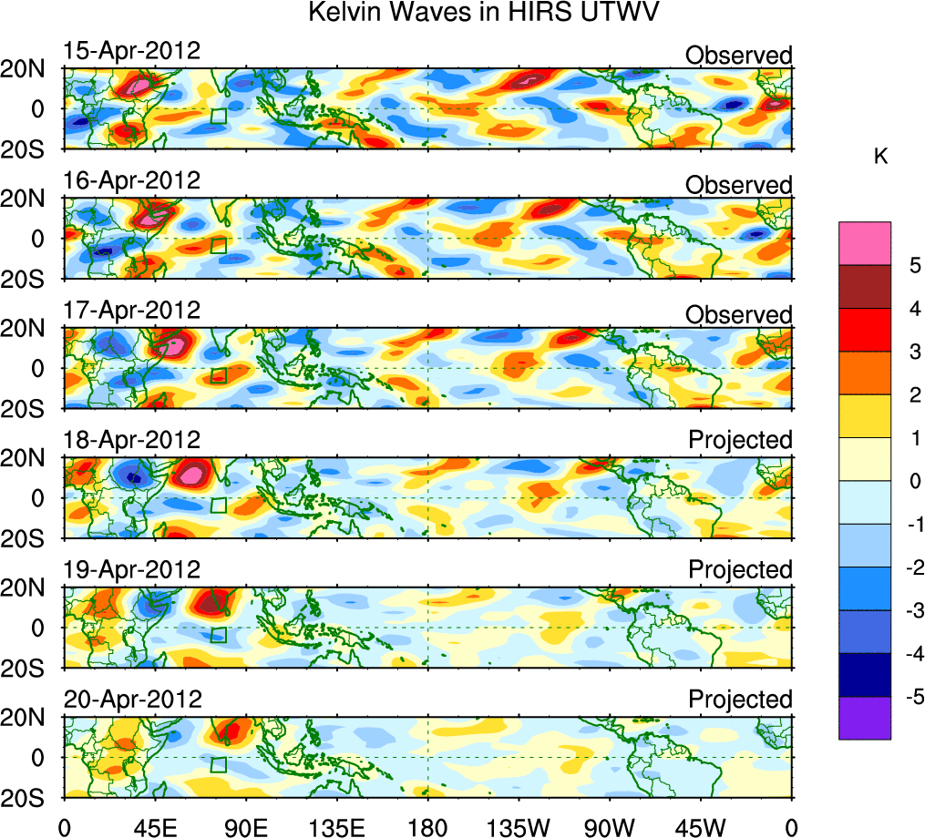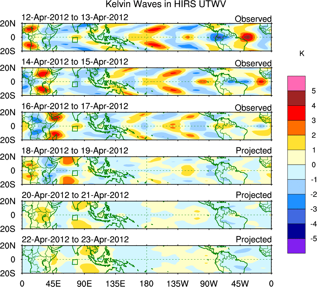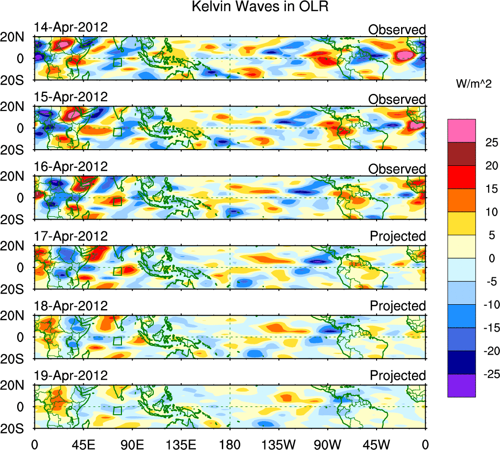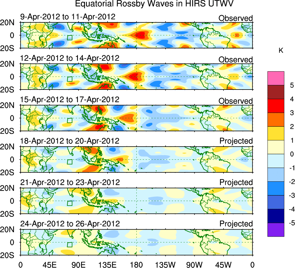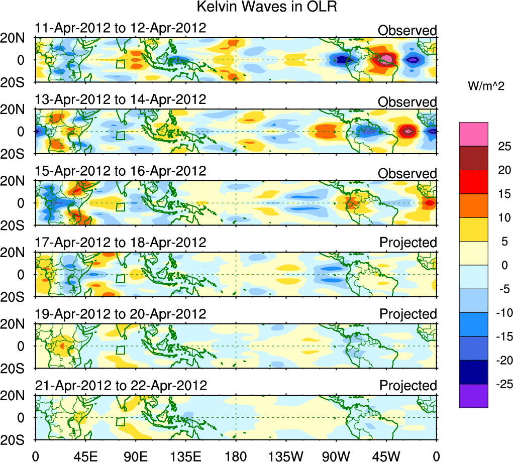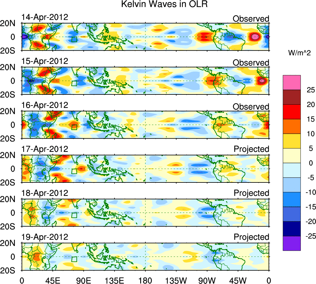 To identify tropical waves in near real-time, the OLR and UTWV data are filtered following Wheeler & Weickmann (2001 MWR). The daily anomalies are calculated using the first 3 harmonics of the seasonal cycle for 1979–2009. Missing values are then filled using linear interpolation in space and time. The most recent 365 days of anomalies are padded with 659 days of zeroes, and the result is filtered for each wave type.