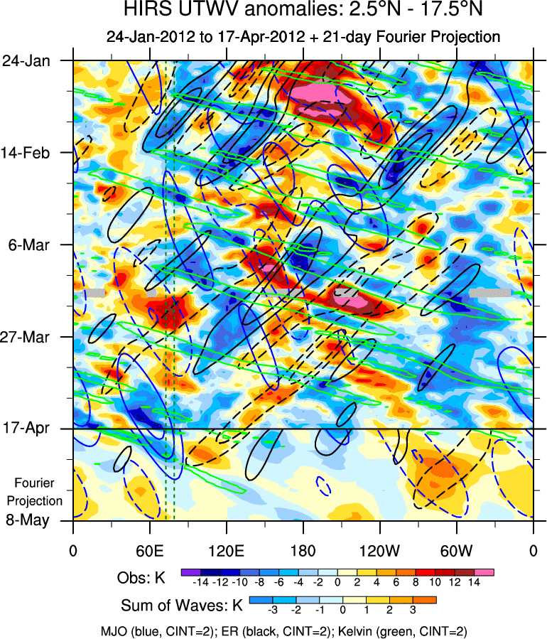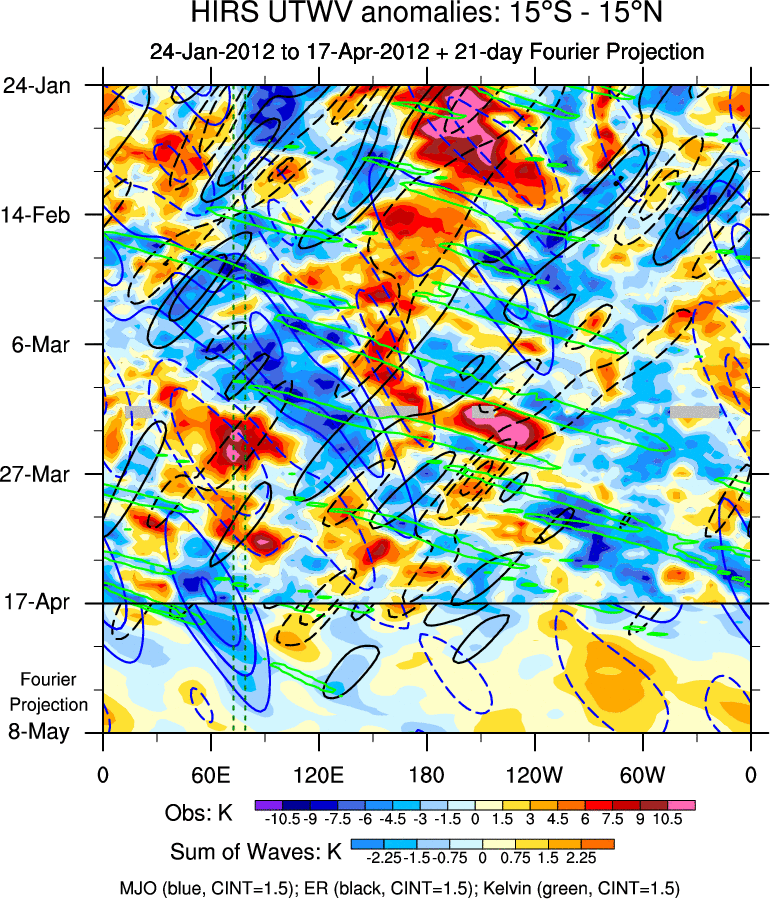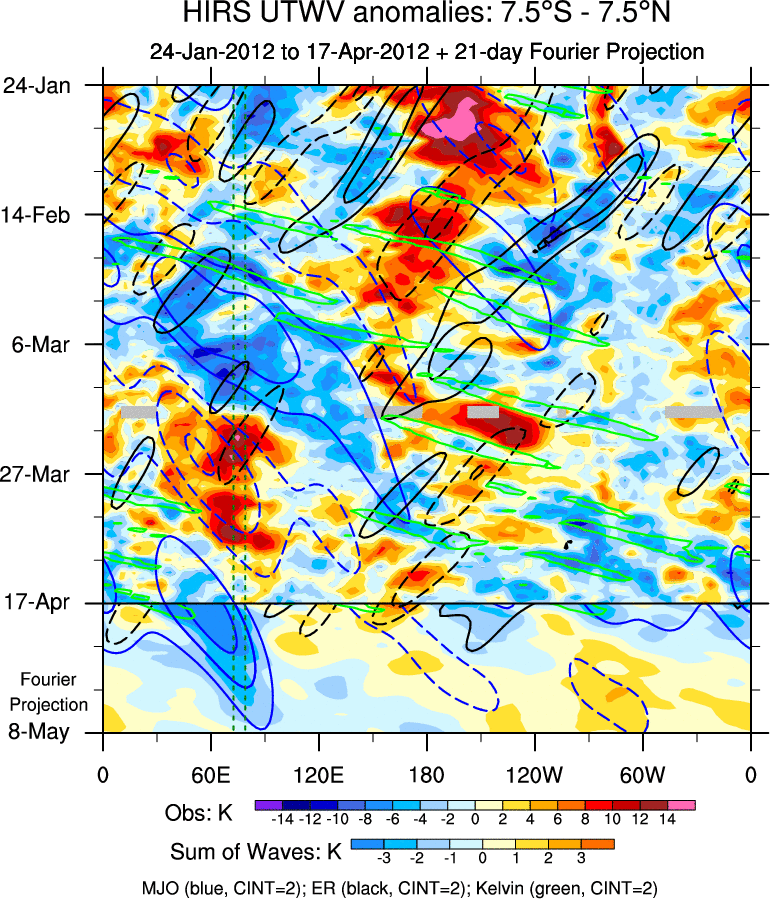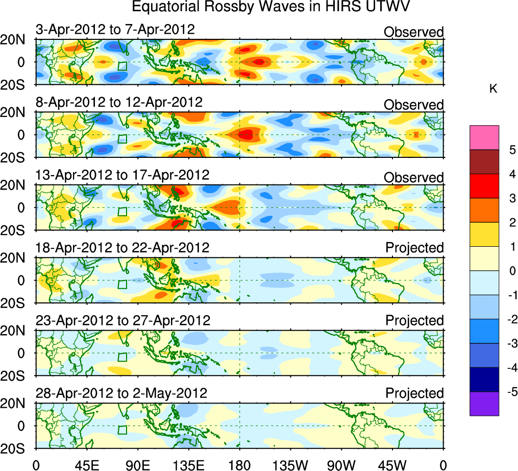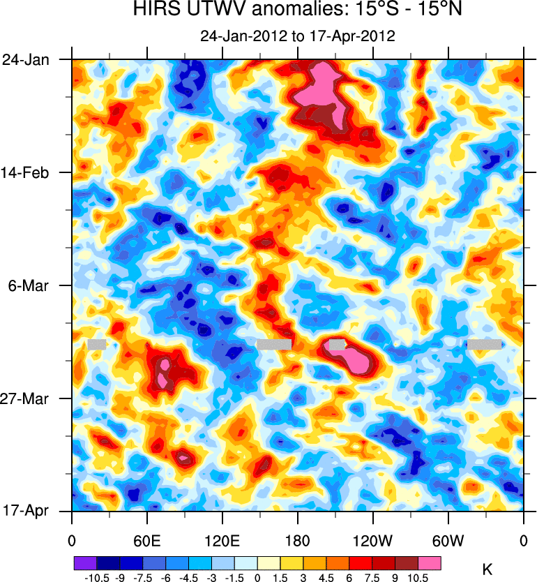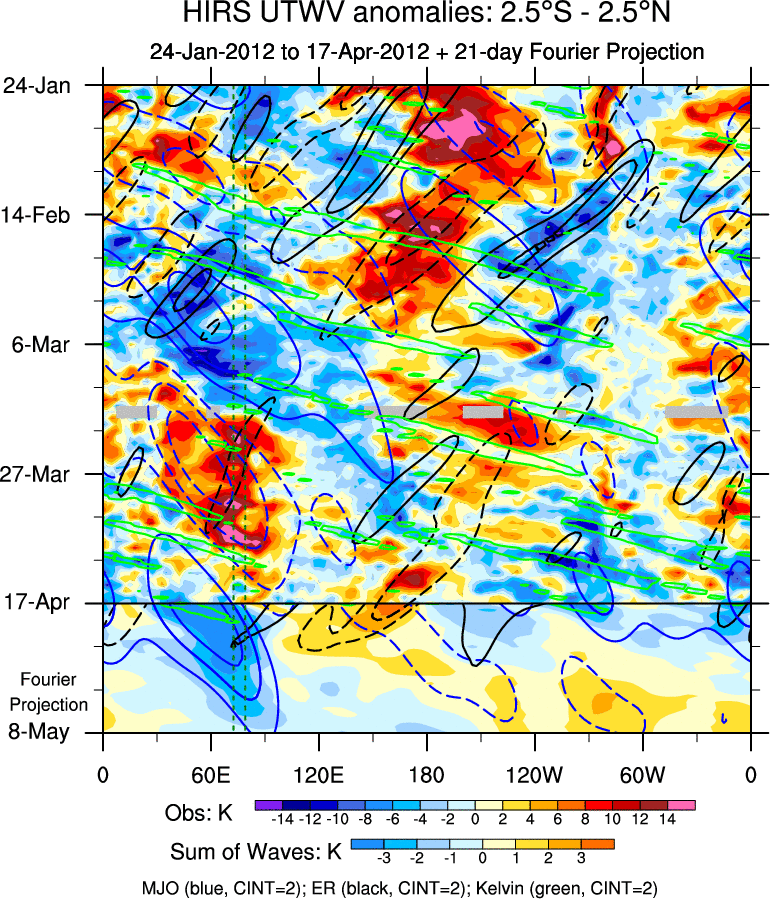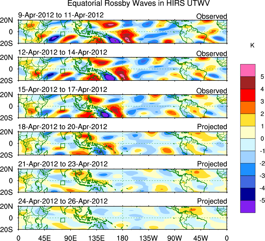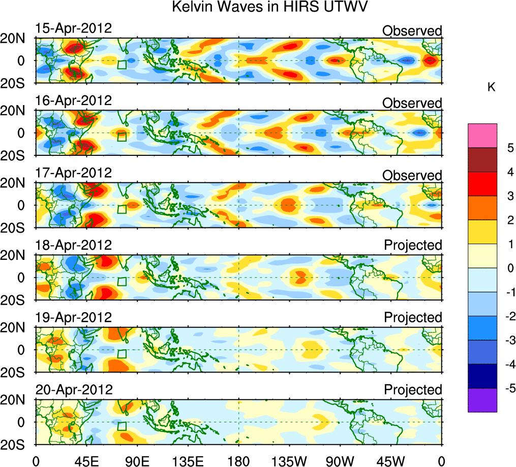 To identify tropical waves in near real-time, the OLR and UTWV data are filtered following Wheeler & Weickmann (2001 MWR). The daily anomalies are calculated using the first 3 harmonics of the seasonal cycle for 1979–2009. Missing values are then filled using linear interpolation in space and time. The most recent 365 days of anomalies are padded with 659 days of zeroes, and the result is filtered for each wave type.