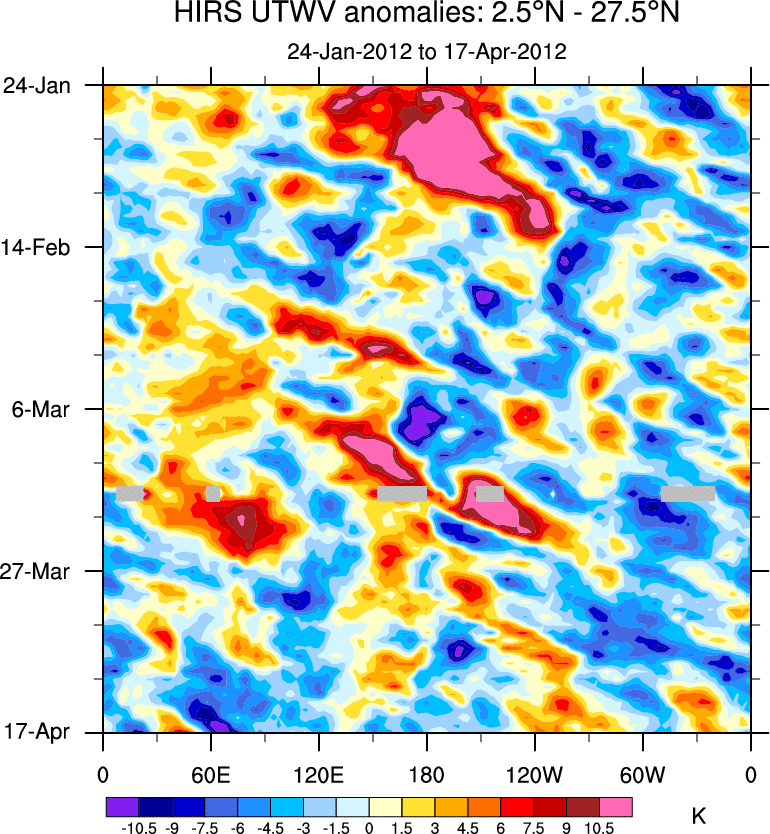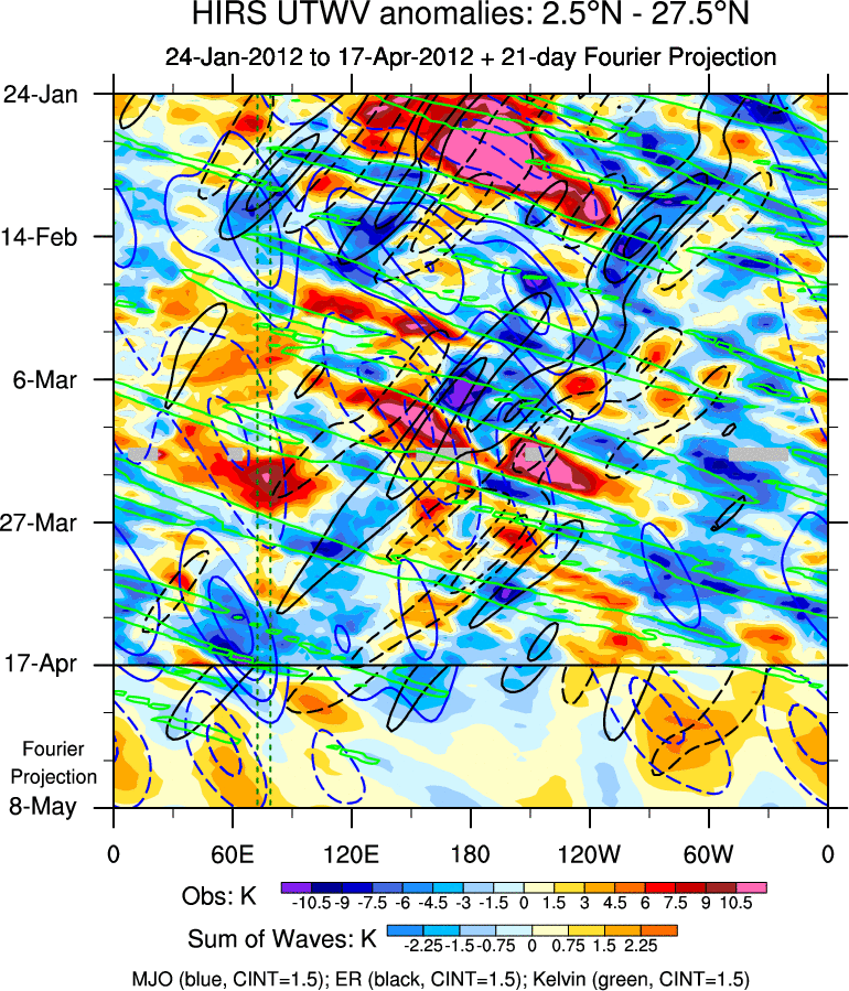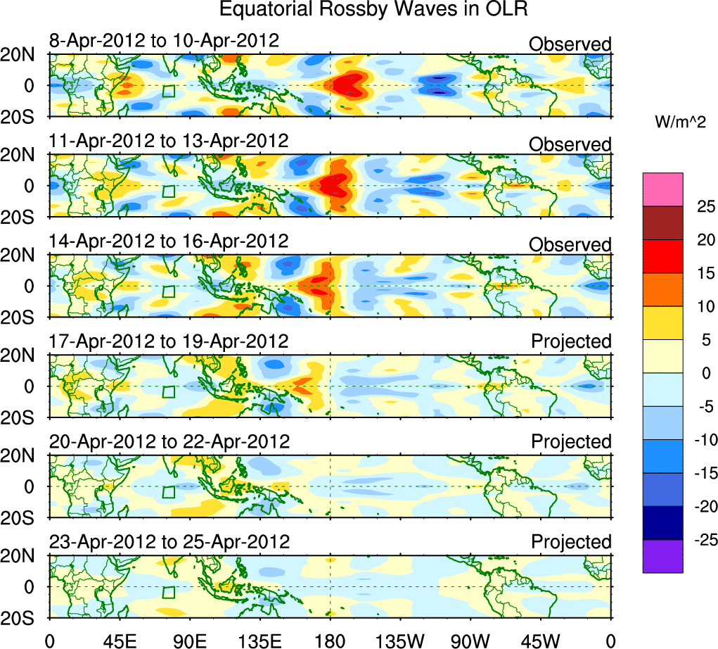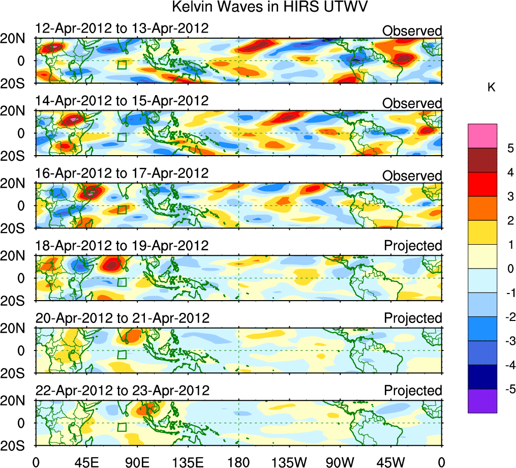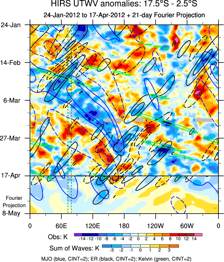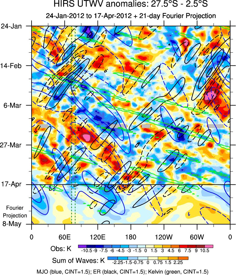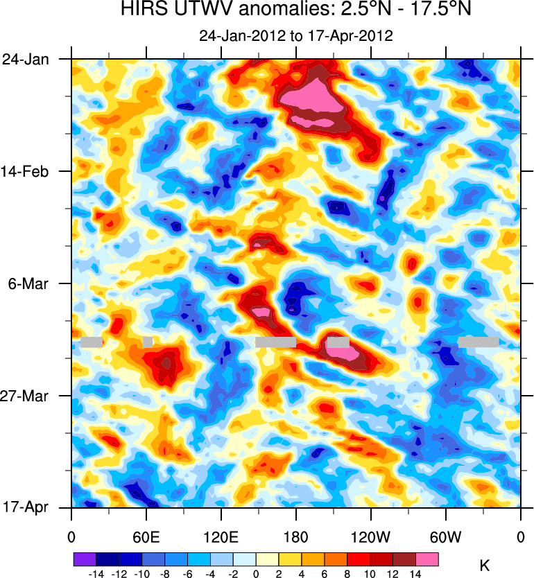 To identify tropical waves in near real-time, the OLR and UTWV data are filtered following Wheeler & Weickmann (2001 MWR). The daily anomalies are calculated using the first 3 harmonics of the seasonal cycle for 1979–2009. Missing values are then filled using linear interpolation in space and time. The most recent 365 days of anomalies are padded with 659 days of zeroes, and the result is filtered for each wave type.