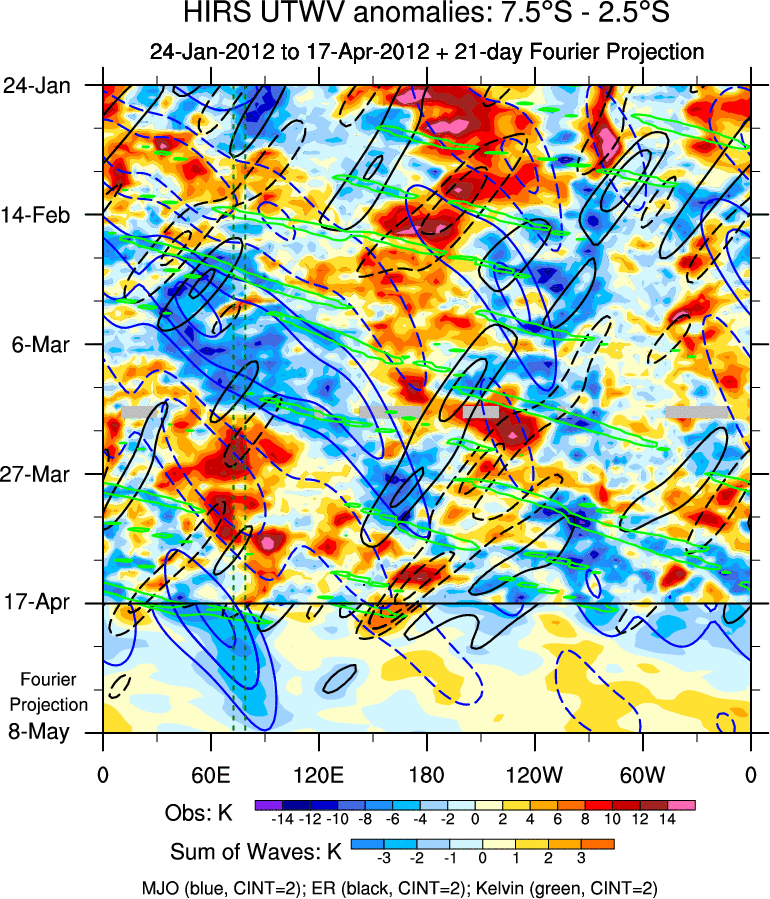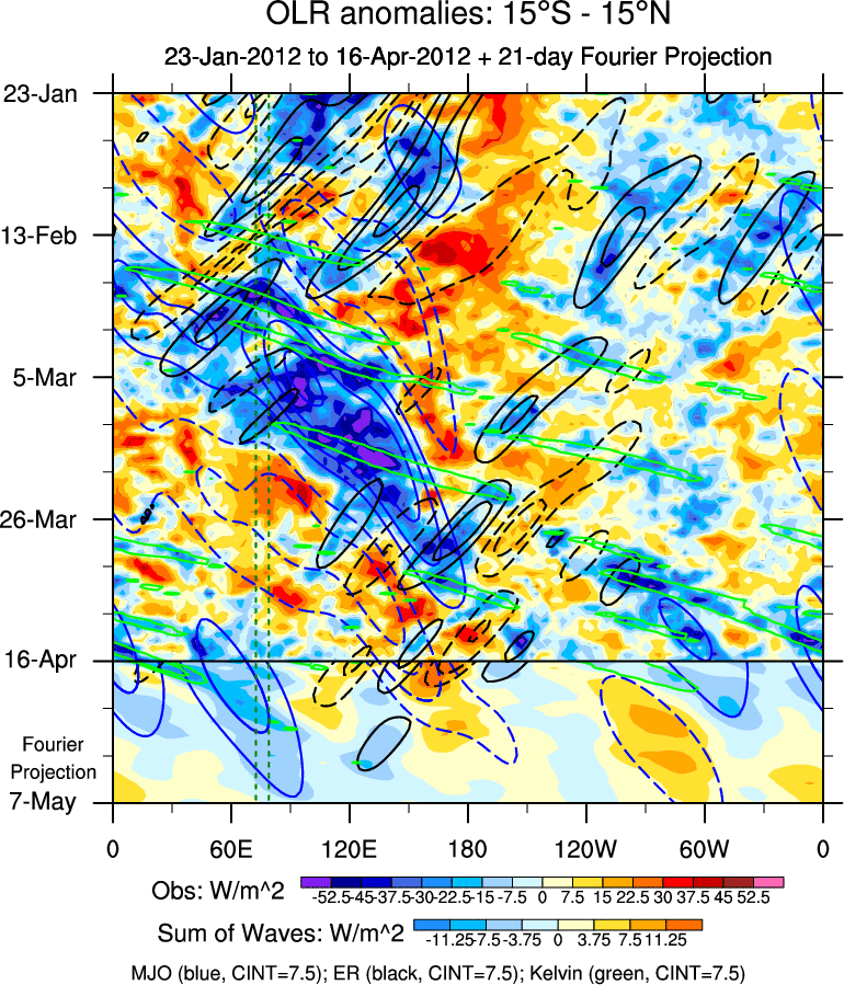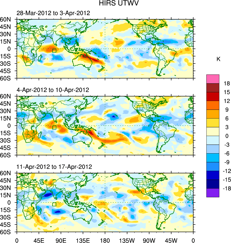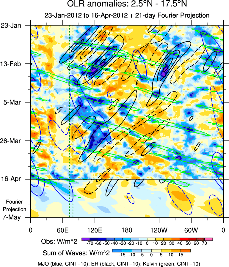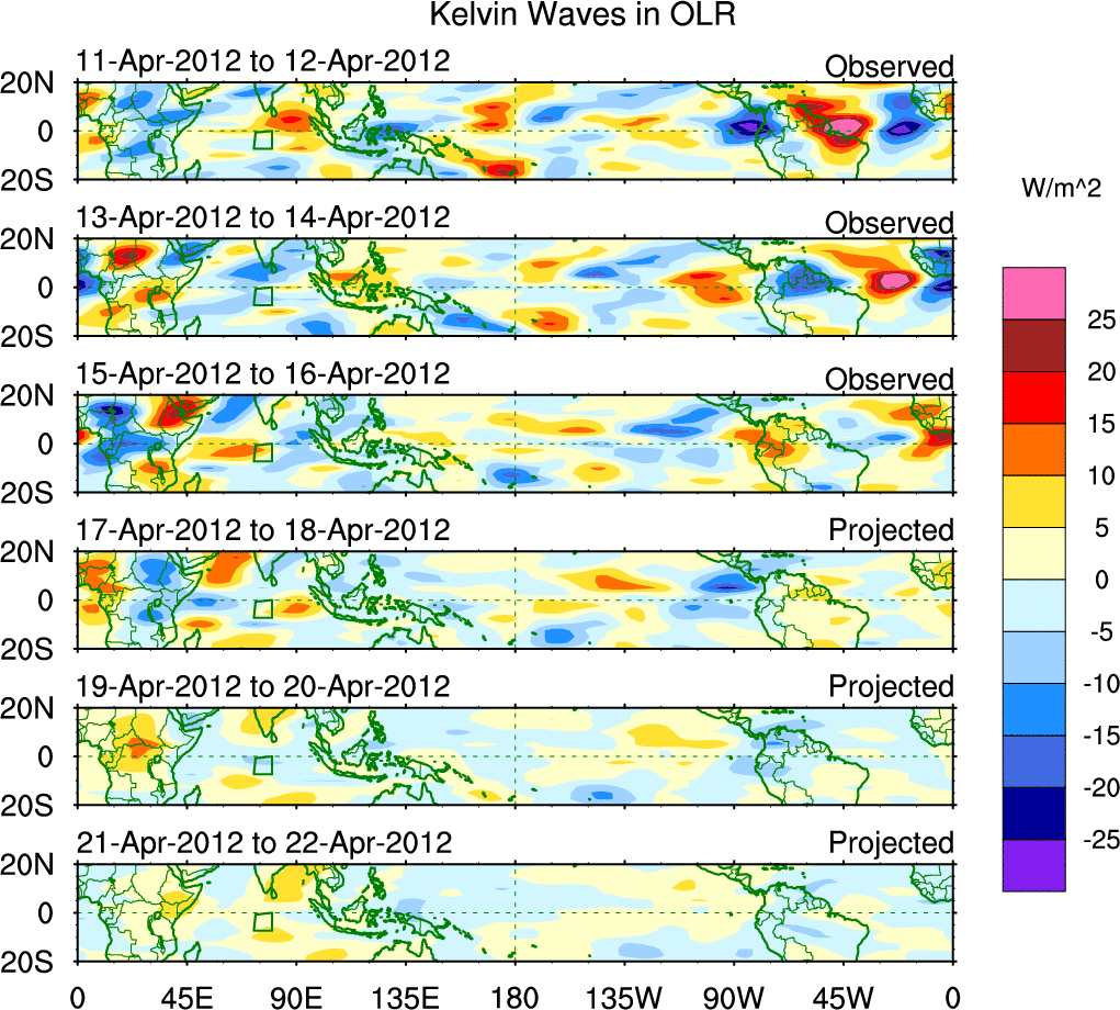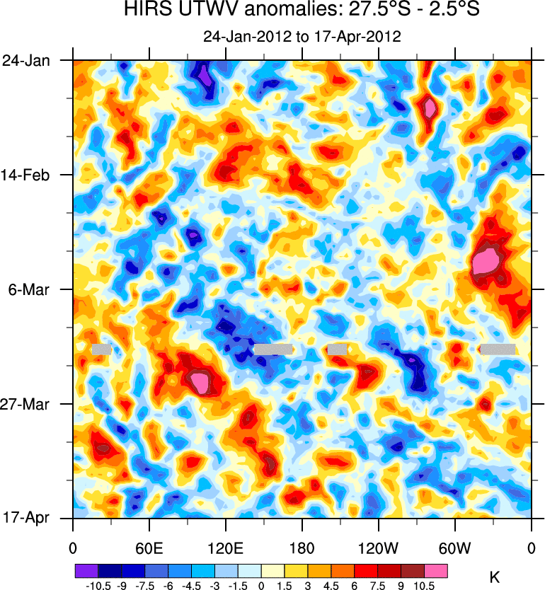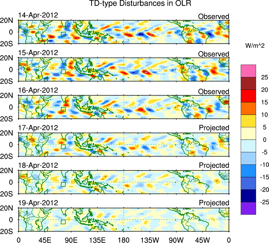To identify tropical waves in near real-time, the OLR and UTWV data are filtered following Wheeler & Weickmann (2001 MWR). The daily anomalies are calculated using the first 3 harmonics of the seasonal cycle for 1979–2009. Missing values are then filled using linear interpolation in space and time. The most recent 365 days of anomalies are padded with 659 days of zeroes, and the result is filtered for each wave type.