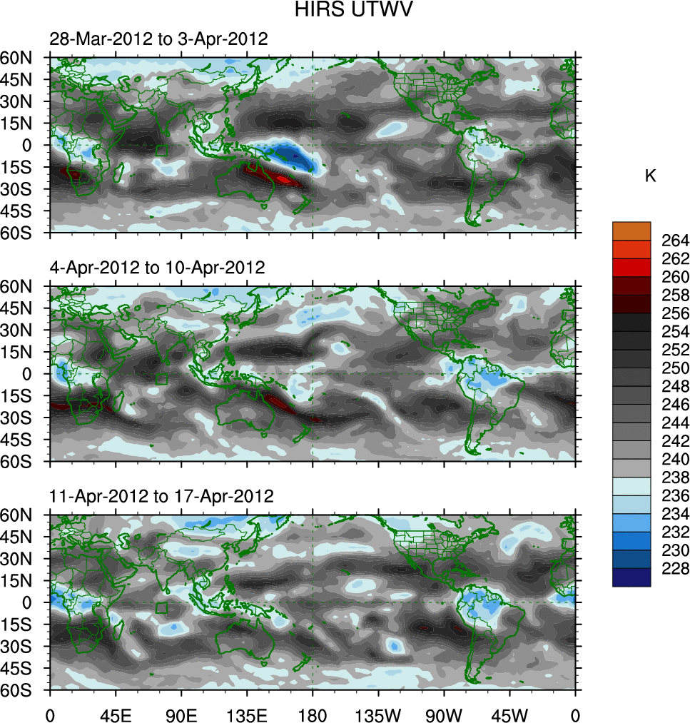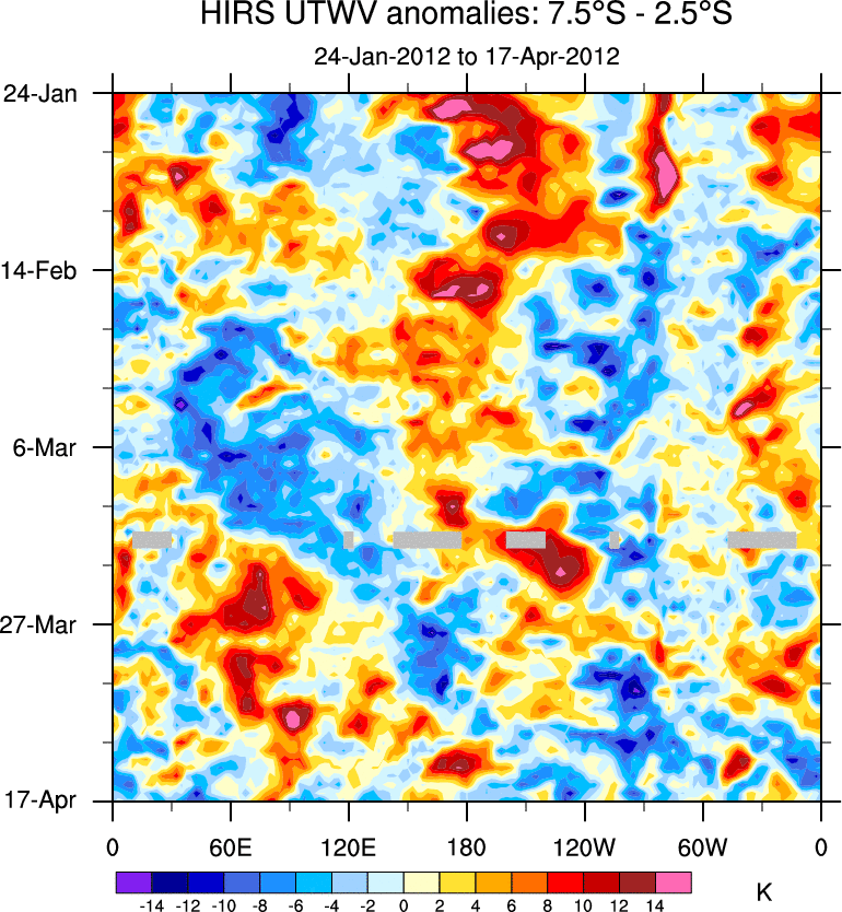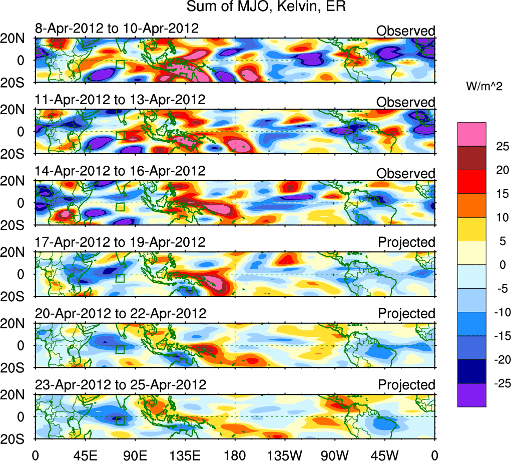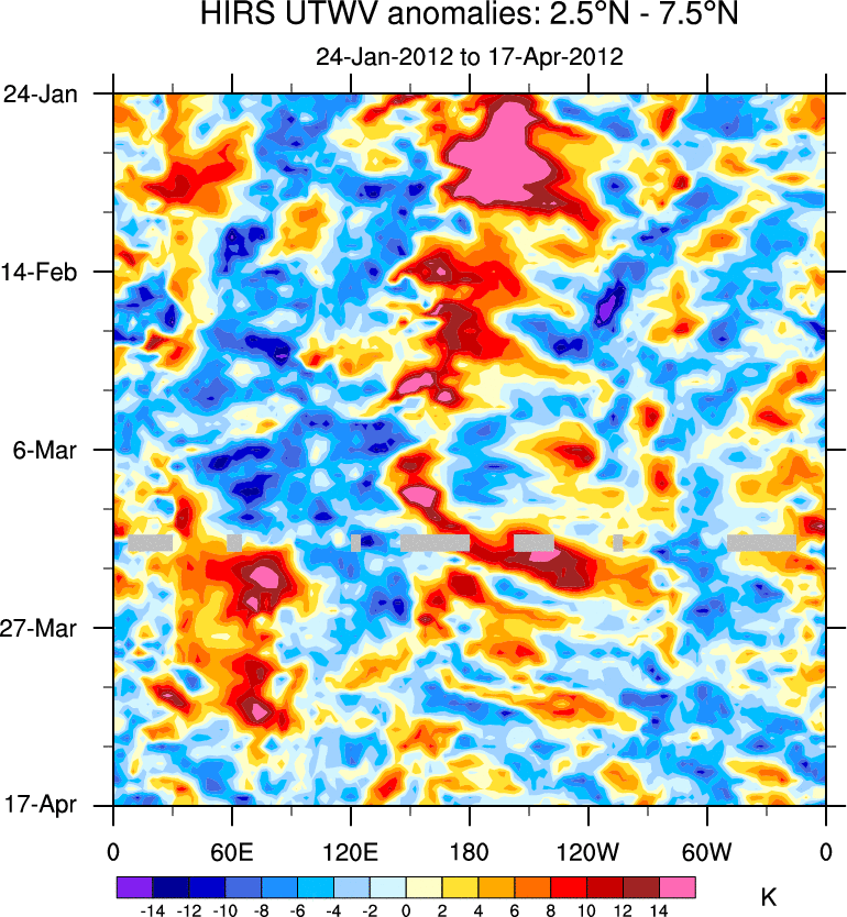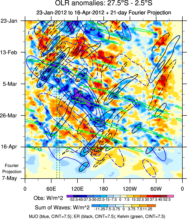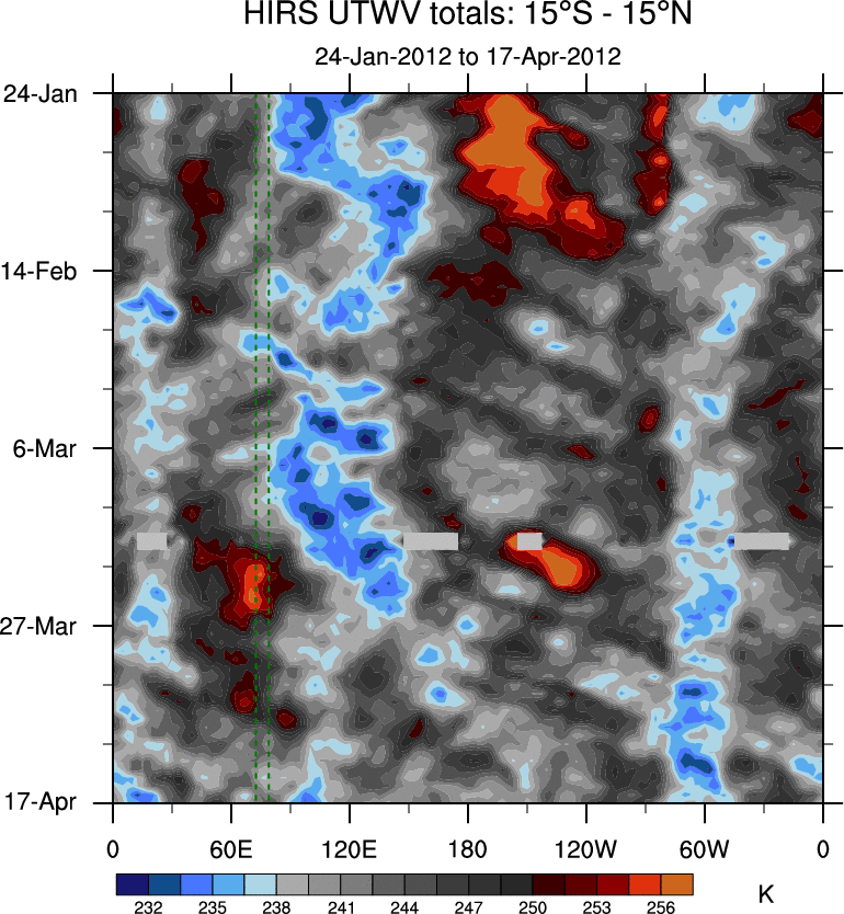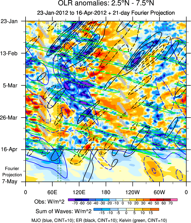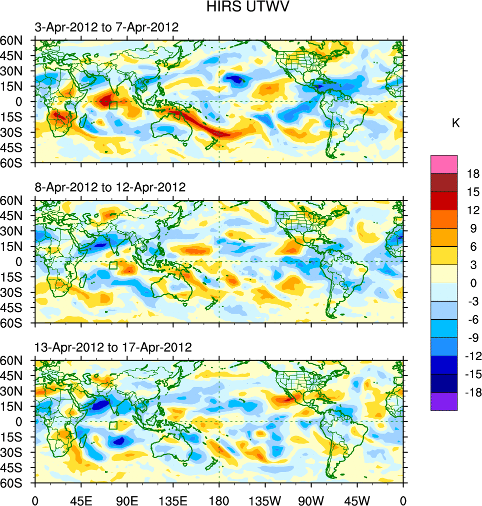 To identify tropical waves in near real-time, the OLR and UTWV data are filtered following Wheeler & Weickmann (2001 MWR). The daily anomalies are calculated using the first 3 harmonics of the seasonal cycle for 1979–2009. Missing values are then filled using linear interpolation in space and time. The most recent 365 days of anomalies are padded with 659 days of zeroes, and the result is filtered for each wave type.